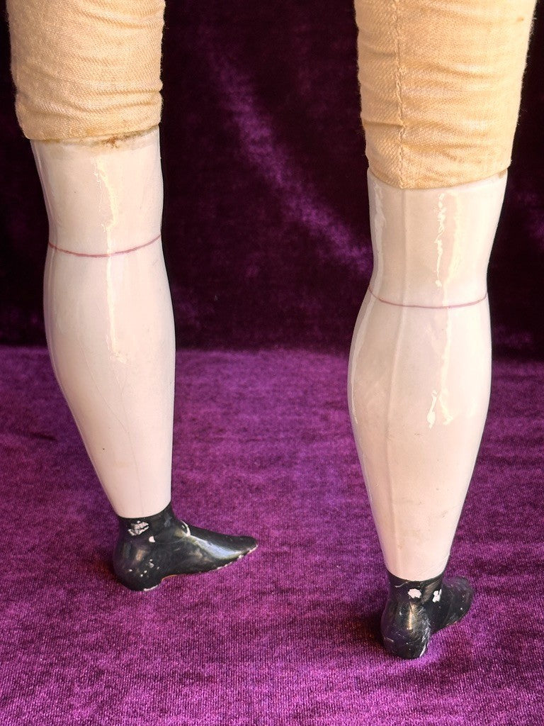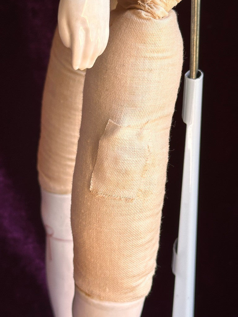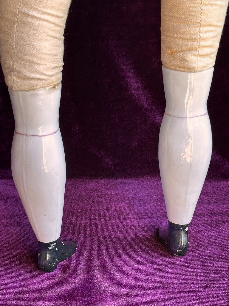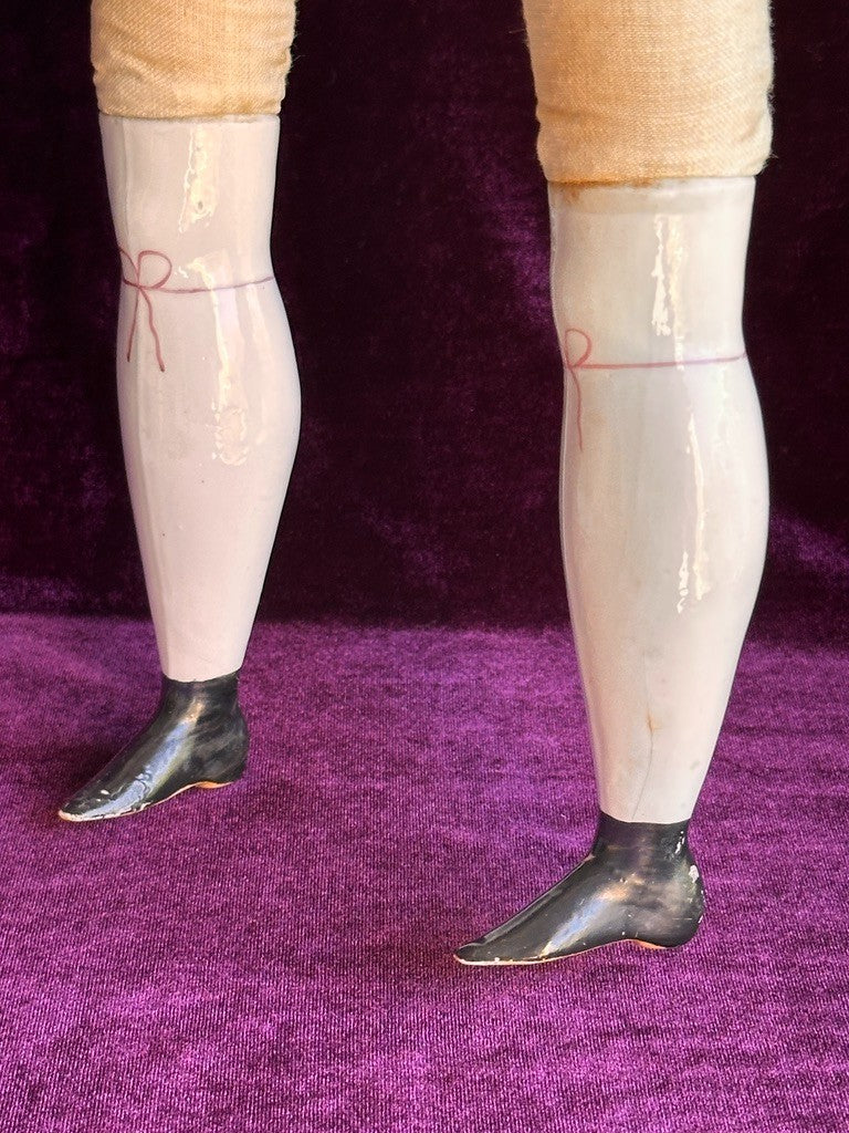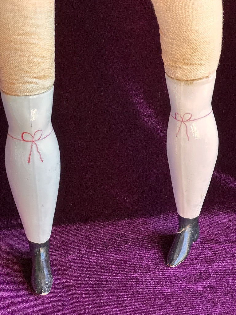 Here is a beautiful, hard-to-find china doll that is also large in size. The head of the doll has no damage, only some typical paint rubs for her age. The head, including the shoulder plate, is 6" high. The body is possibly original or an antique replacement and has some small flaws but is in overall good condition. She has beautiful, rare china lower arms. Both legs are damaged with repairs and hairlines visible. The doll is dressed as shown. Her outfit looks like a later reproduction. It is gorgeous!