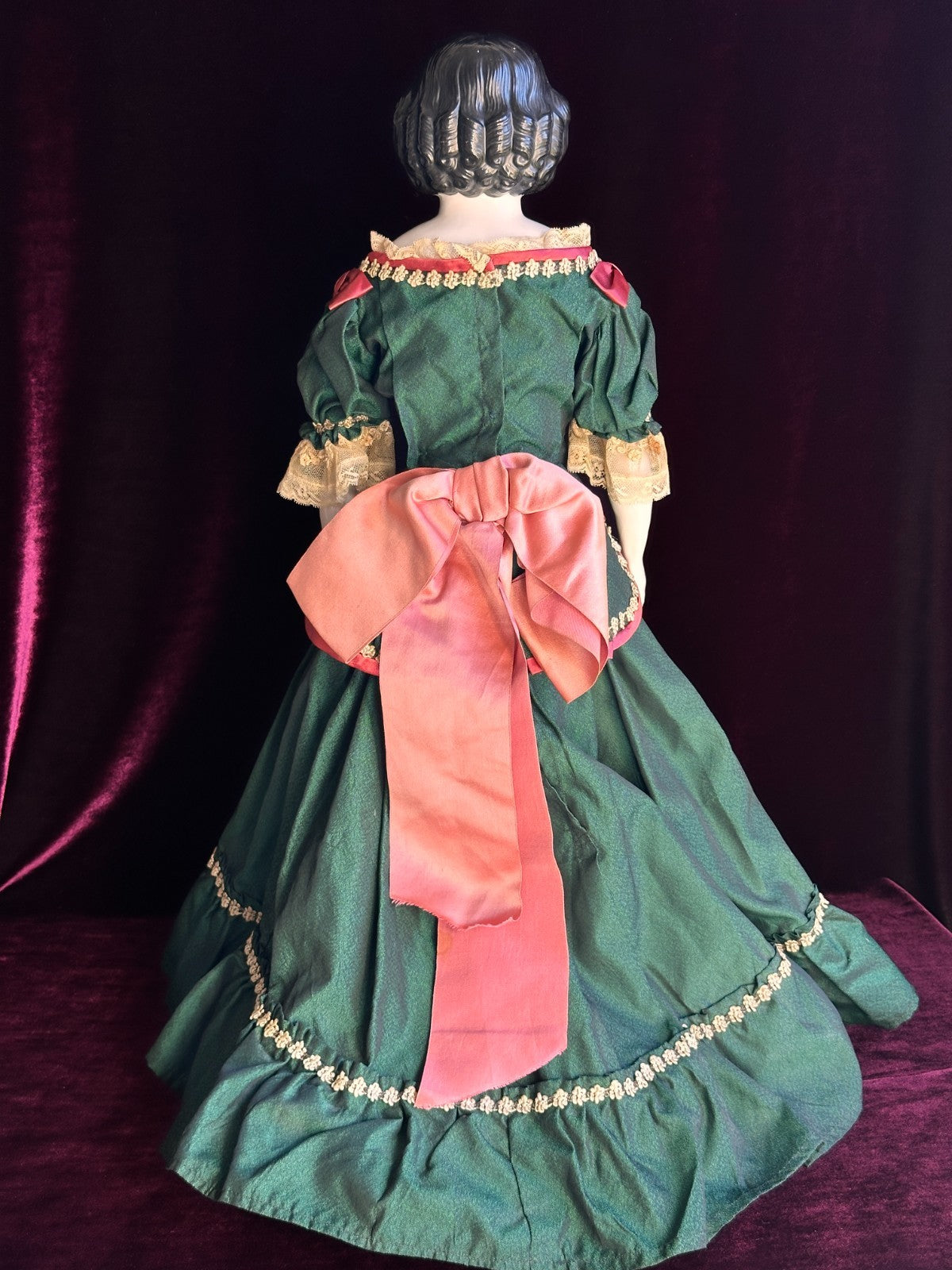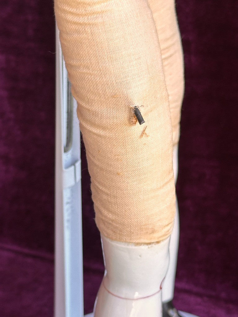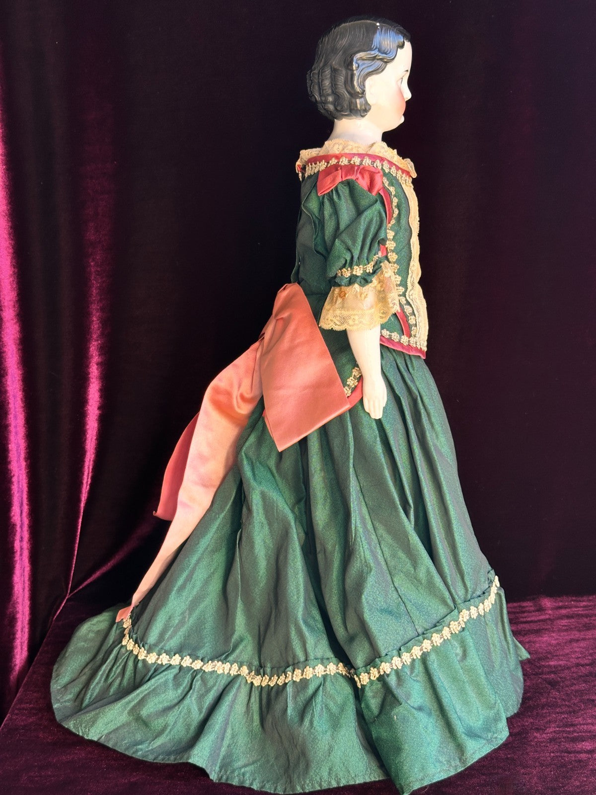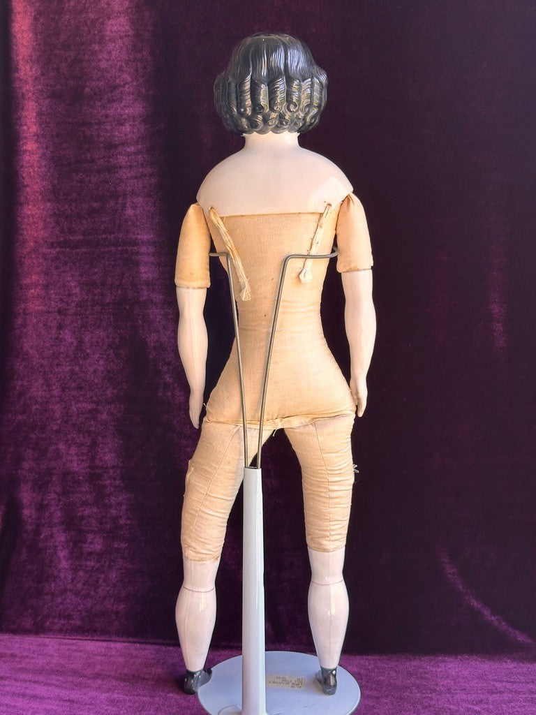 Here is a beautiful, hard-to-find china doll that is also large in size. The head of the doll has no damage, only some typical paint rubs for her age. The head, including the shoulder plate, is 6" high. The body is possibly original or an antique replacement and has some small flaws but is in overall good condition. She has beautiful, rare china lower arms. Both legs are damaged with repairs and hairlines visible. The doll is dressed as shown. Her outfit looks like a later reproduction. It is gorgeous!