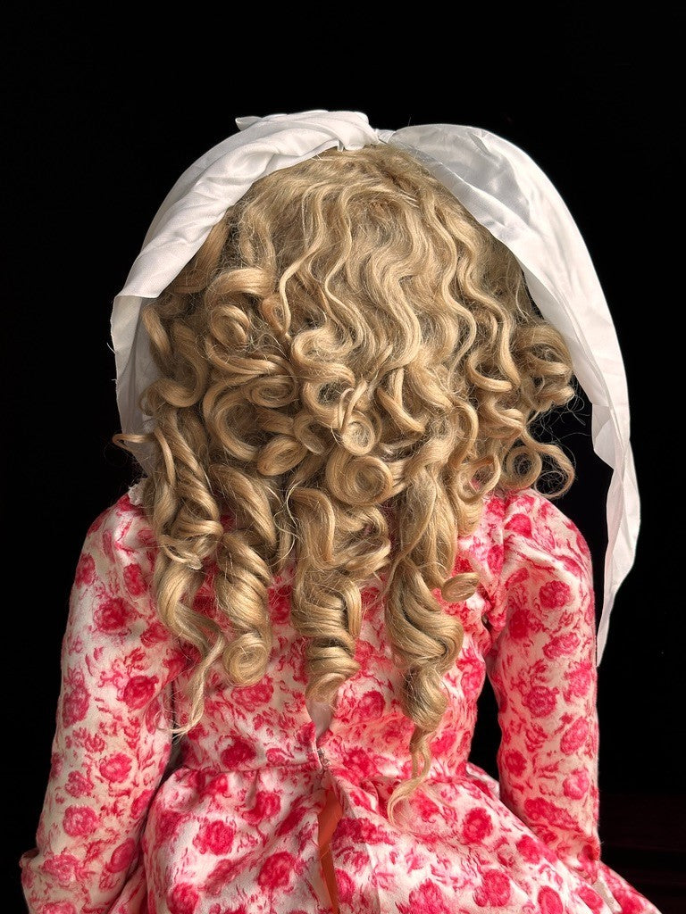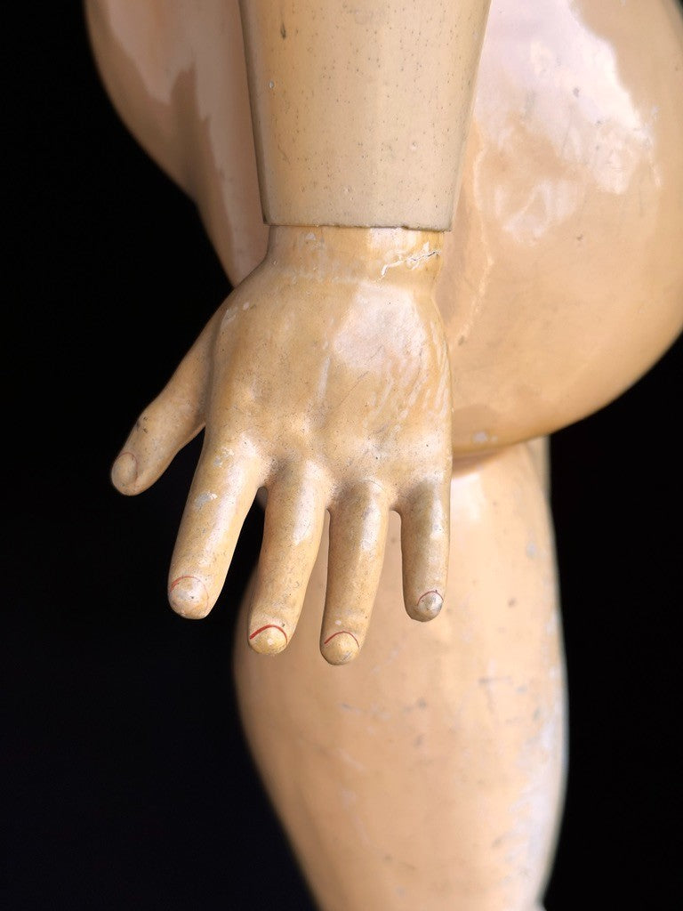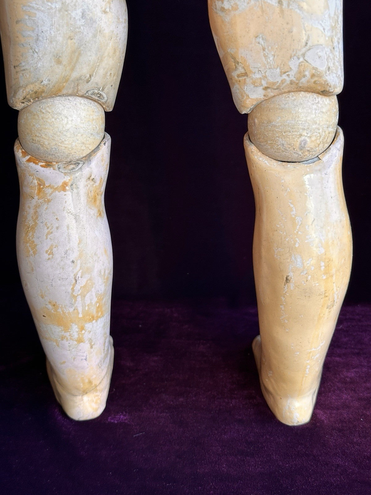 The body has original finishing and shows some signs of wear, mostly to the legs. All flaws are shown in the photos. The stringing is good but not perfectly tight. The beautiful antique wig shows some light wear. The pate is a replacement.