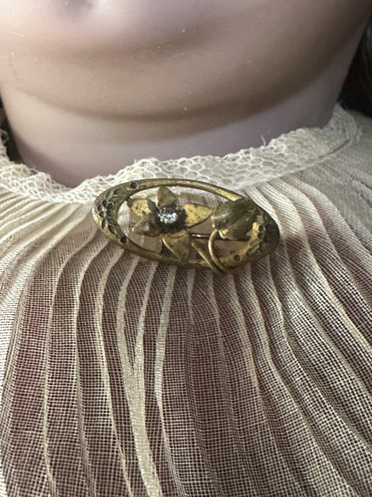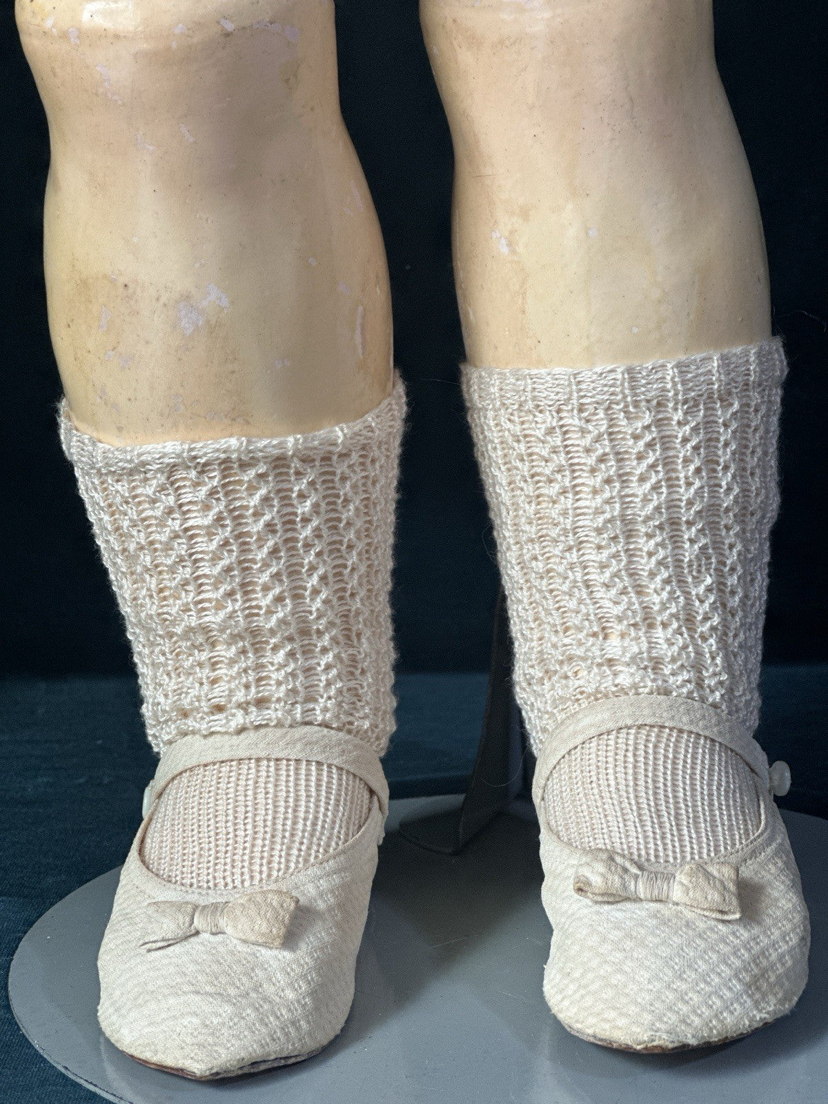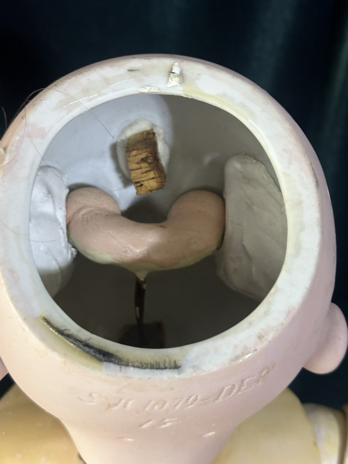 Bisque socket head, blue glass sleepy eyes. No visible damage to the bisque head. Painted lower and upper lashes. Open mouth with teeth. Pierced ears with new earrings. New hair wig; not attached to her head. Wig is a little bit small for her head.