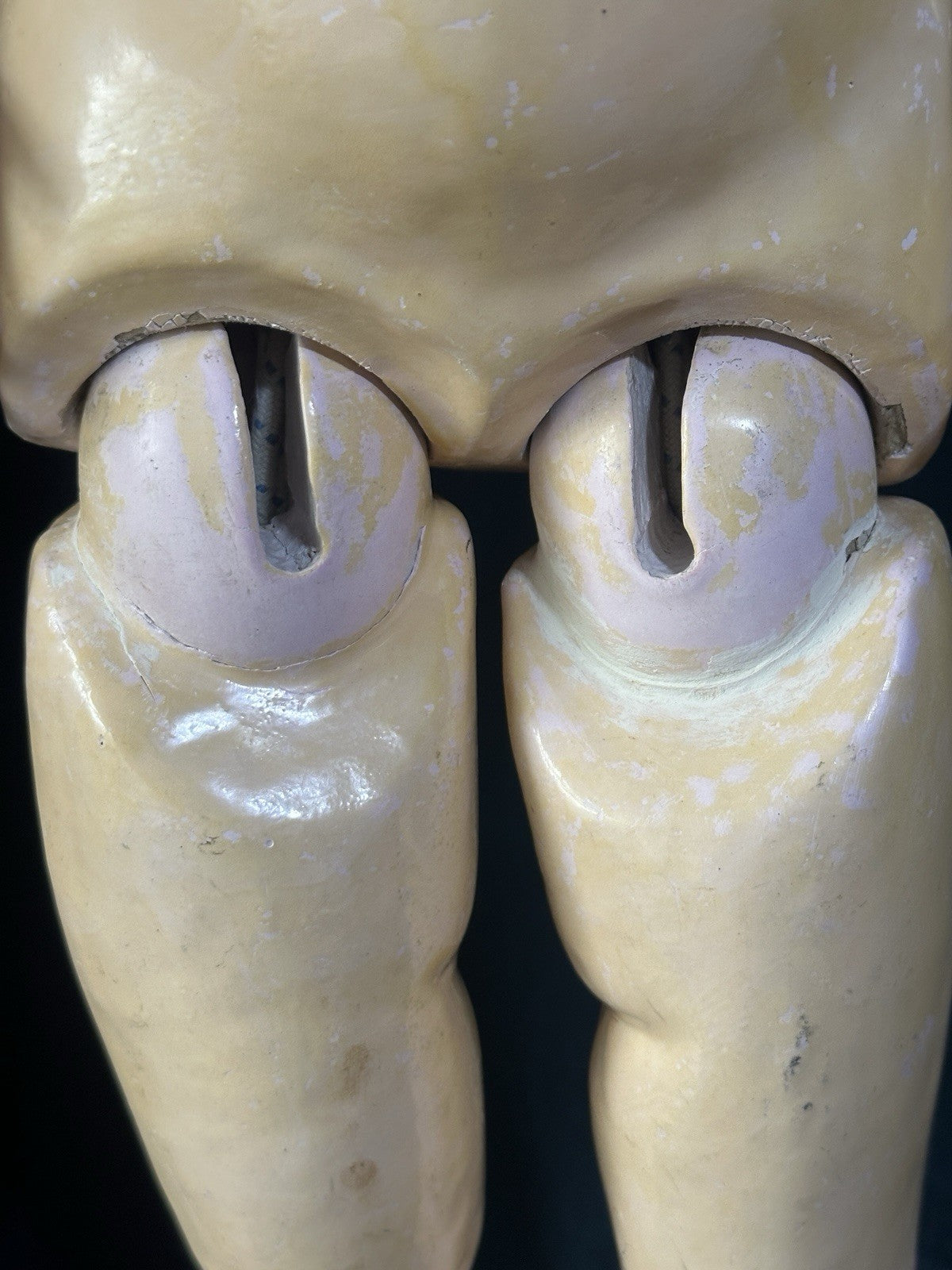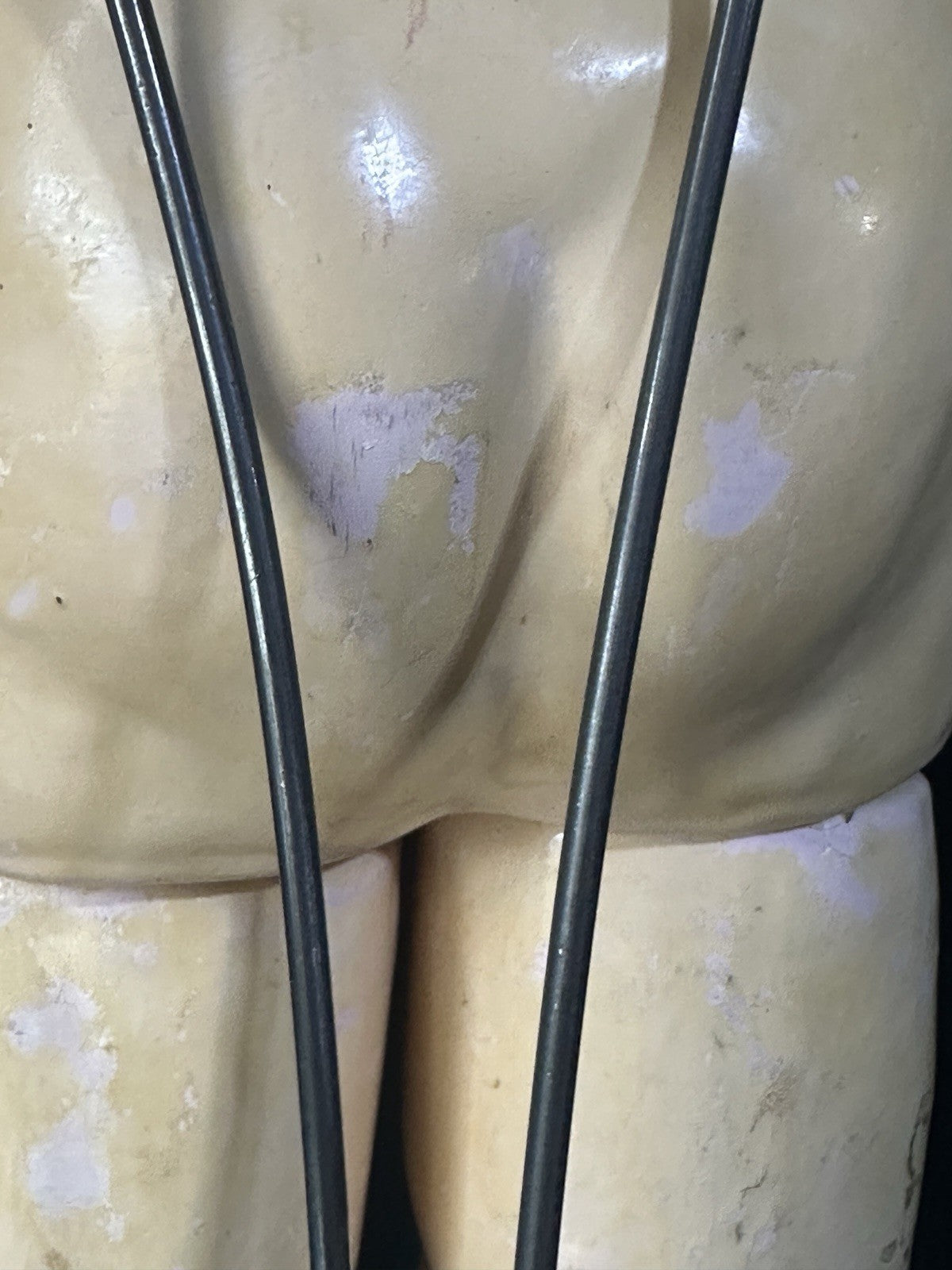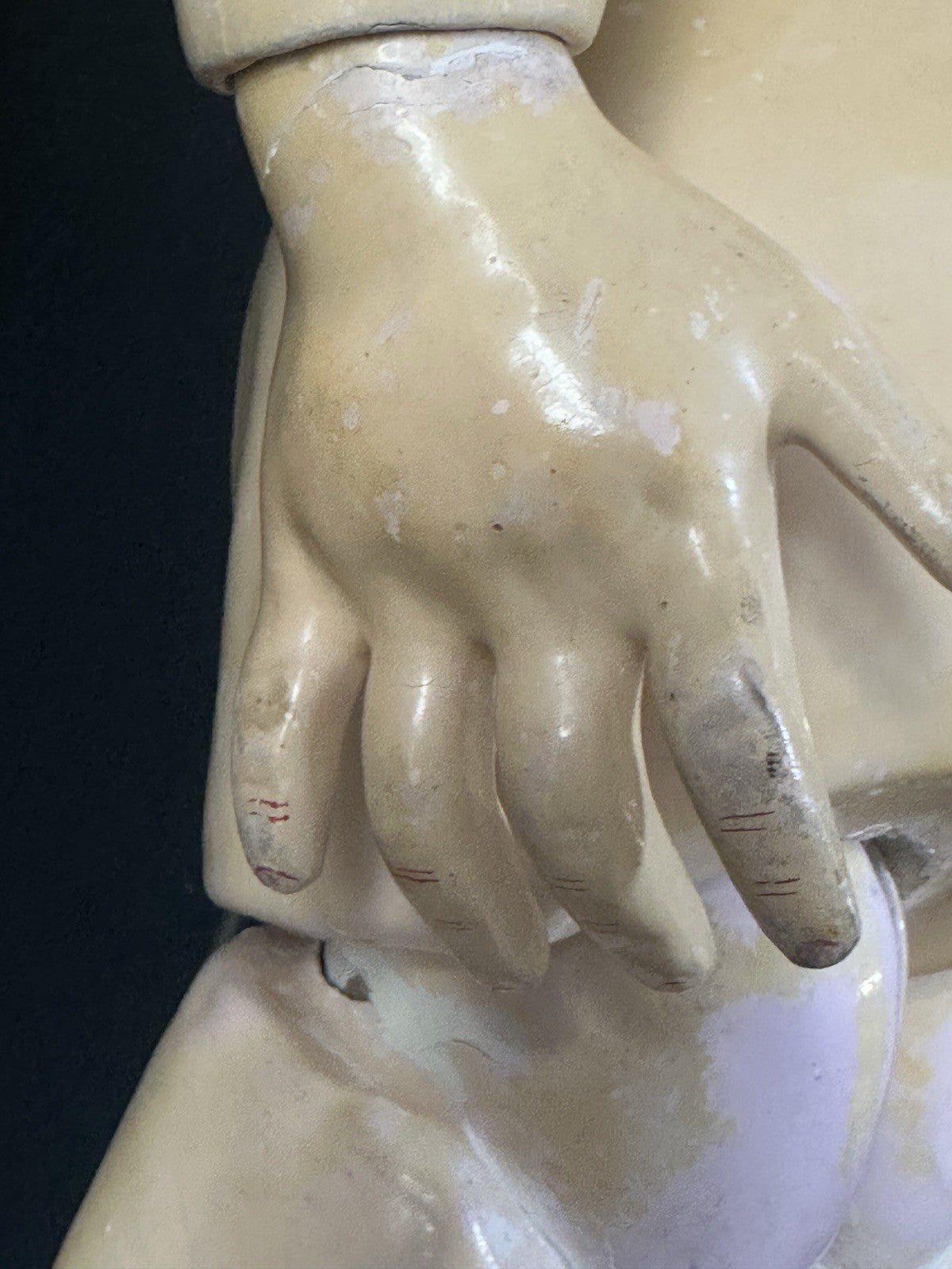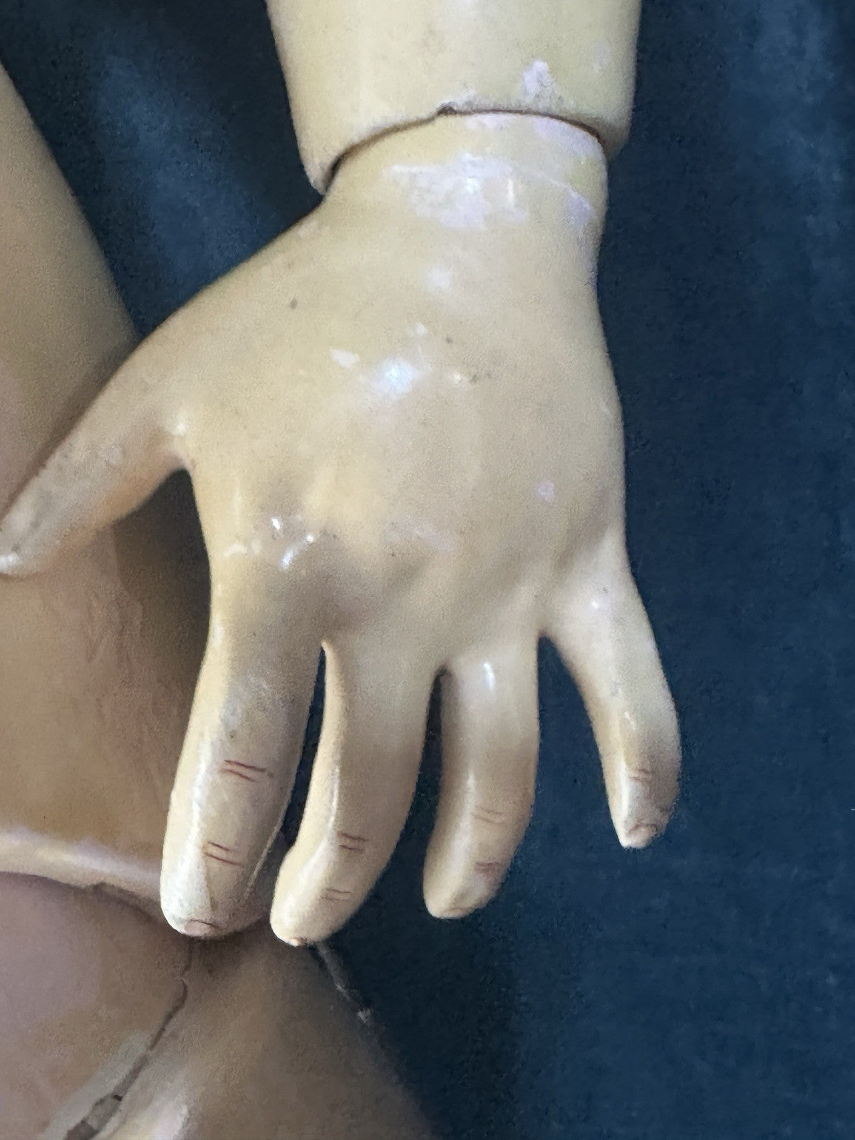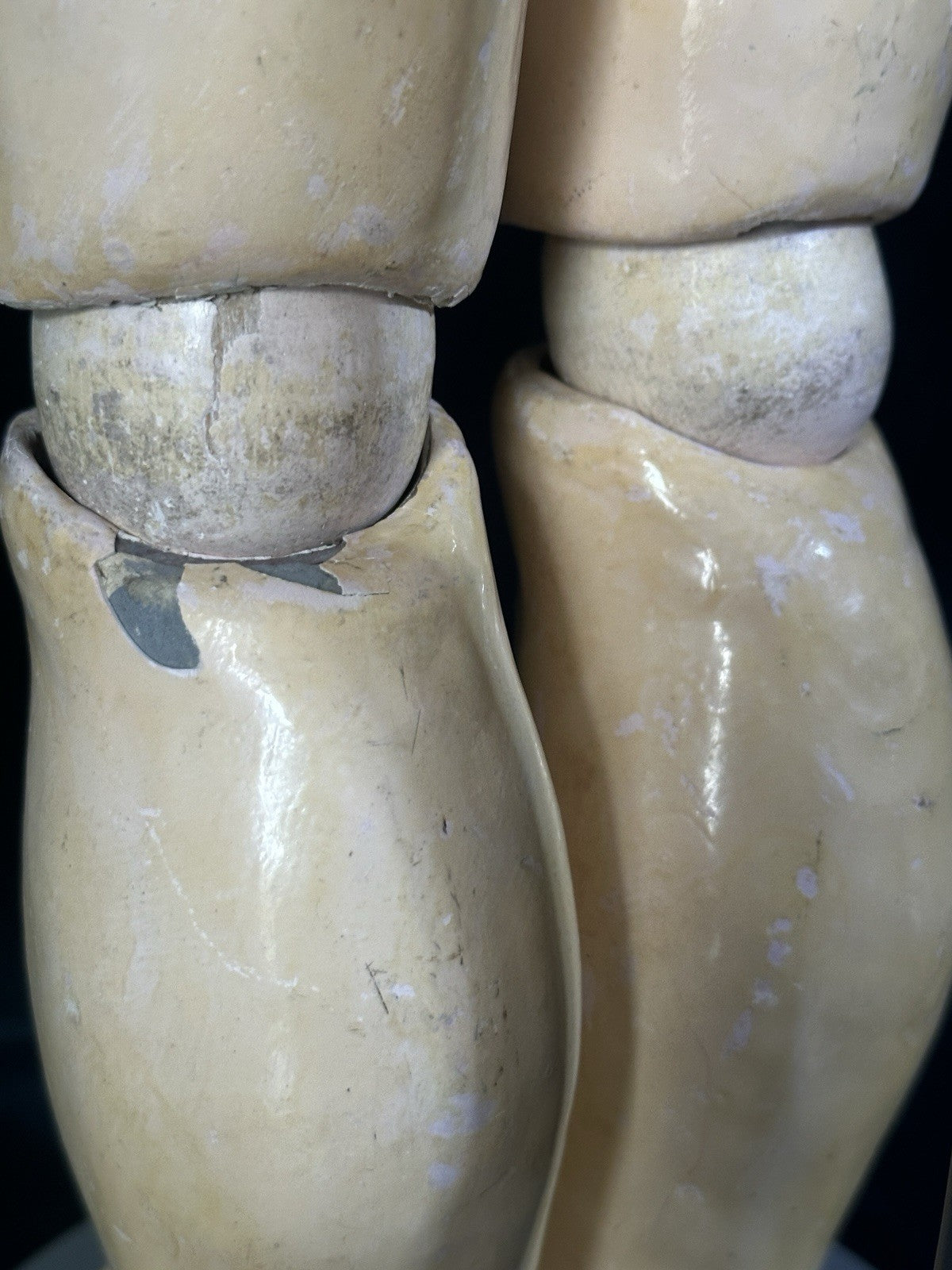 Composition body. Stringing is ok; she can strike a pose. Has a few rough areas - see photos. Crazing, cracking, scratches are present to her composition body. Please look at the photos as they are part of description.