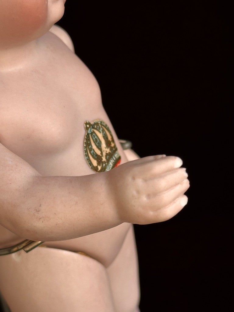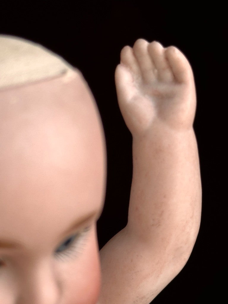 The doll comes with her original label, which is a rare find. The bisque head is in great condition. There are a few chips on the right hand, but no other flaws to the doll. Good stringing.