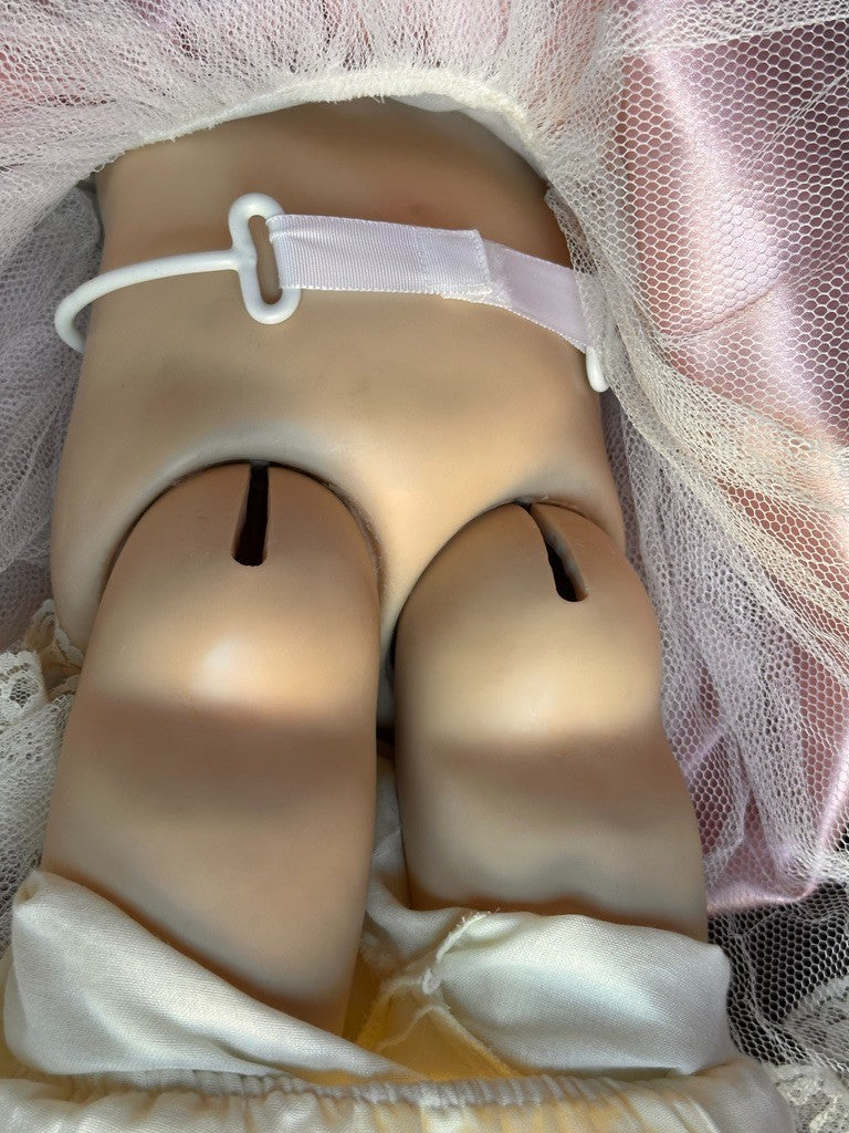 All parts of the doll are made of the same material, that looks like porcelain, however we are not sure it is porcelain. There are some scratches to her torso. Good stringing to the doll. She is missing one of the earrings. Looks like all other accessories are included.