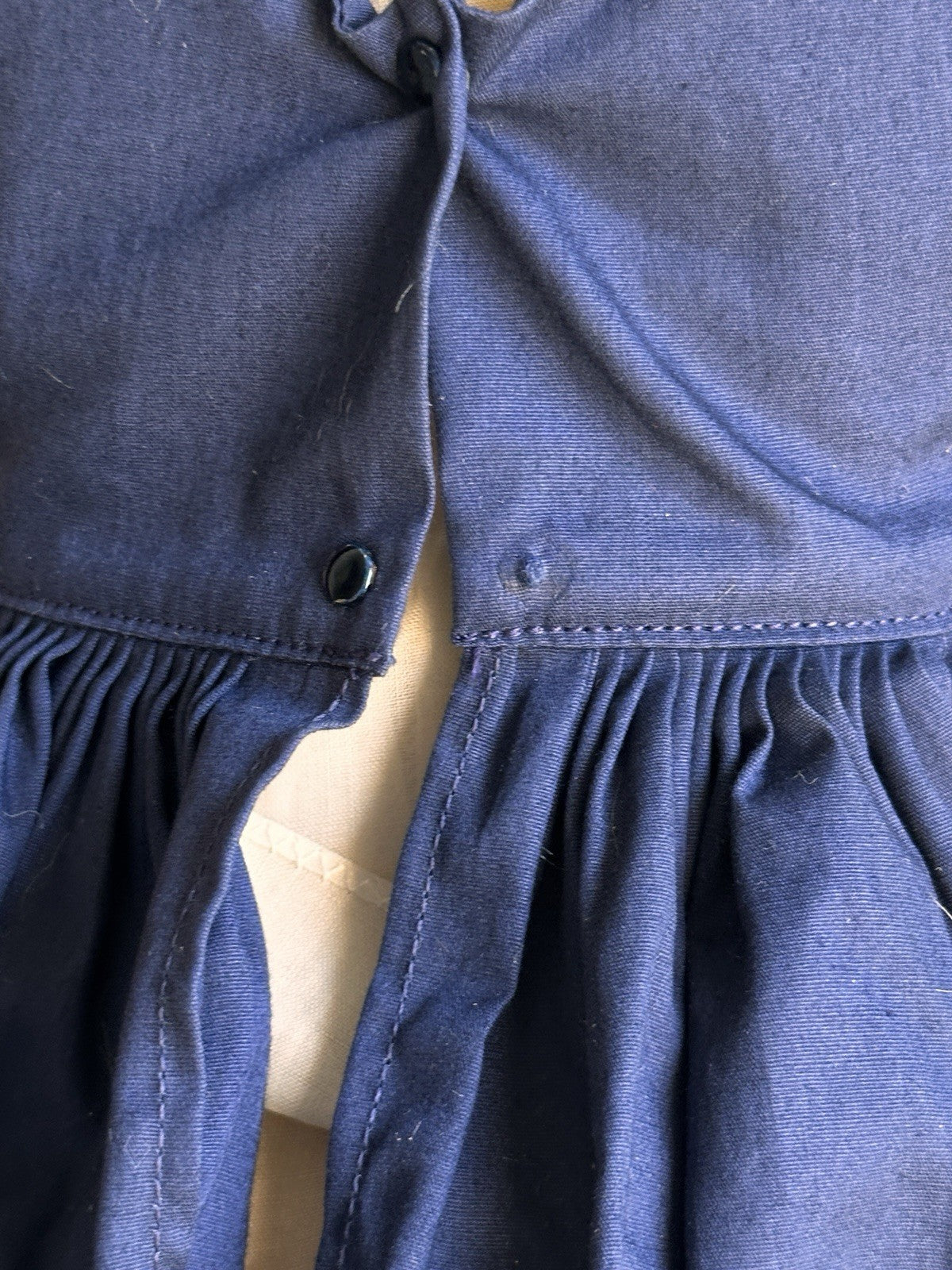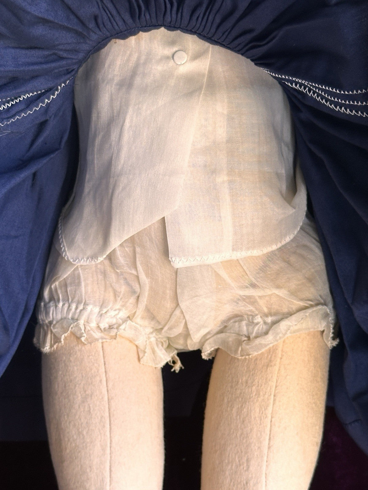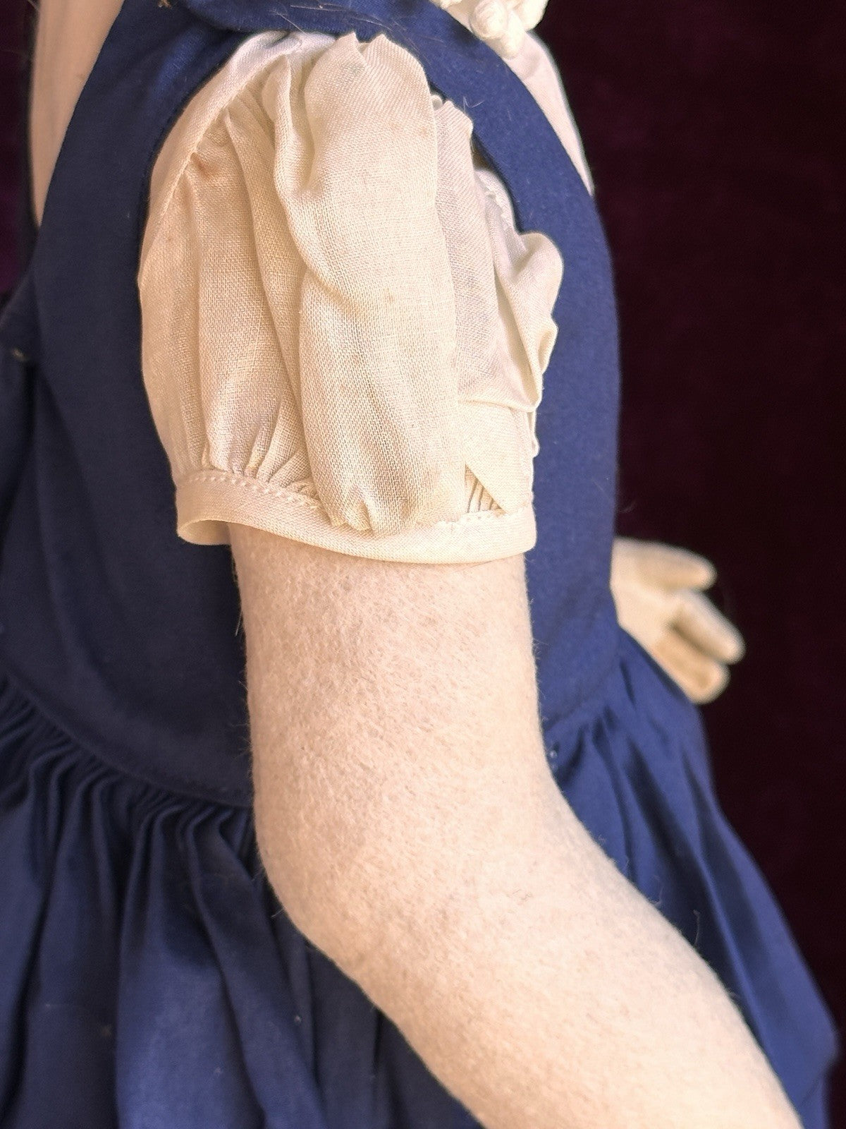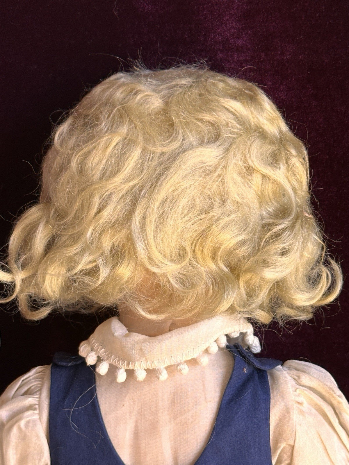 The doll is all original, including her clothes, however, the bow seems to be not original. Most likely the doll originally had some hat that is missing. There is a missing button on the back of the dress, otherwise, clothes are in a good shape.