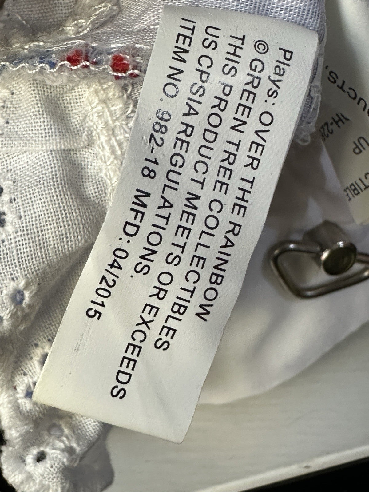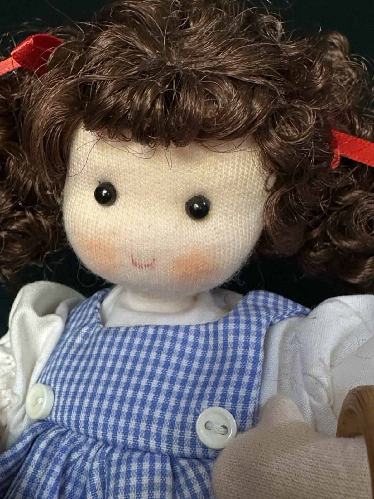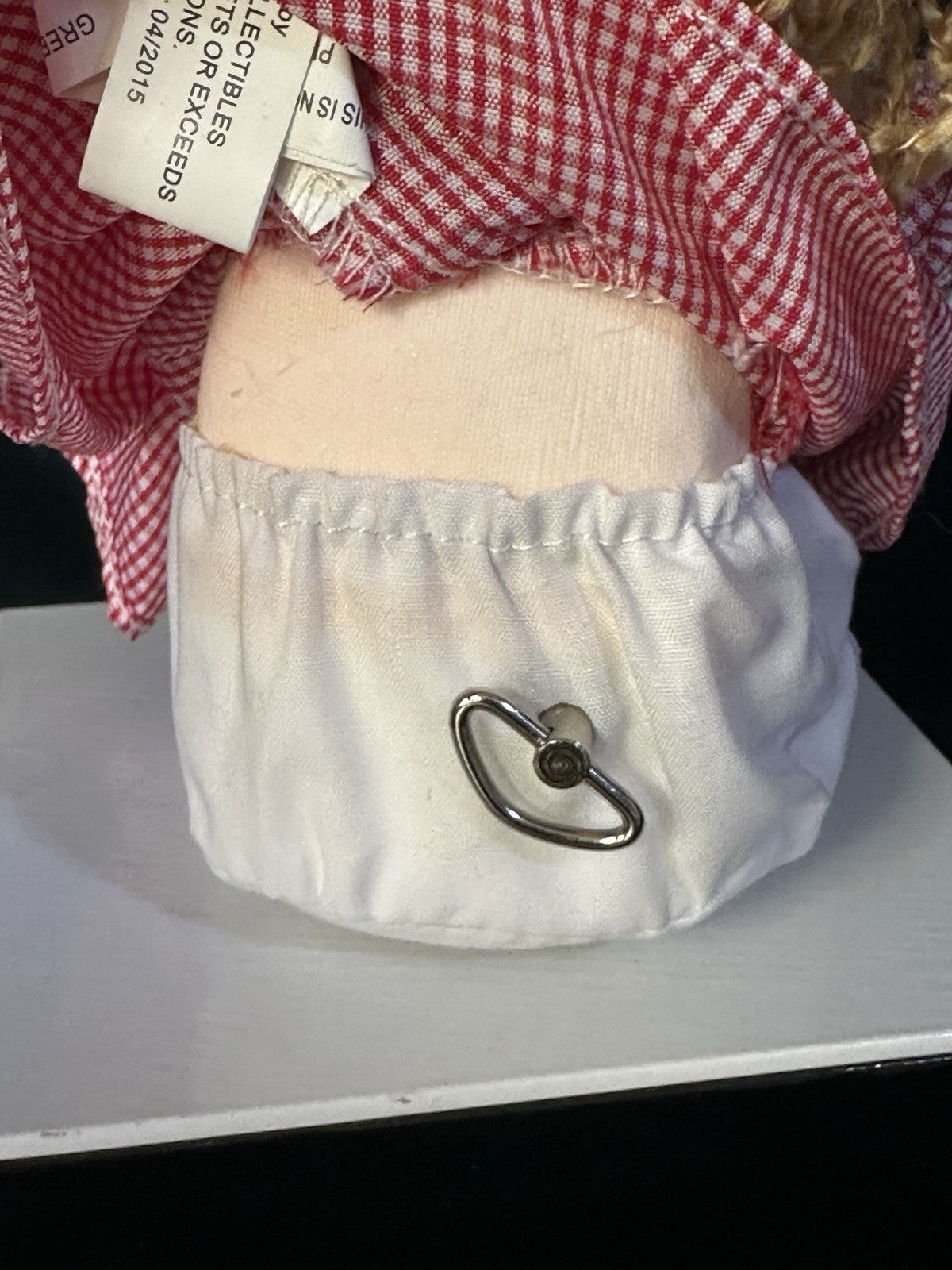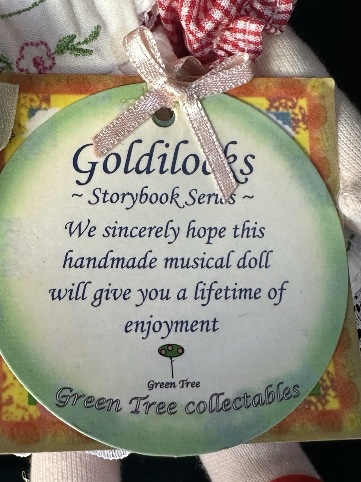Two cute musical dolls in working condition! Please refer to the photos with a measuring tape for the size. Each doll plays a different music/tune - Dorothy plays "Over the rainbow" and Goldilocks plays "Brahms Lullaby ". Some stains are present yo both dolls bottoms - see photos. Selling as a lot only. Decor apple basket is not included.