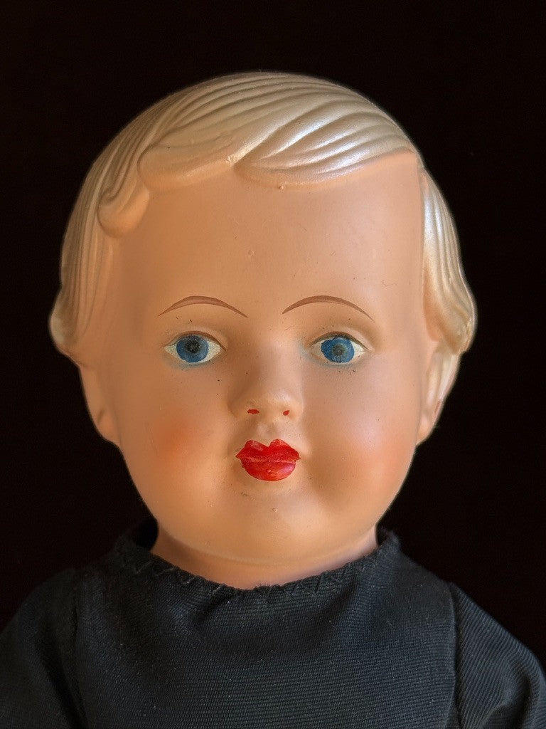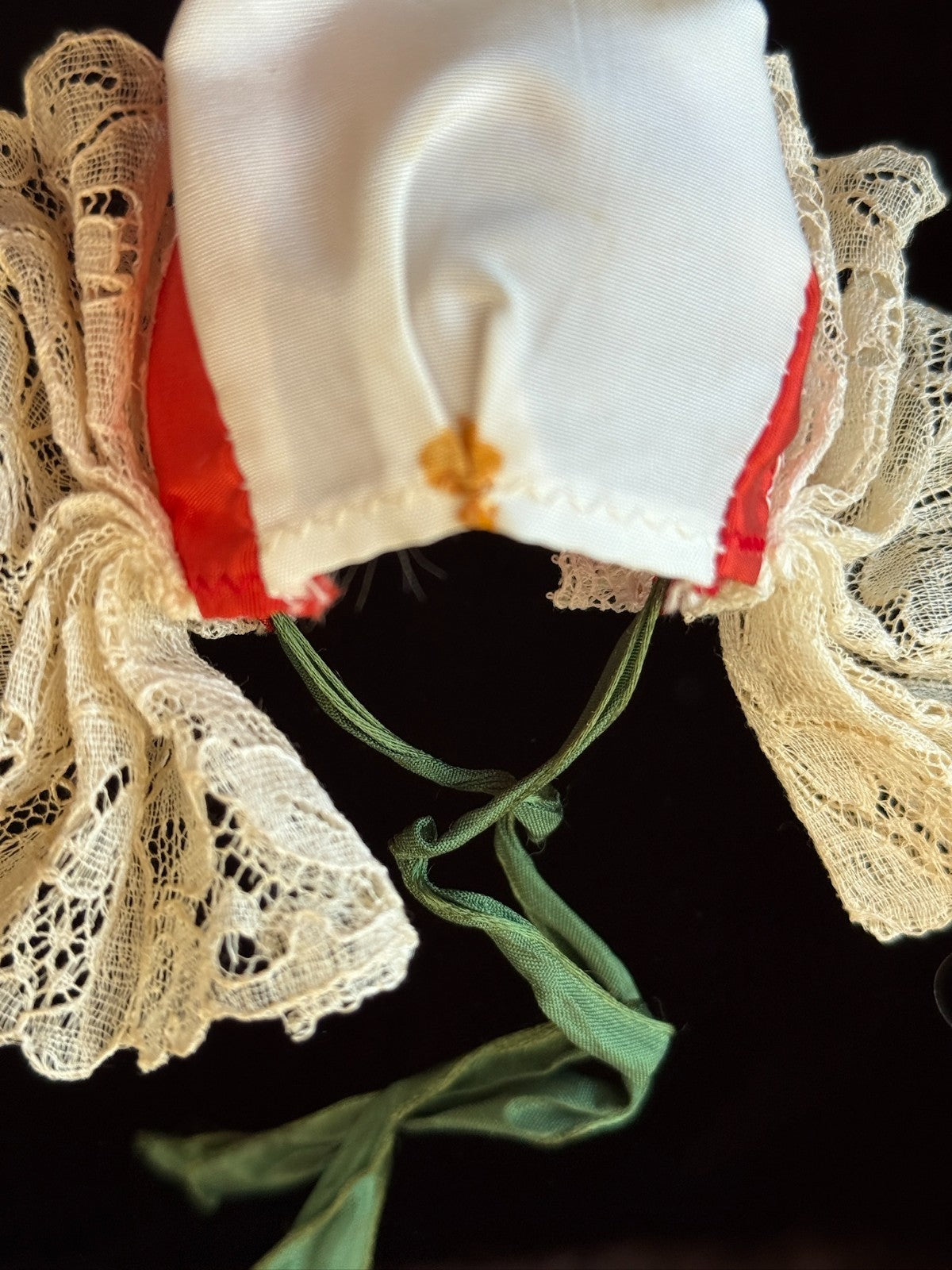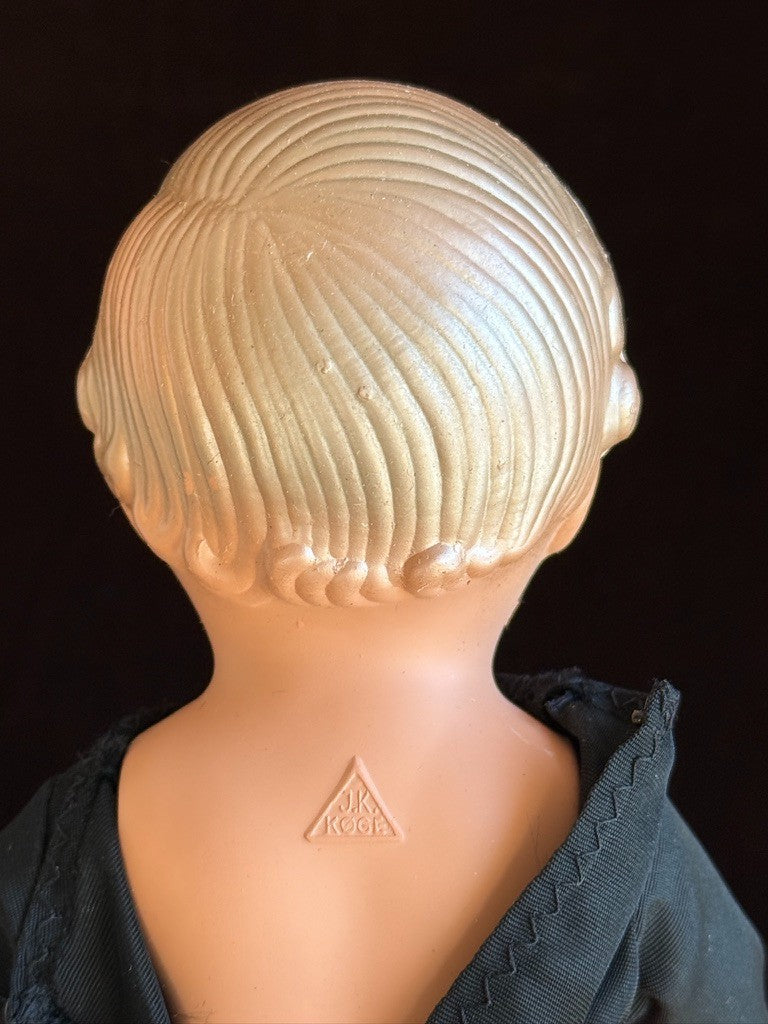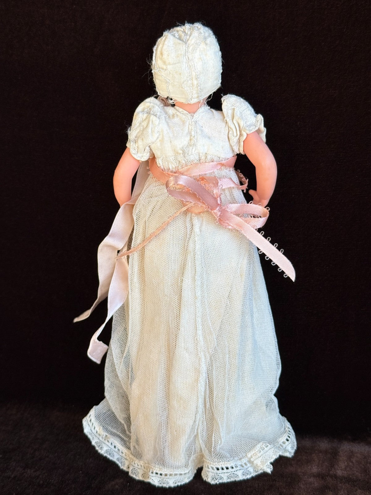The larger doll is approximately 9.25" tall. She appears to be all original and is coming with her tag still attached to the skirt. There is one small stain on the back of the bonnet. No other wear or issues were noticed.