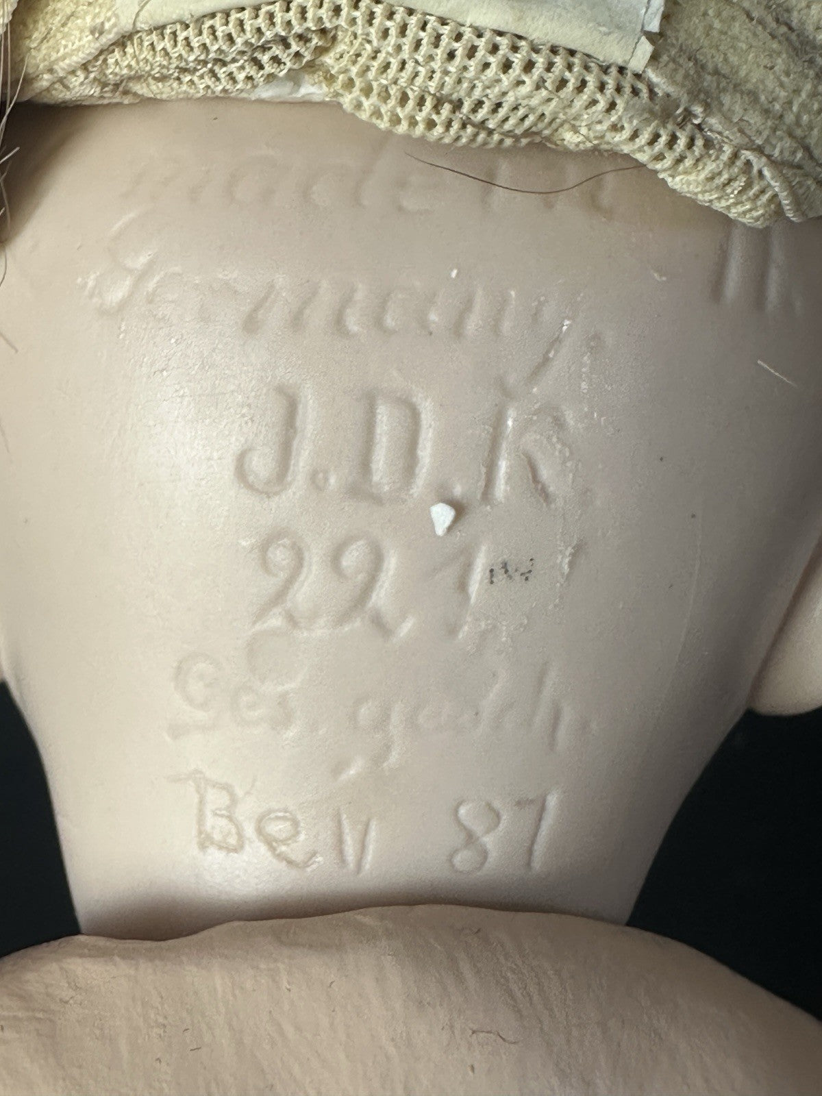 Lot of 2 adorable reproductions of famous 221 Googly eyes dolls originally created by by JDK Kssrner 1!! Each doll is about 11"tall; porcelain head and y like body. Stringing is ok. Stationary Googly eyes, beautiful face painting. Each doll is marked on the back of her head. Each doll is wearing a handmade outfit; stains/holes/faded colors are present. Stands and decor are not included.