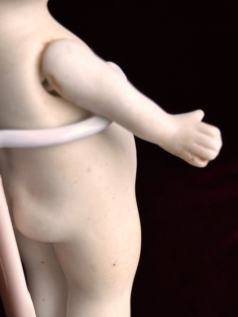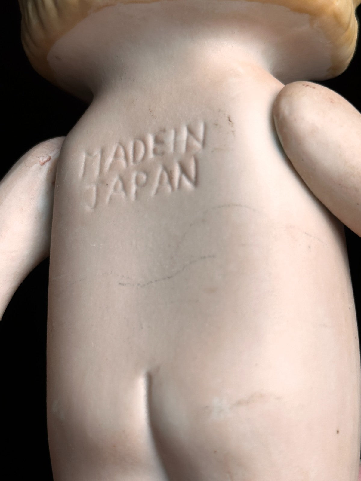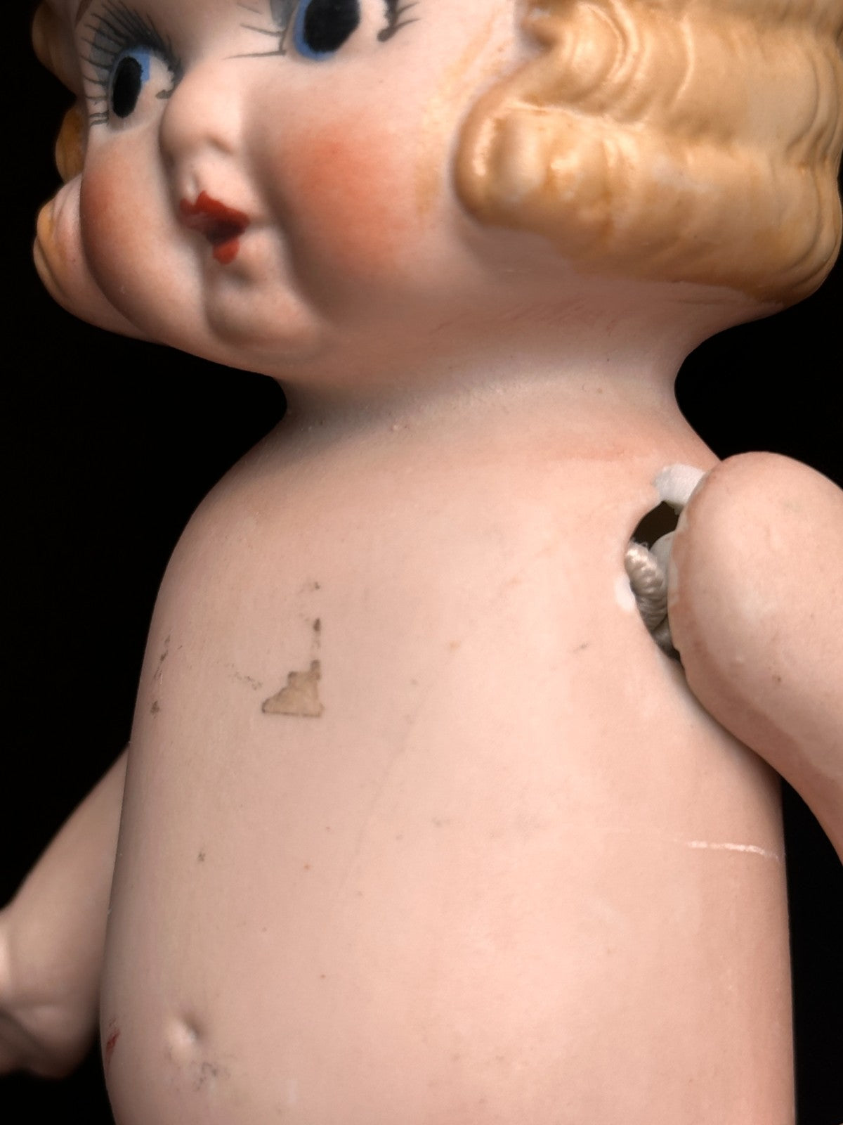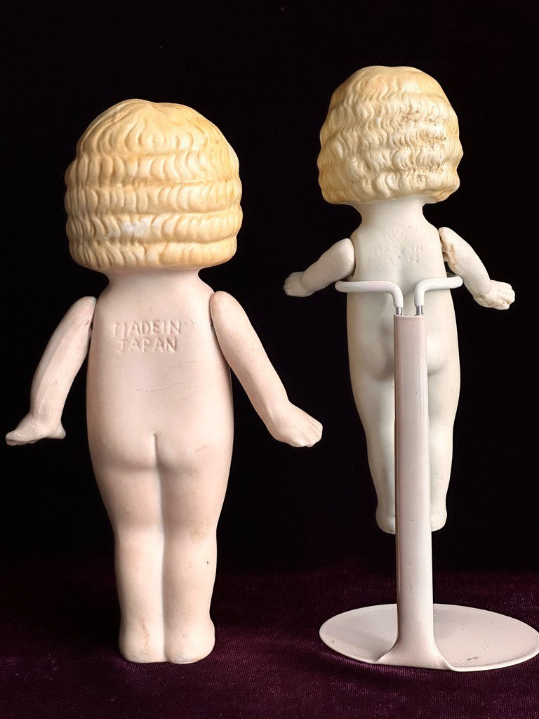 The larger doll has a few chips, including a couple of chips to the torso on the right side where it connects to the arm. There is also a possible hairline to her torso, but we are not sure if it is a hairline. There are some marks from a stand on the back. Some paint wear is present on a few of the dolls. Overall, all dolls are in good condition.