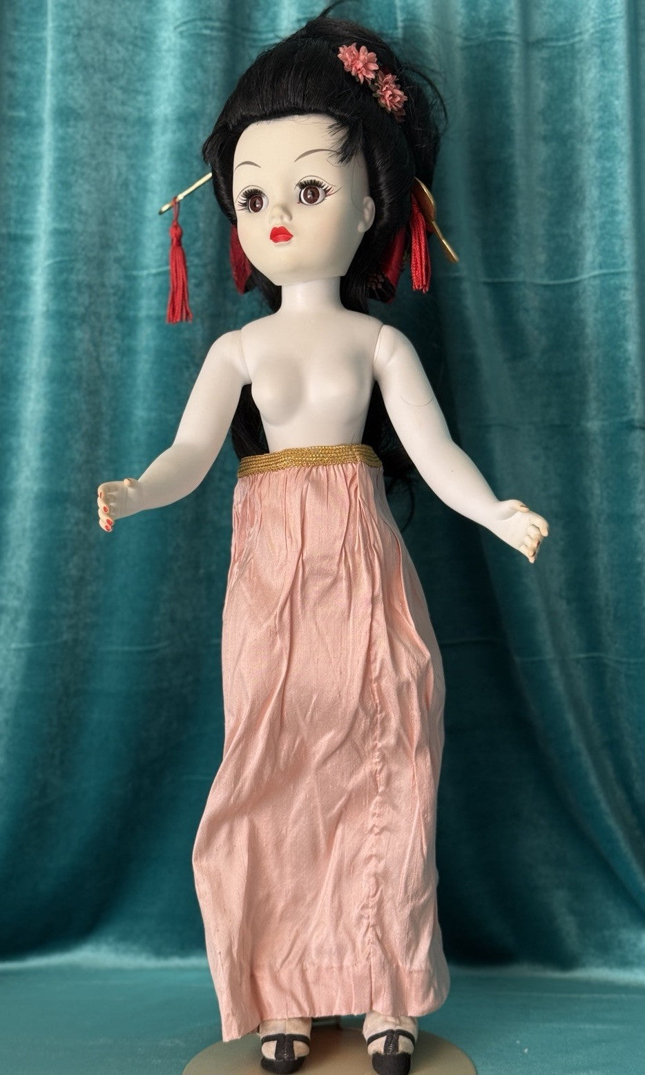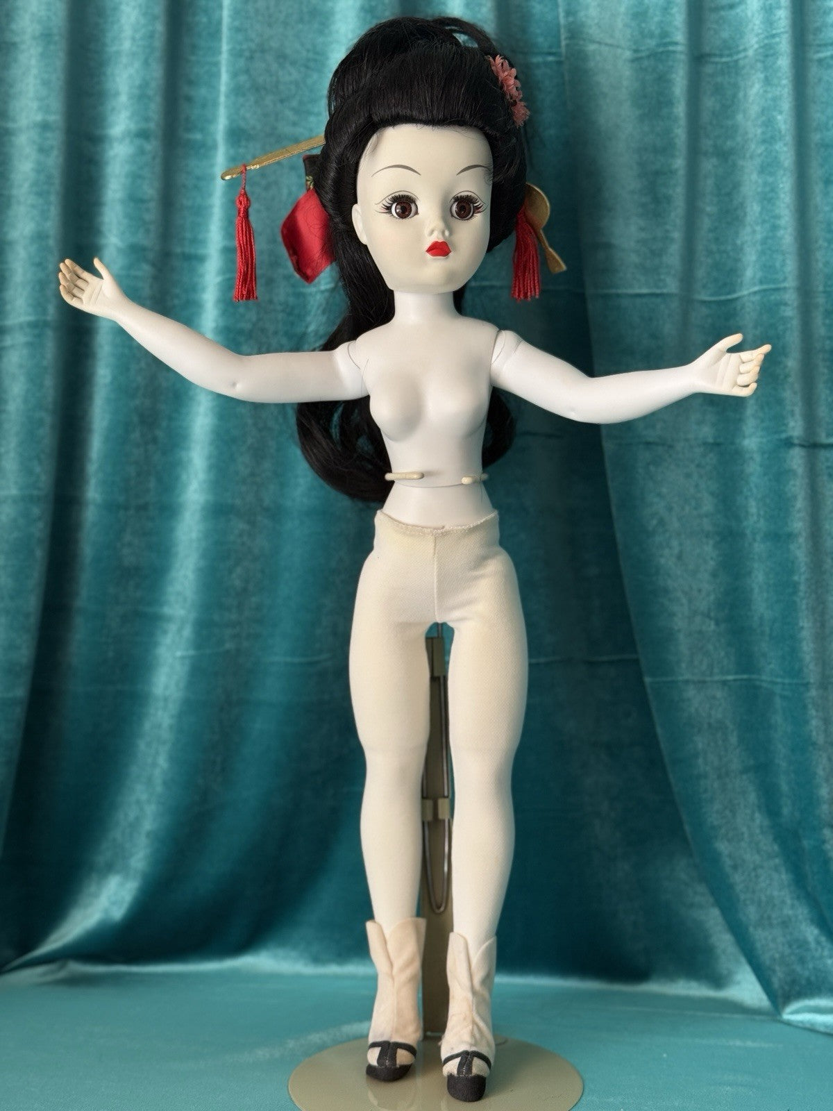 Madame Alexander Cissy Doll 1997 Limited Madame Butterfly doll. Made of vinyl and hard plastic. She is measuring at about 21 inches tall. Loose stringing. Beautiful face paint; sleep eyes mechanism is working. Black hair is a little bit messy. Legs are articulated and can be bent at the knee. Might be missing some accessories. Her outfit is beautiful!! No box, tag or certificate. Stand is not included. Comes with original butterfly. Additional photos could be provided upon request