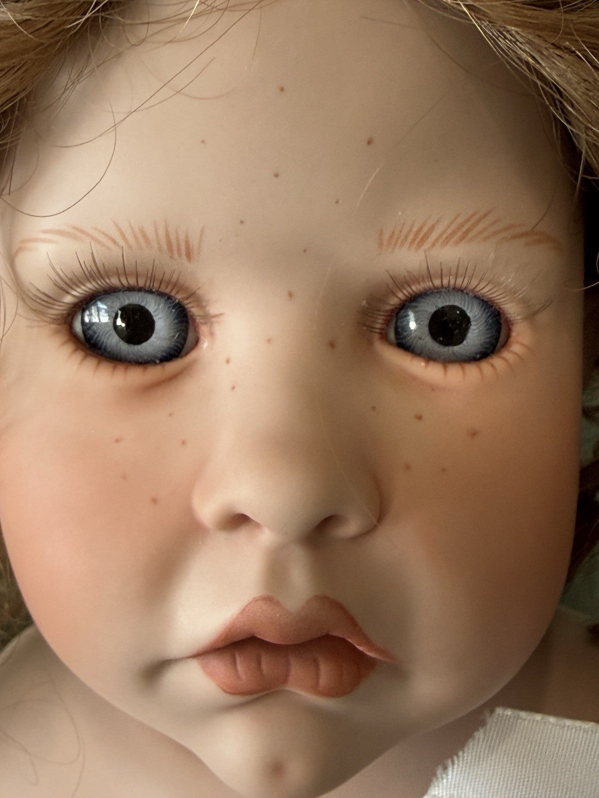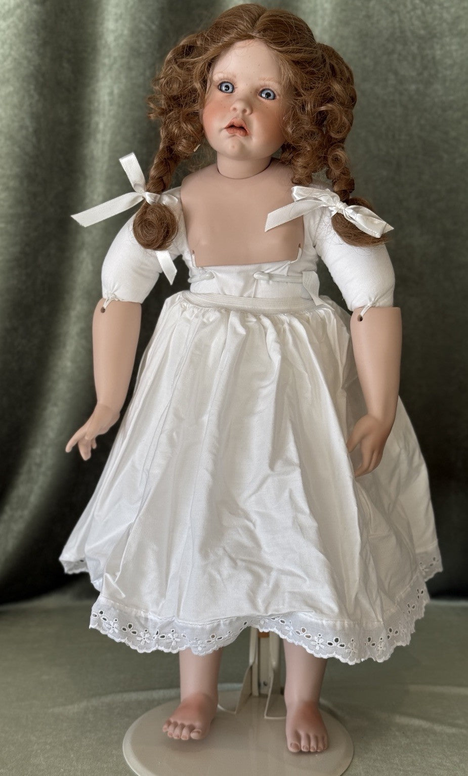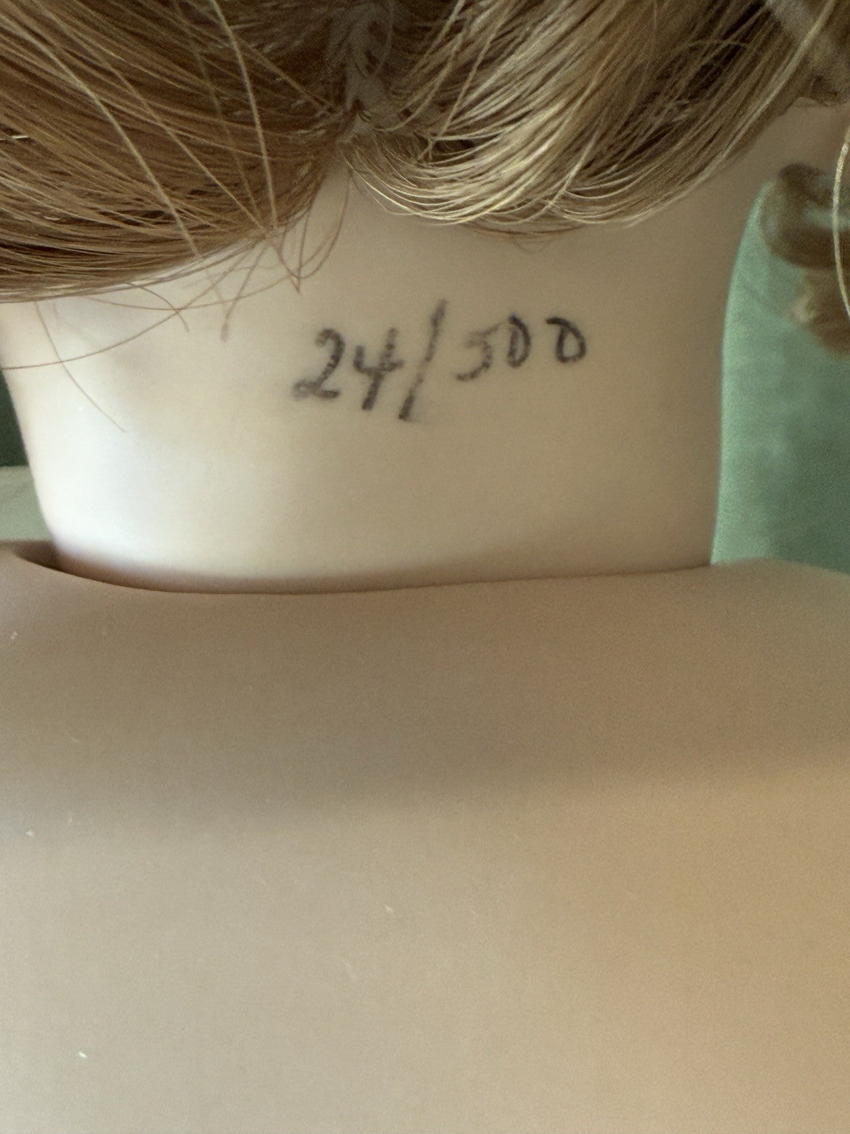 Beautiful doll by famous doll artist! Her name is Hilke and she is a limited edition of 500 dolls. She is numbered 24 out of 500 dolls. Hilke has porcelain head and breast plate and partial extremities. The rest of her body is stuffed fabric. The doll is supposed to be displayed in a standing position. She is approximately 24" tall. Comes in her original clothes, no COA or tag. Stand is not included. Please see all photos; additional photos can be provided upon request.