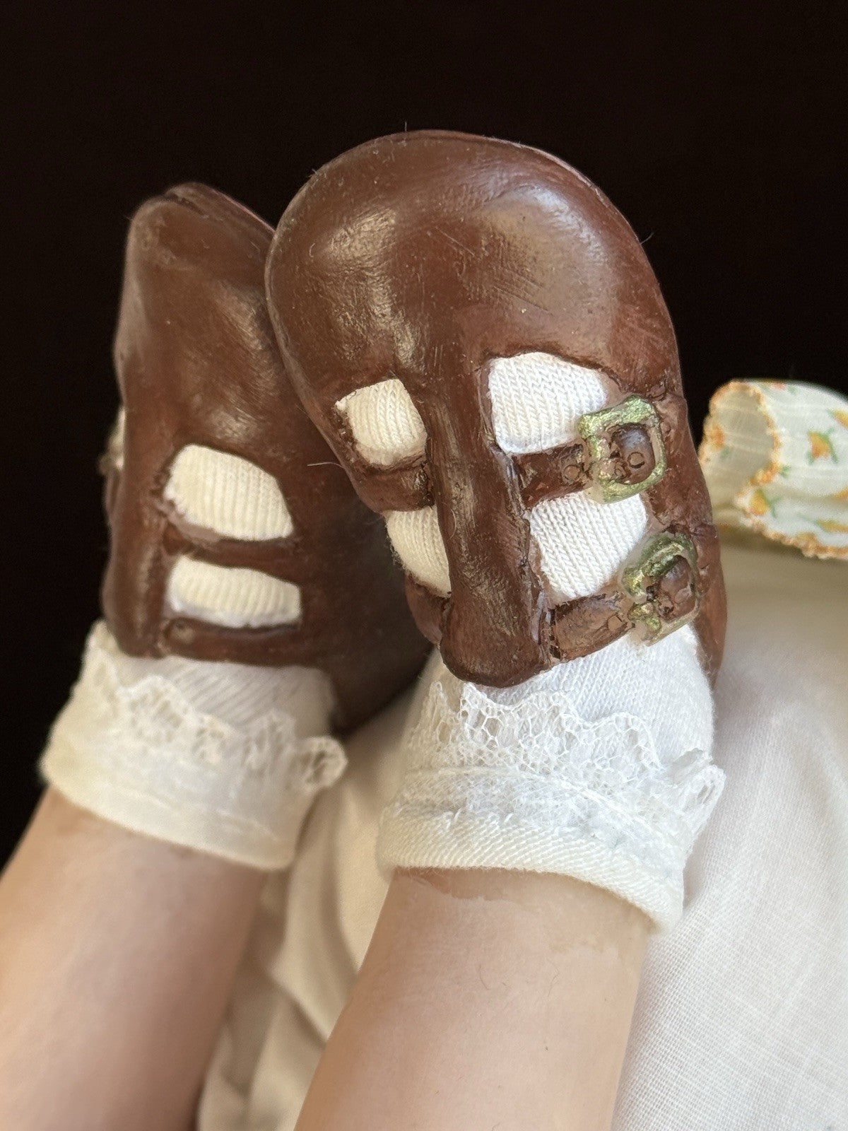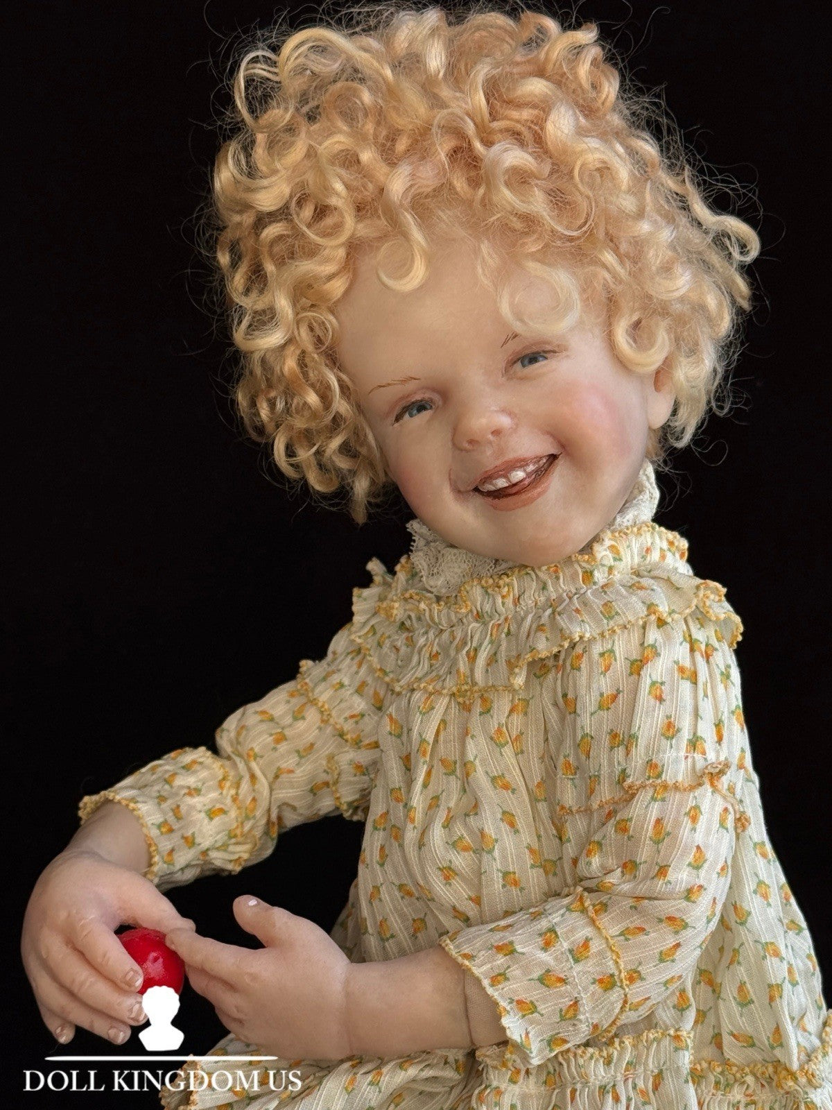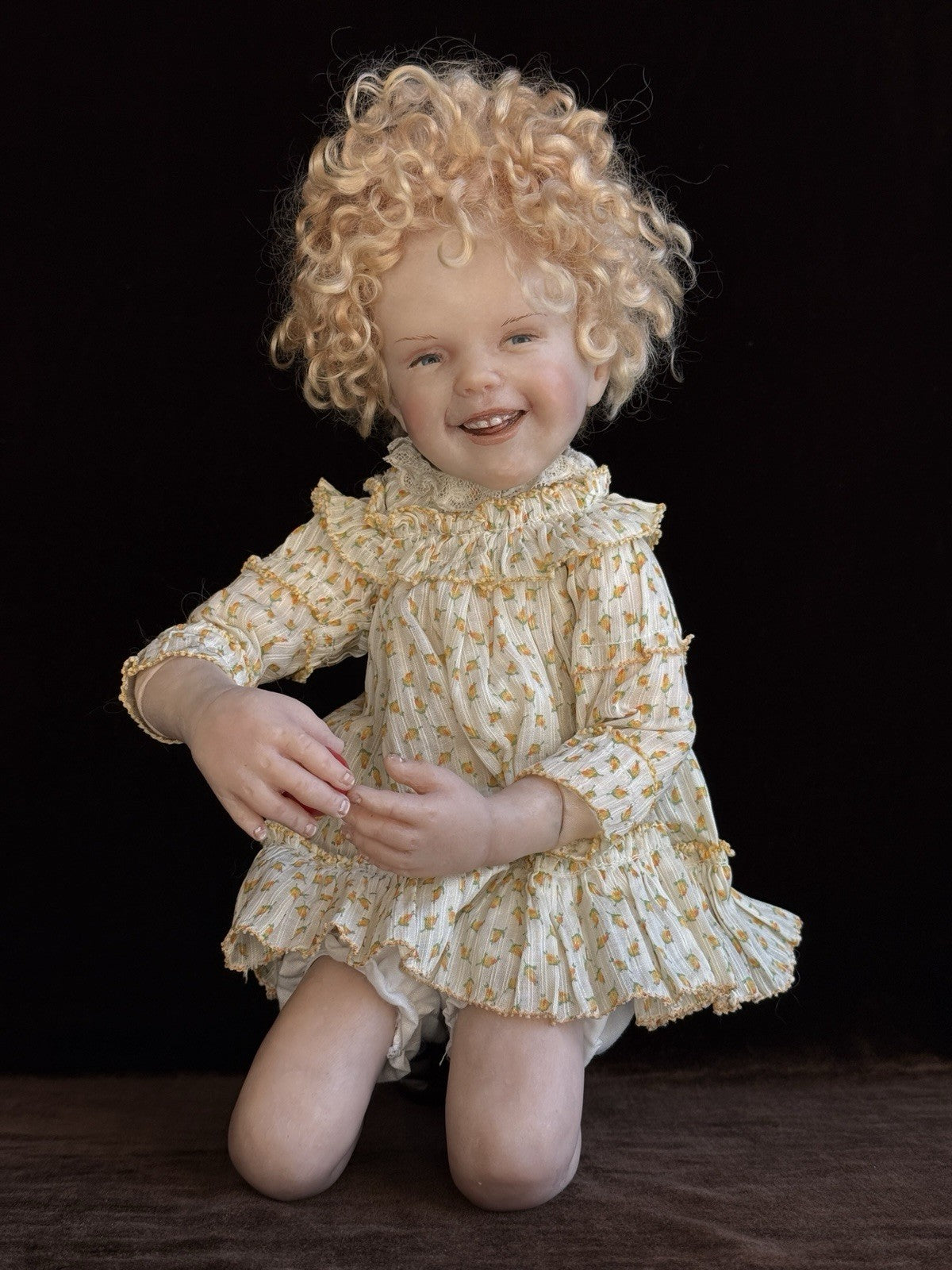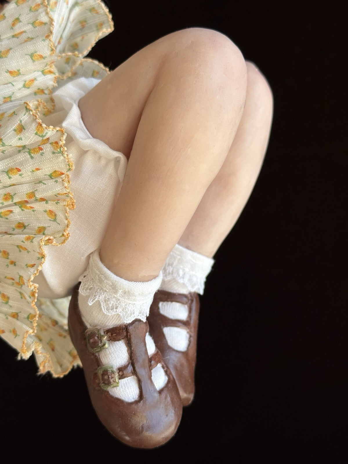 Adorable happy girl sculpted in a fixed seated position, measuring approximately 11" as displayed. She cannot be positioned differently. The legs are not movable, while the arms are a bit flexible. The shoes are not removable. They are sculptured as a part of the doll.