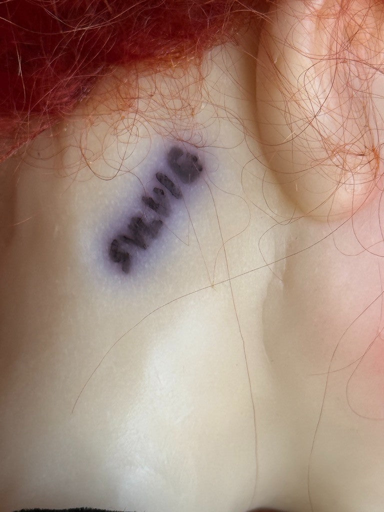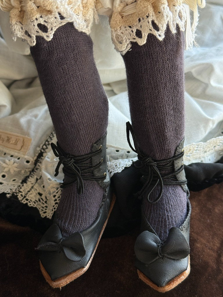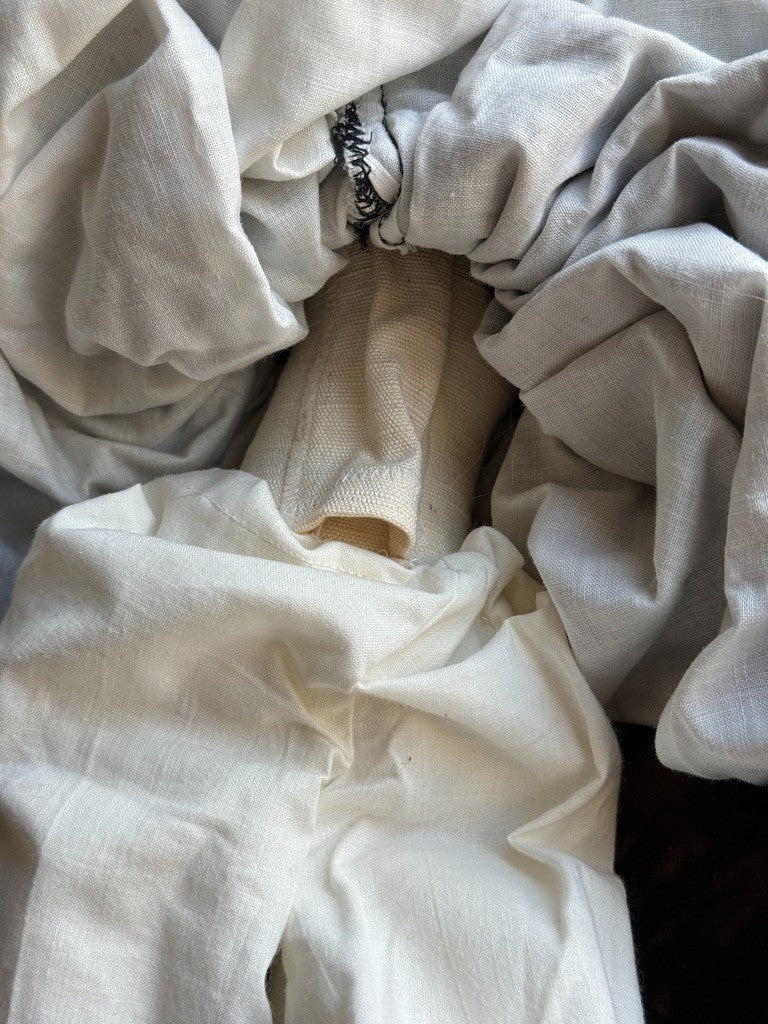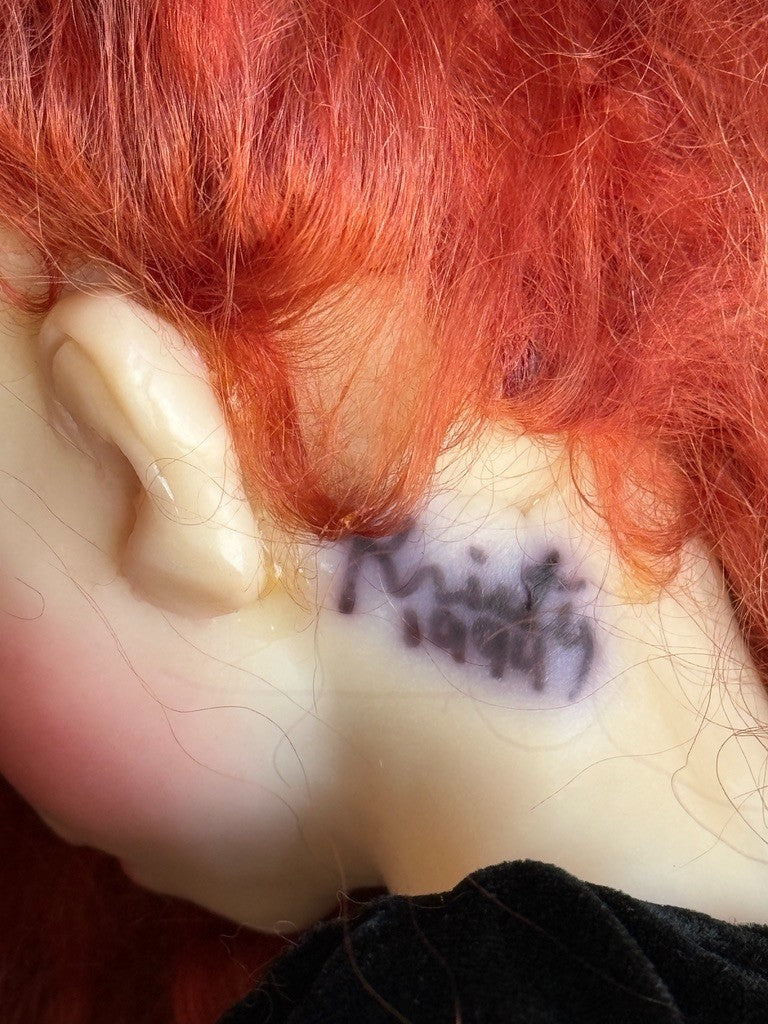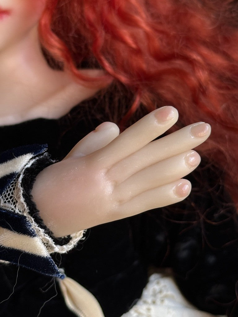 She is in great condition with only very light possible wear. The doll appears to have a resin-made head and shoulder plate (one piece), with lower arms and legs made of the same material. The rest of the body is cloth. Most of the limbs are soft, allowing the doll to be positioned in different seated poses due to the flexibility.