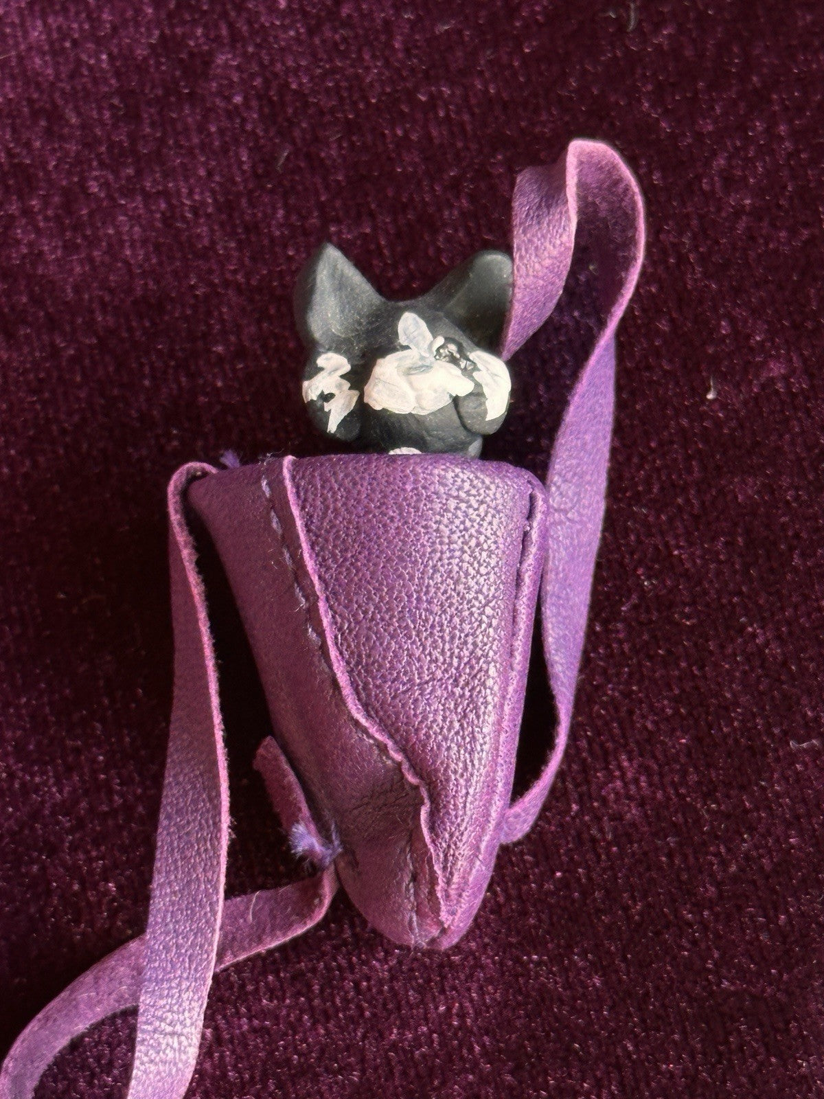 Adorable tiny doll by well-known doll artist. Approximately 2.75" tall. She is in great pre-owned condition. No flaws were found. The doll is clean. All parts of the doll are made of polymer clay. Arms and legs are jointed. The girl is coming with handmade cat and leather bag. Original artist card is included. Please refer to the pictures for more details. The stand is included.