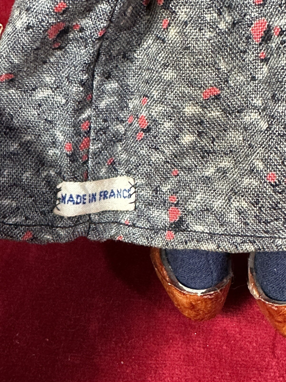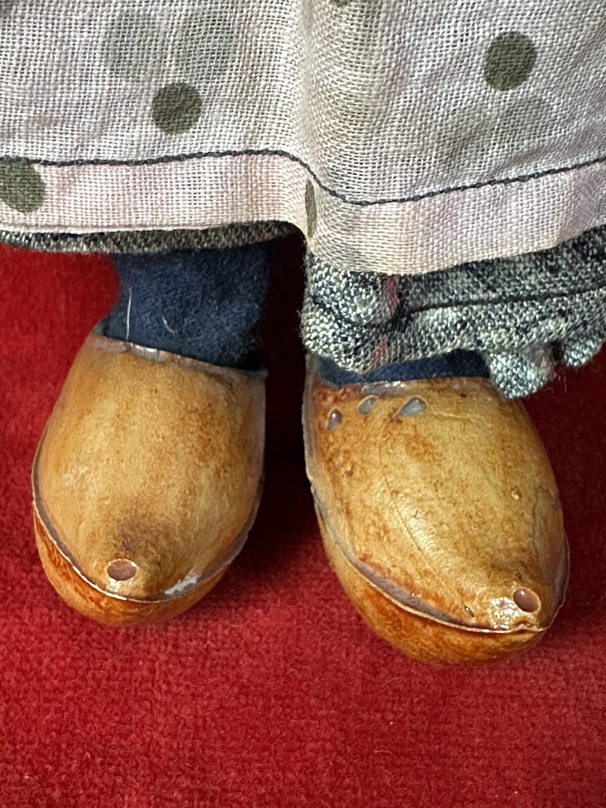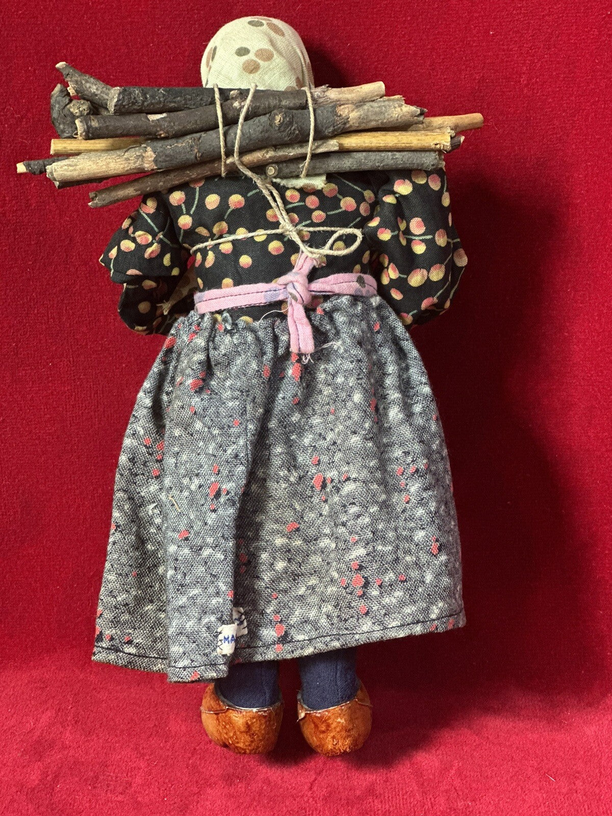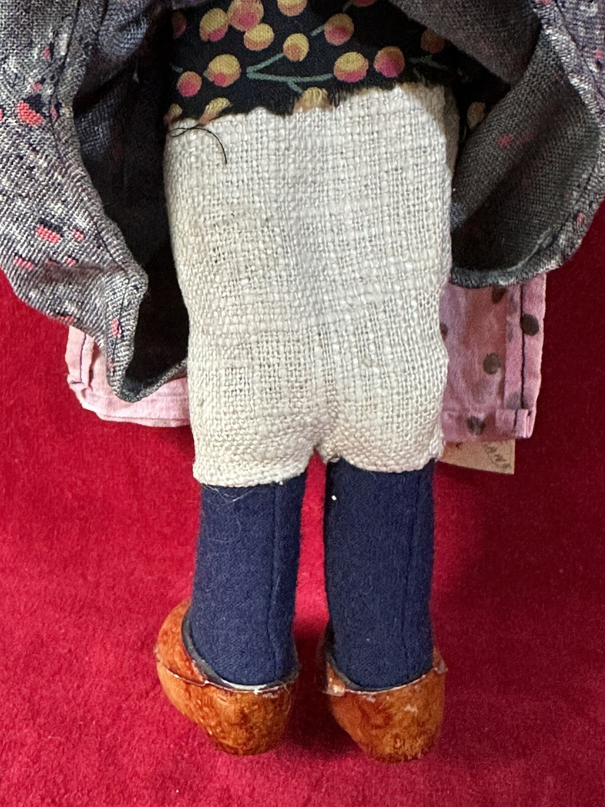 She has her original tag and sewn to her skirt label - see photos. She is approximately 9 3/4" tall; has most likely straw stuffed body and cloth stuffed limbs. Holes and discolorations are present to her face and clothes - see photos.
