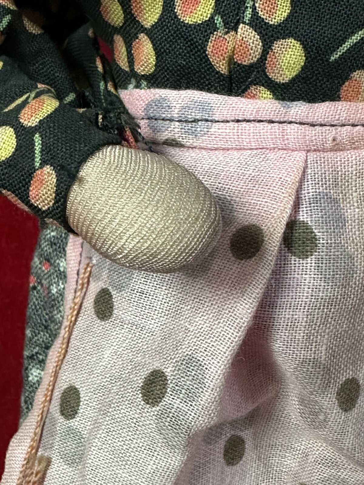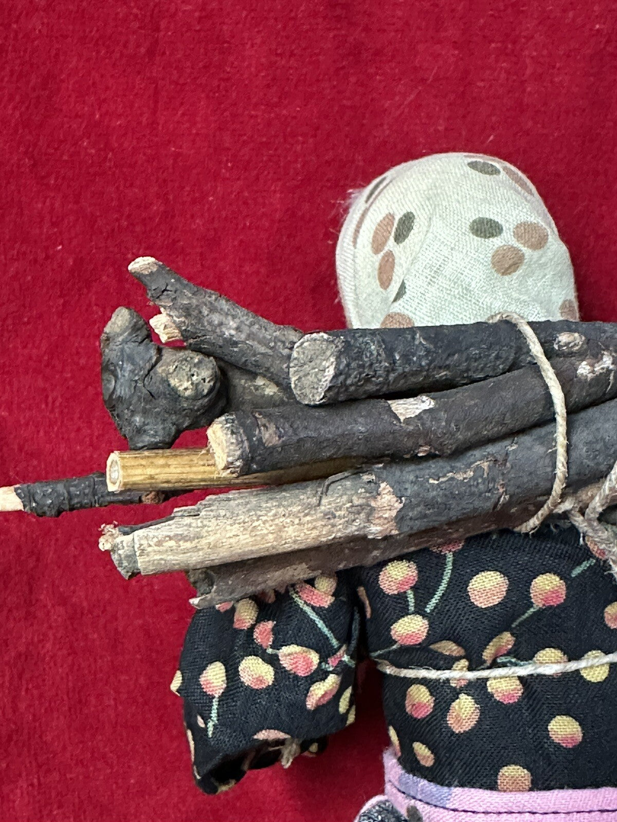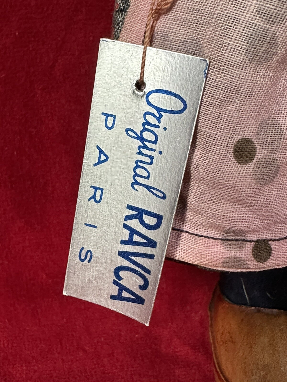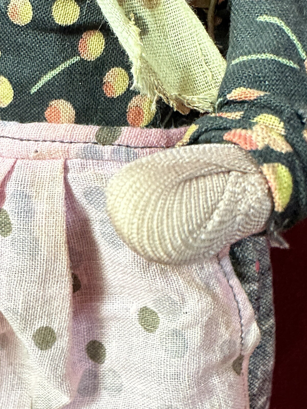She has her original tag and sewn to her skirt label - see photos. She is approximately 9 3/4" tall; has most likely straw stuffed body and cloth stuffed limbs. Holes and discolorations are present to her face and clothes - see photos.