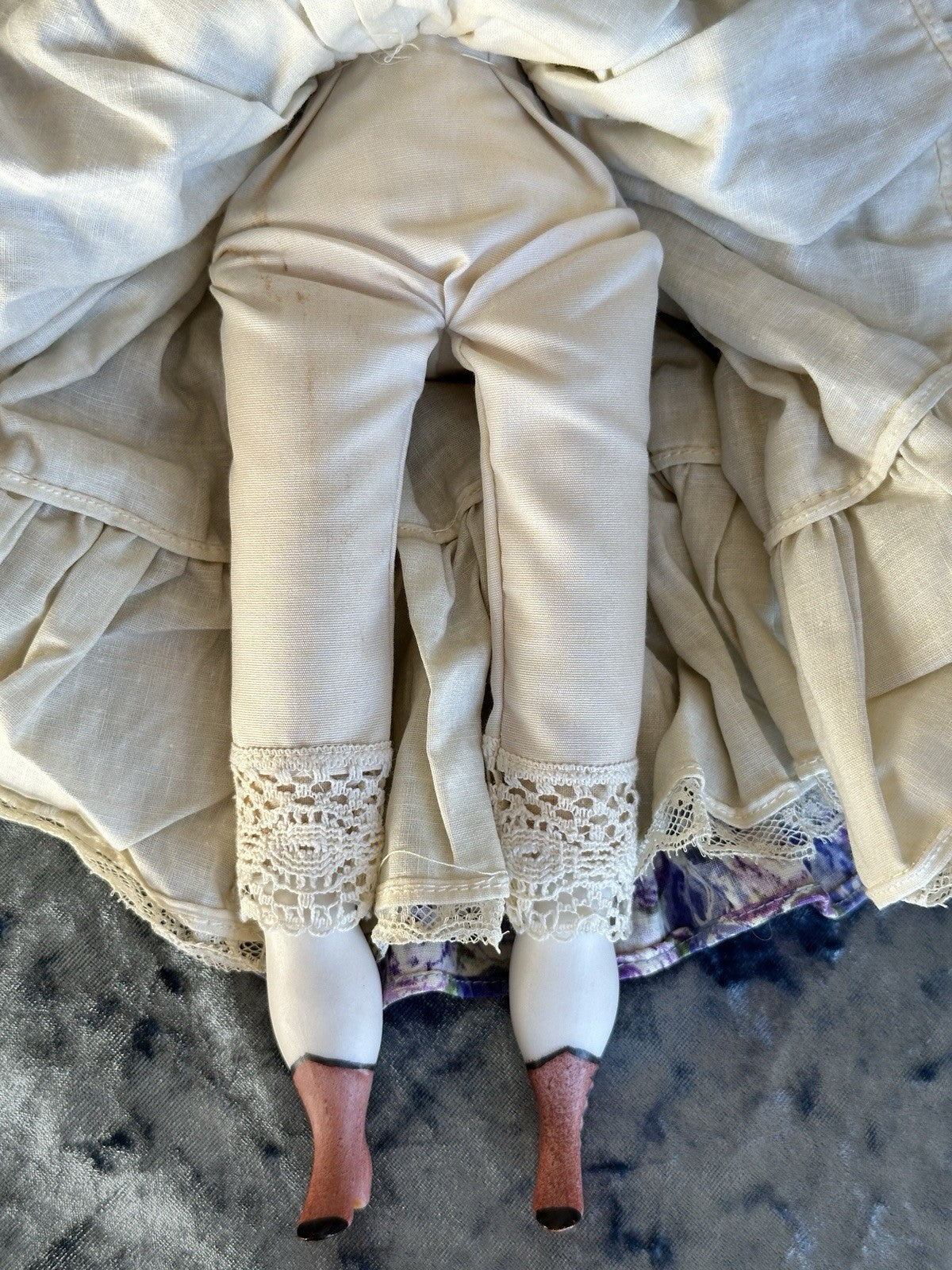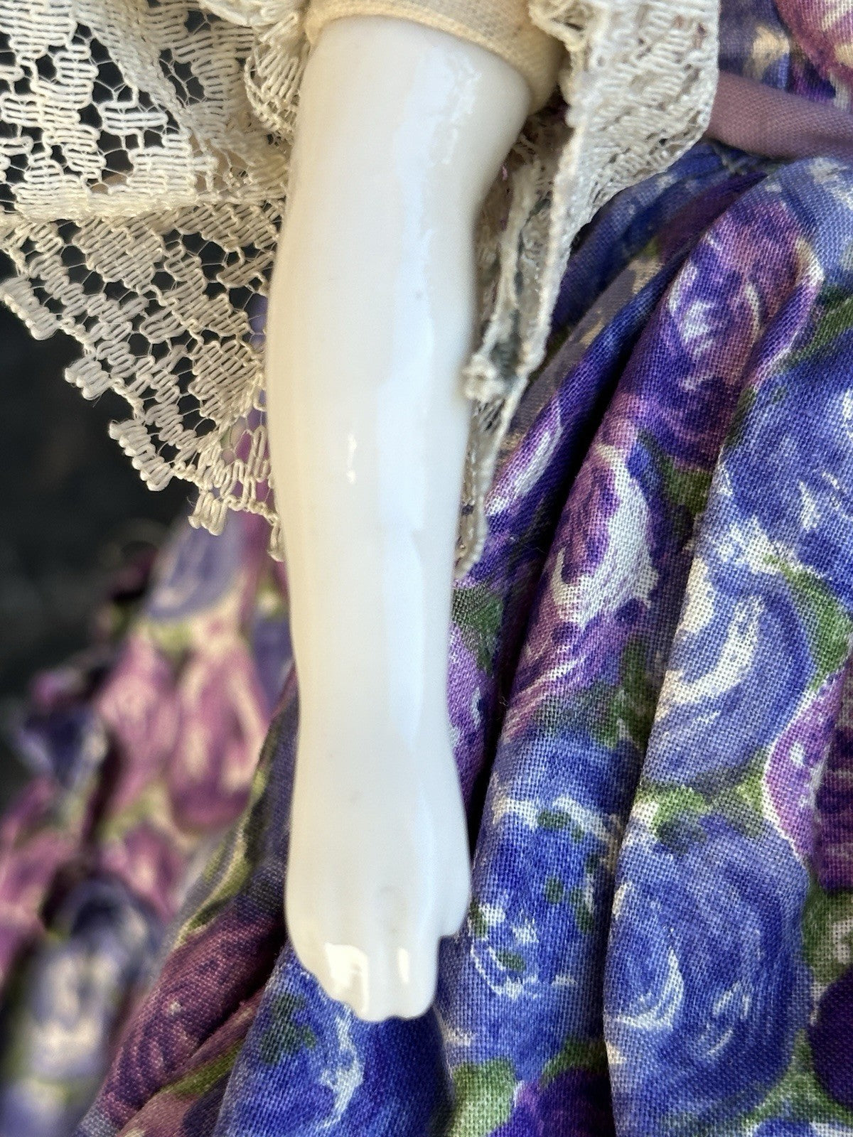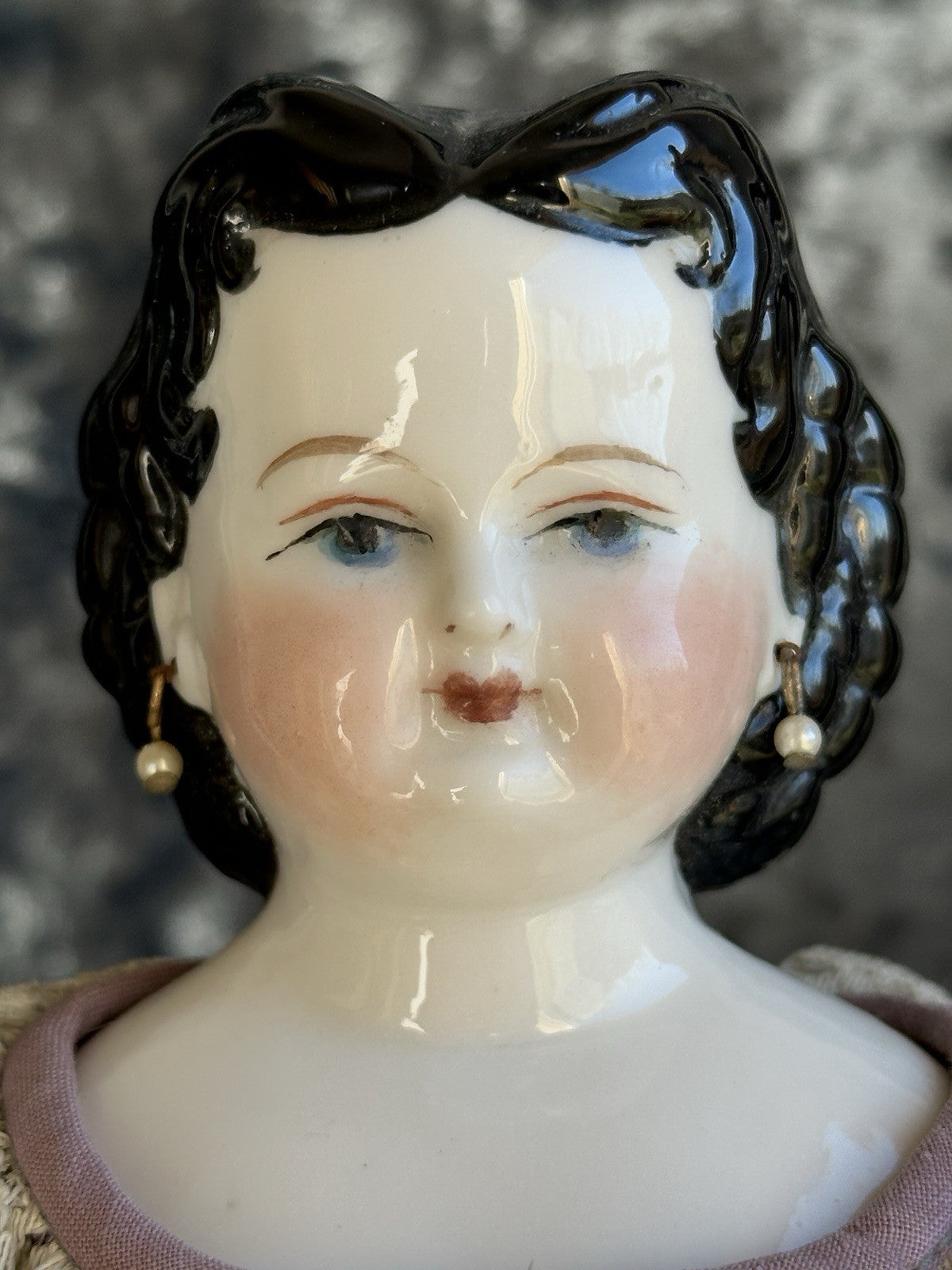 Very sweet doll with pierced ears. Her paint is not perfect, yet she is beautiful. The clothes are not removable unless unstitched. The body is tightly stuffed. Lower arms are legs are porcelain. No damage to the doll.