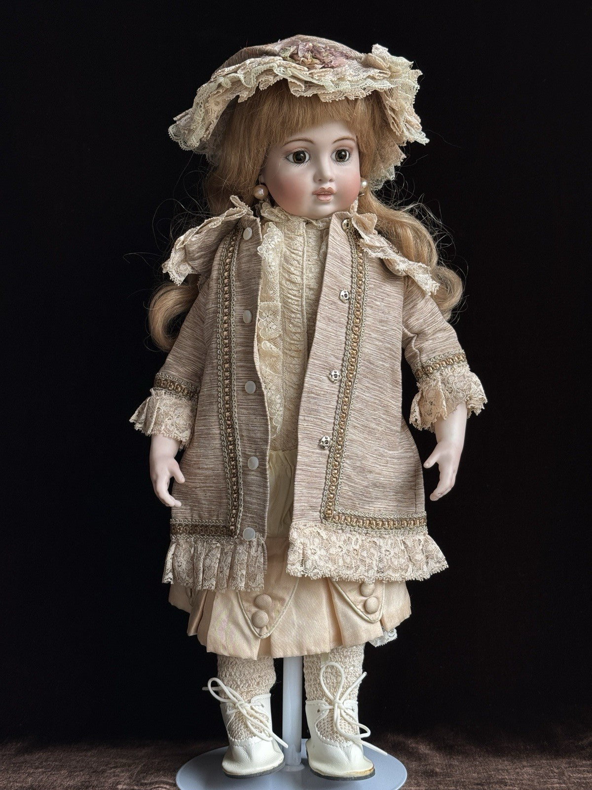 Very beautiful, professionally made doll, signed and dated. The doll is in very good condition with no damage noted. The only flaws are some glue residues from hand work. She comes with a human hair wig with fringe, a beautiful dress, and a jacket with a matching hat. The doll also includes pantaloons and hand-crocheted stockings. No other underwear is included. There are some glue residues on the shoes and light wear to the hat. The dress and jacket are in great condition.