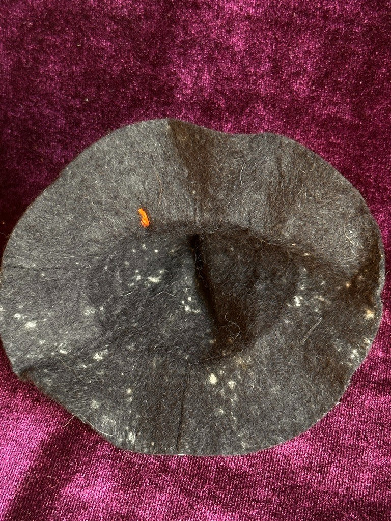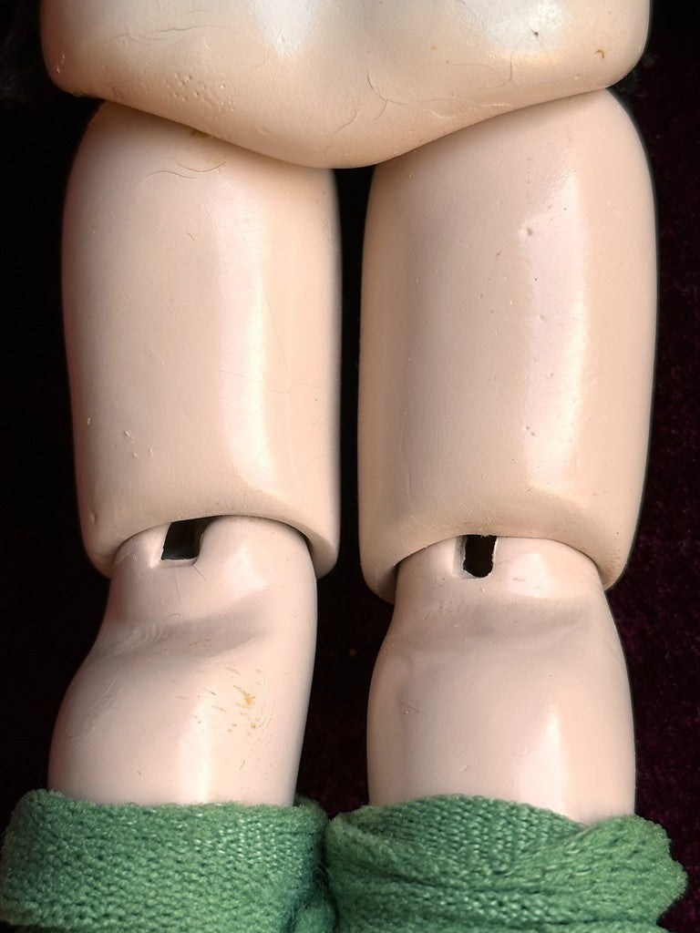 Two fingers on the left hand are broken and missing. The doll is dressed as shown; her clothing is in overall good condition, with some discoloration and stains to the hat. The shoes also show some wear.
