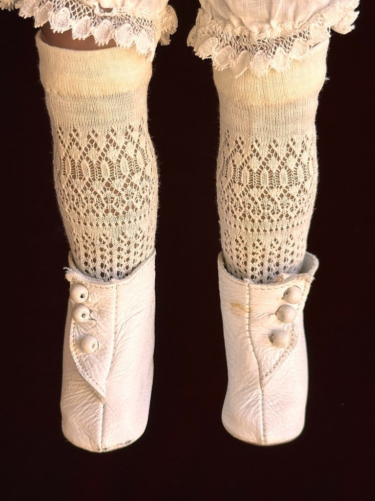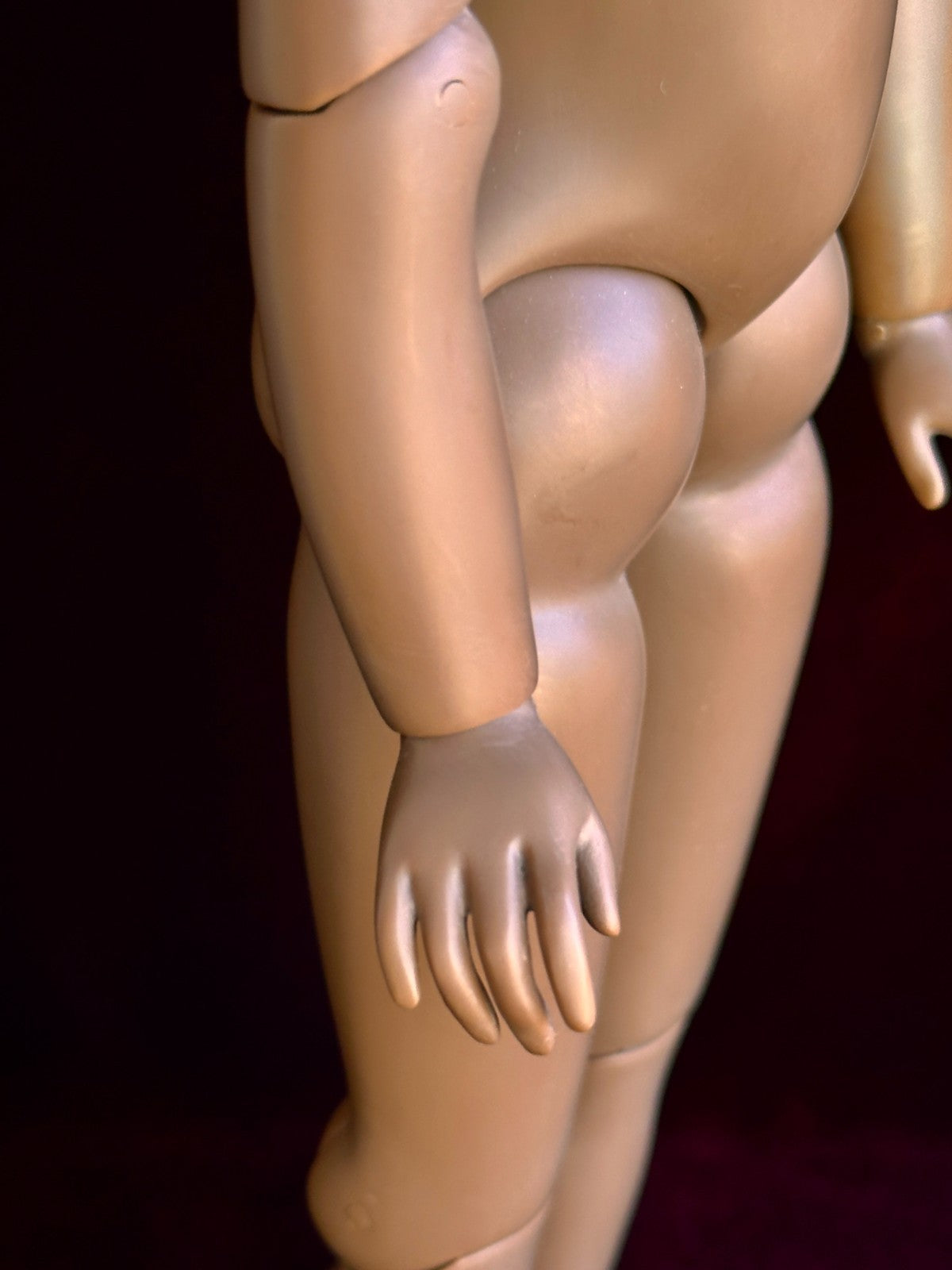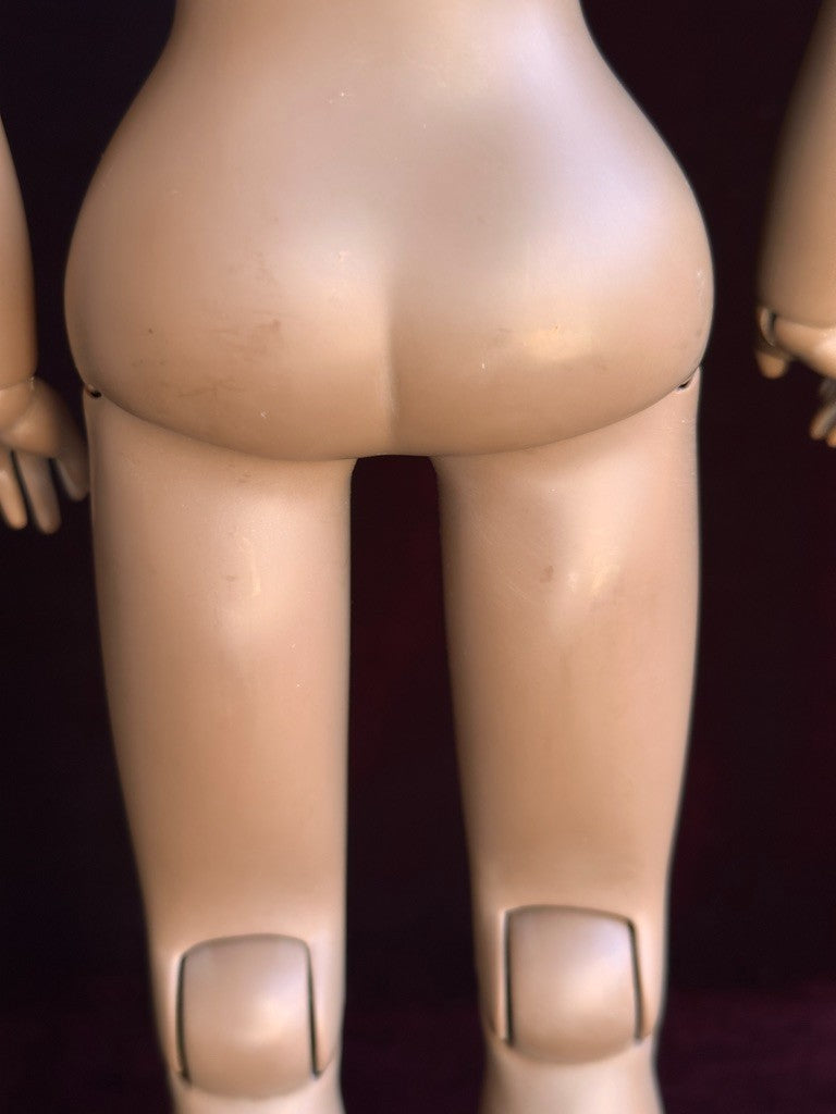 Absolutely gorgeous 15" tall doll! She is a well made replica and is in a good condition. There is light wear to the resin body parts. All parts of the doll are well connected and move properly, however the left arm is moving not as smoothly as is supposed to be. The doll is dressed as shown. There are holes and tears to the pantaloons. Some glue residue to her leather shoes. The pictures are an important part of the descriptions and show all the wear.