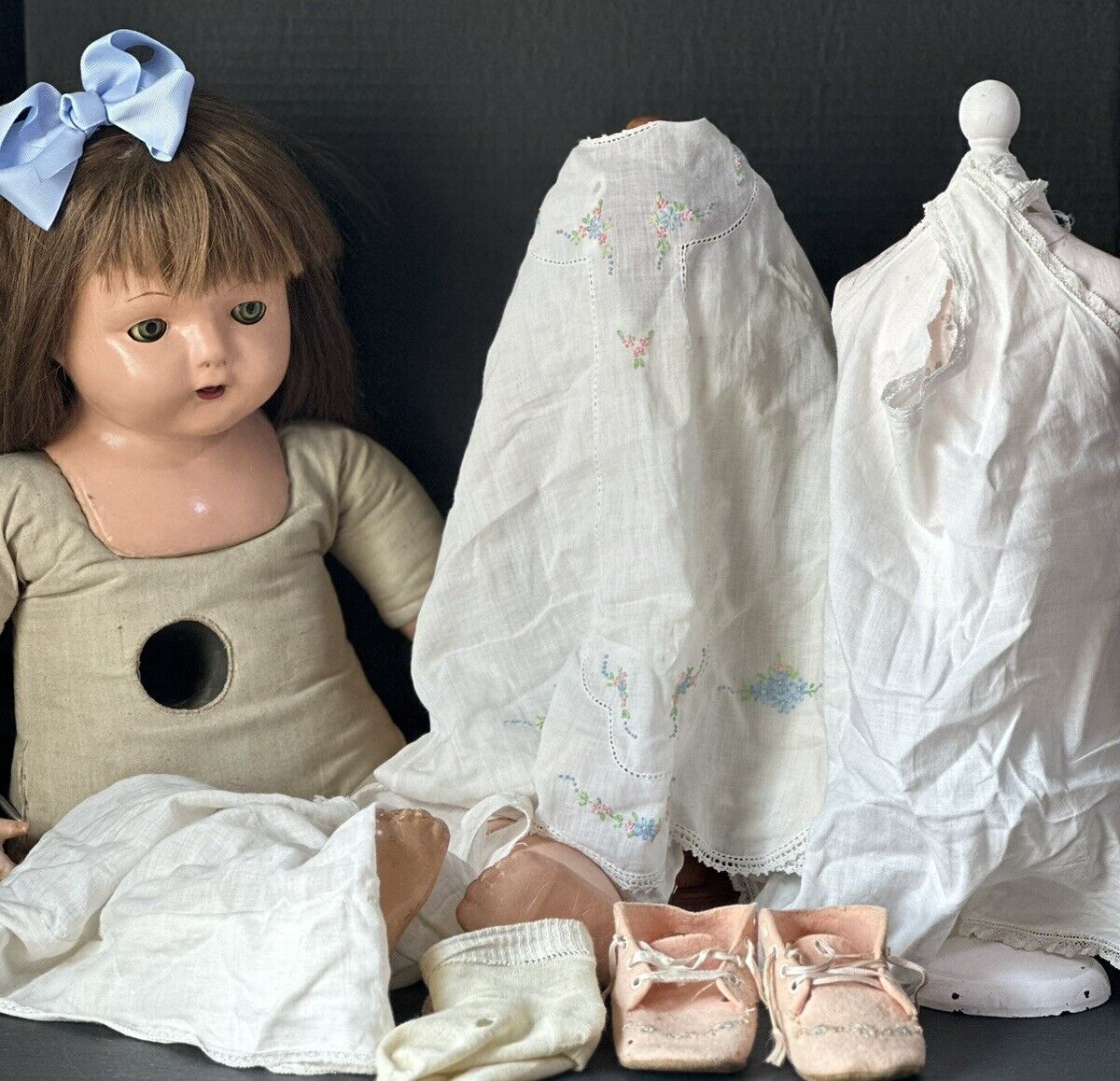 Rare find!!! This talking doll was created by Averill Mfg/Madame Hendren and was first advertised in "Toys and Novelties" of July 1922. She is about 27" tall!! Unfortunately, her talking mechanism is not working. She has a cloth torso with "rekord" mechanism within torso which operates from handwind at side torso - see photos.