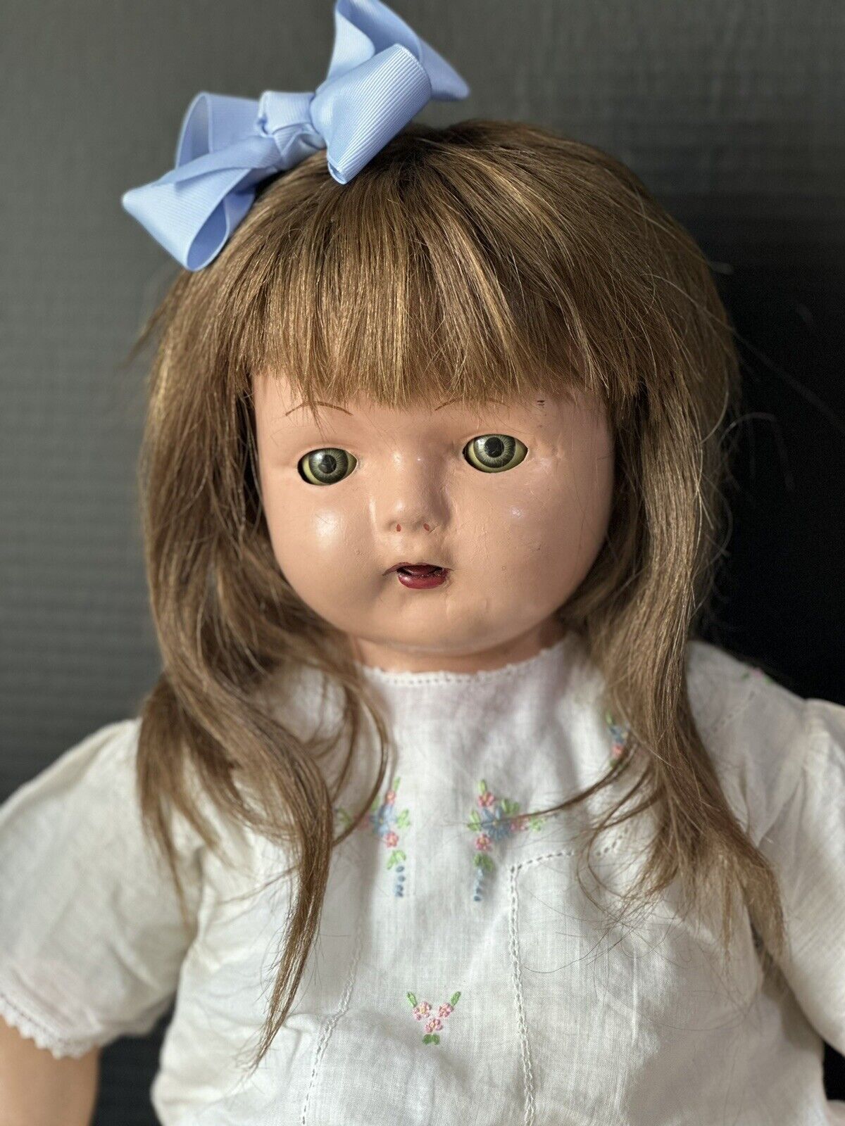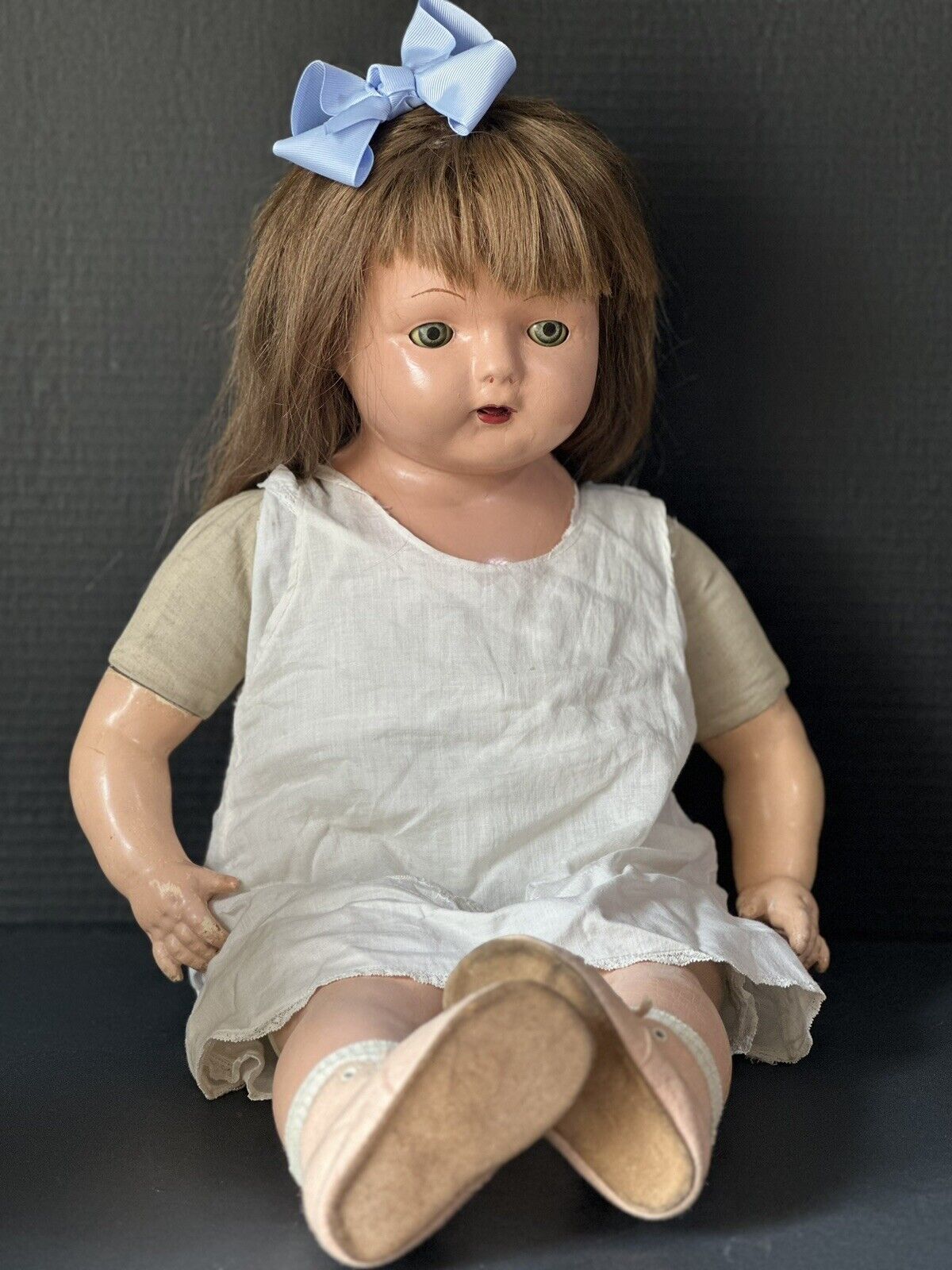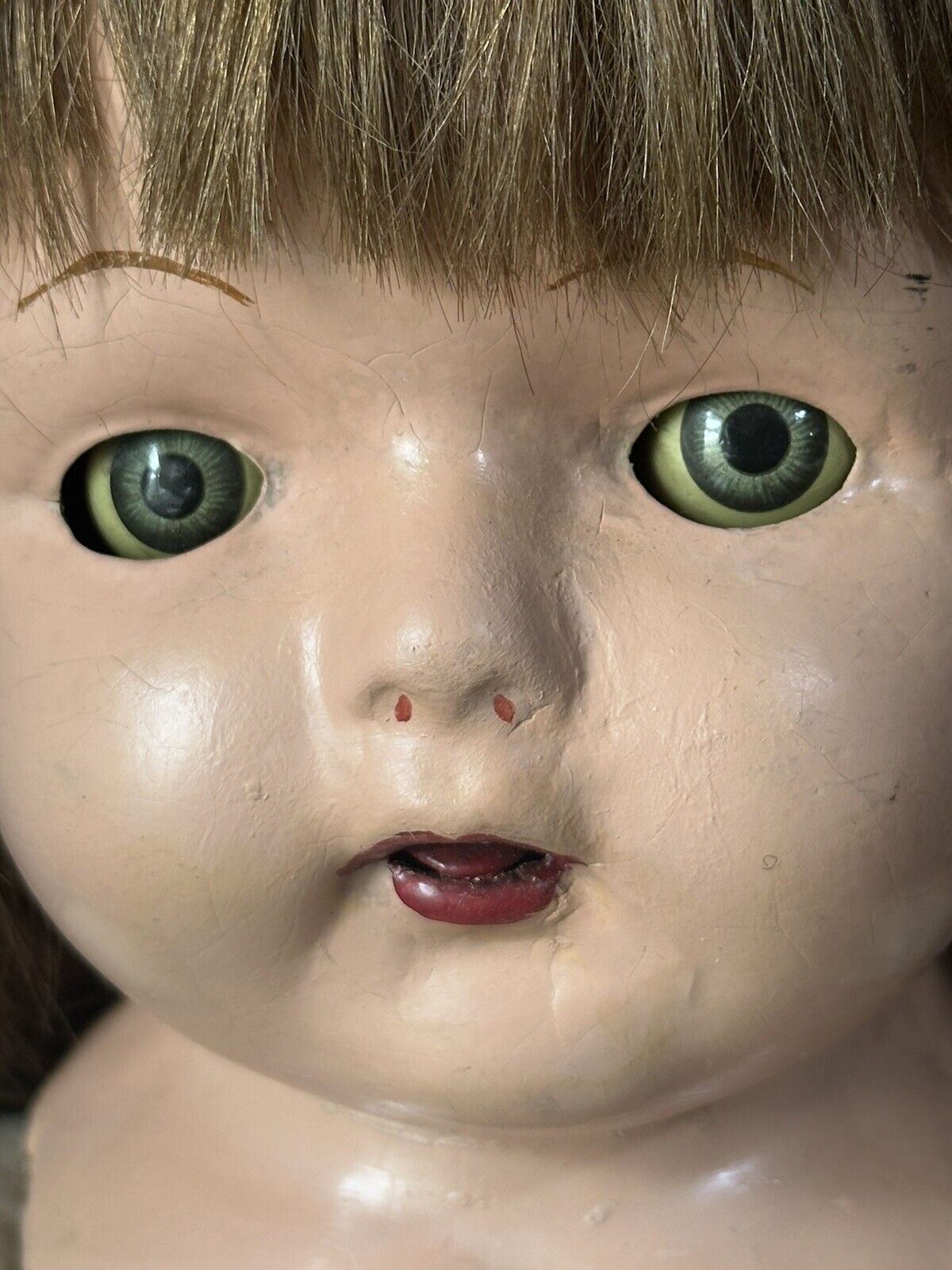 Composition shoulderhead, partial extremities. Cloth stuffed body. Her composition parts seem to be repainted. Green sleepy eyes, painted brows, open mouth with teeth. Light brown human hair wig is glued to her head. Stains are present to her cloth body.