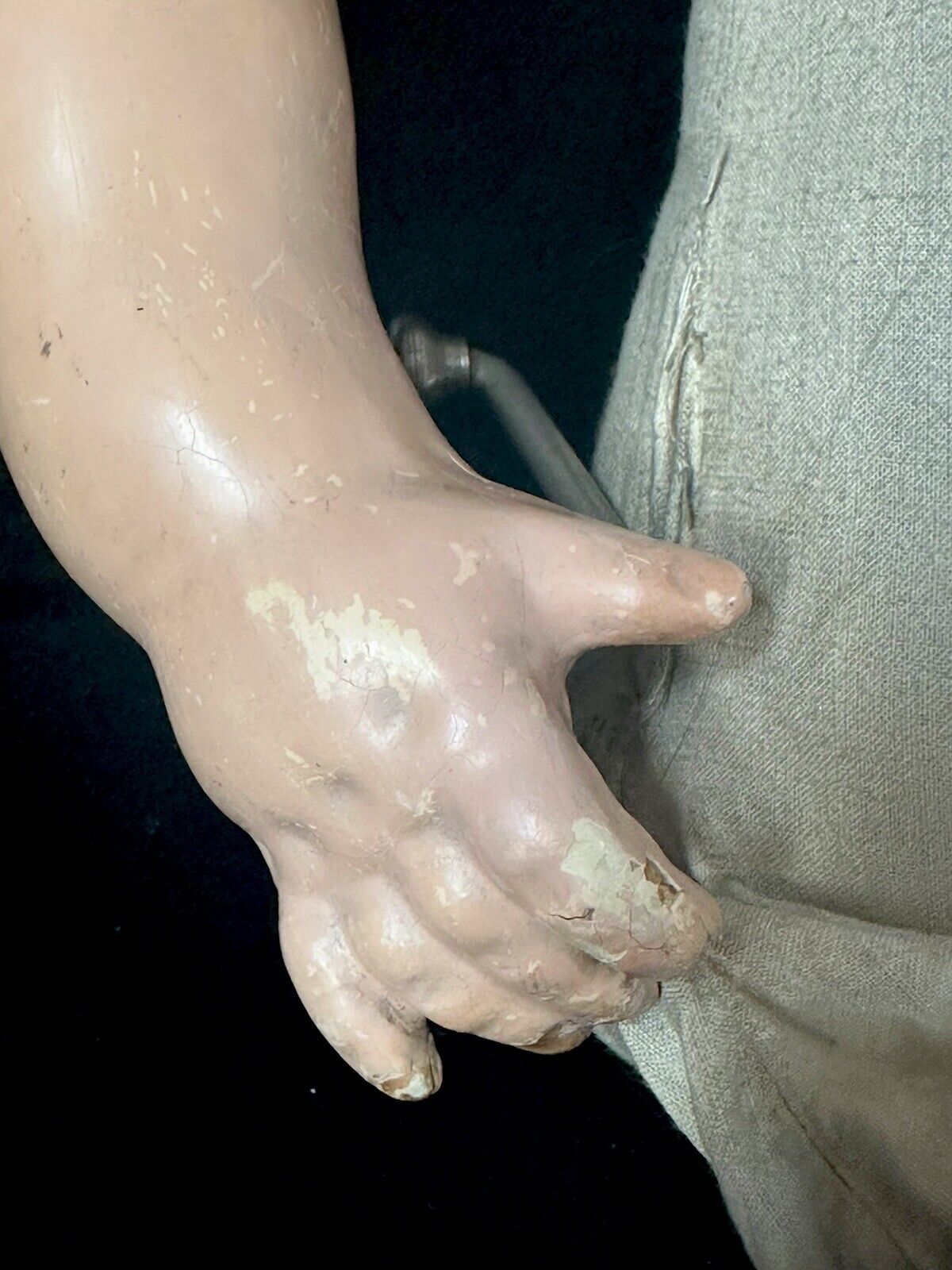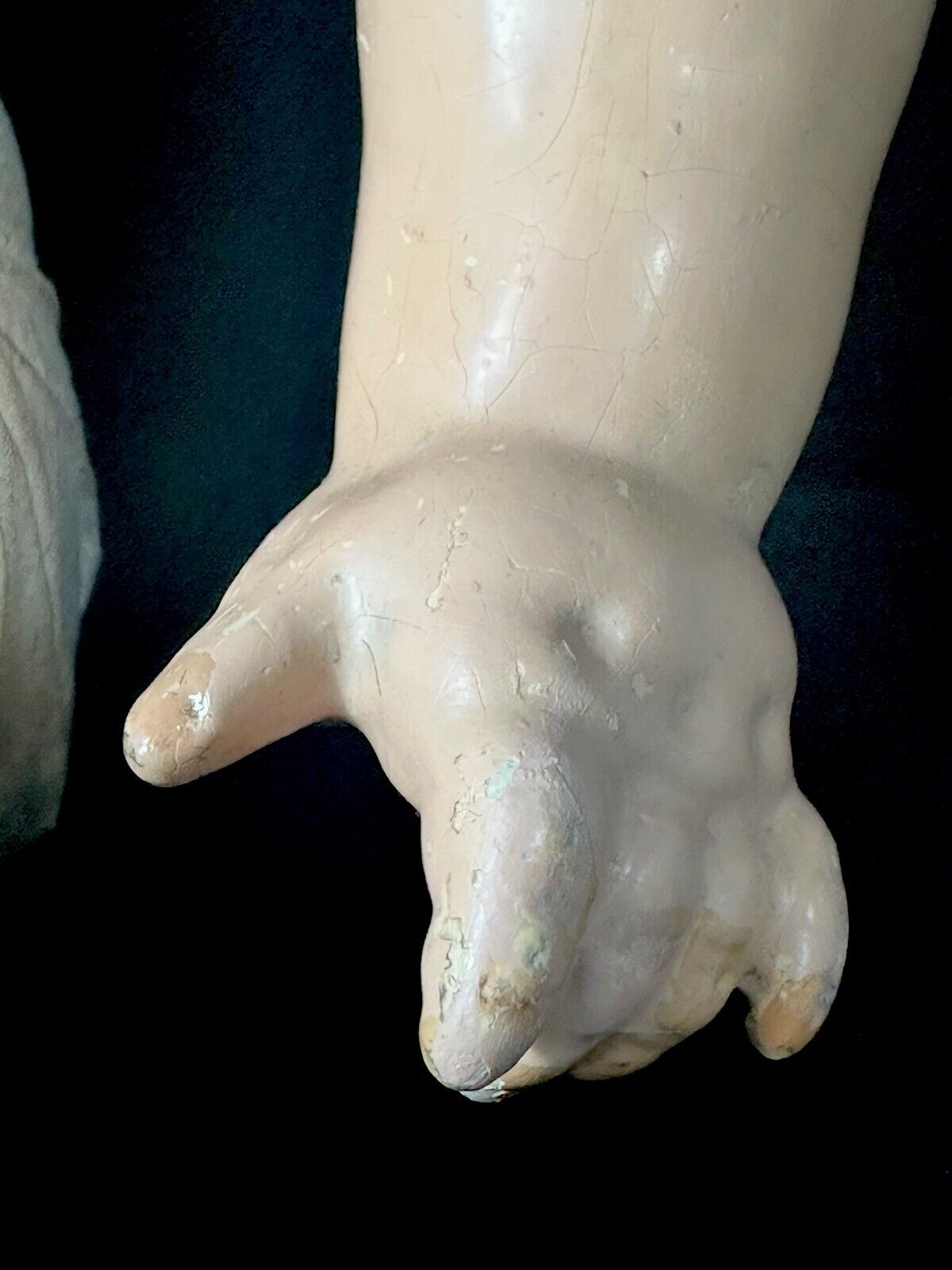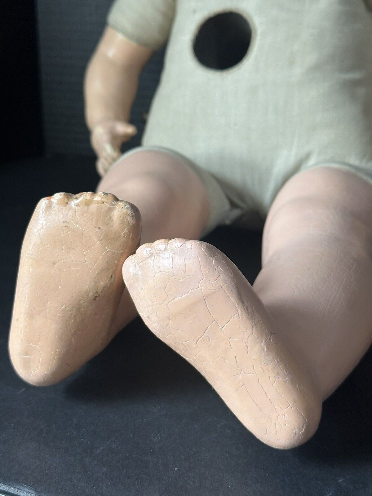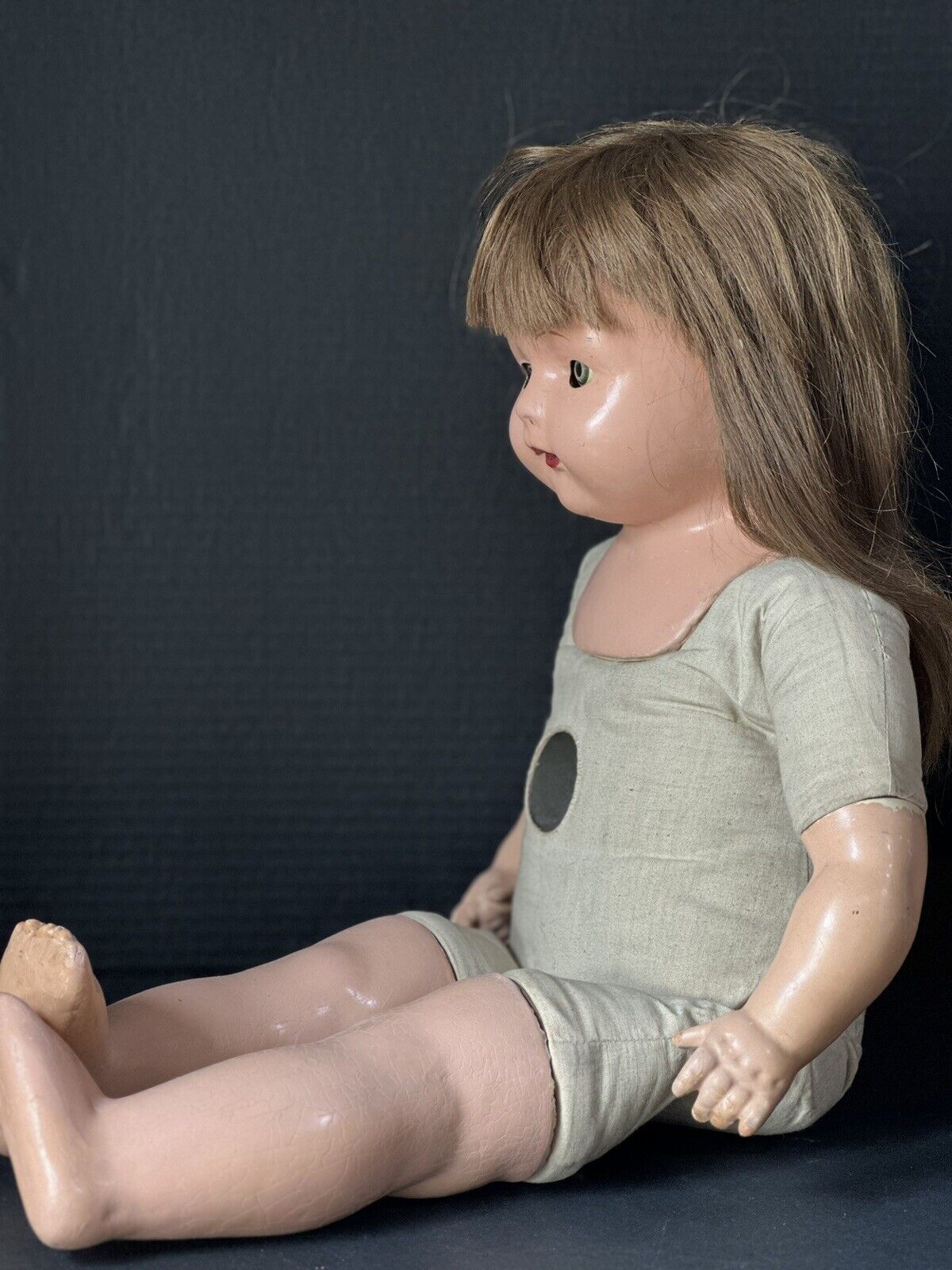 Composition shoulderhead, partial extremities. Cloth stuffed body. Her composition parts seem to be repainted. Green sleepy eyes, painted brows, open mouth with teeth. Light brown human hair wig is glued to her head. Stains are present to her cloth body.