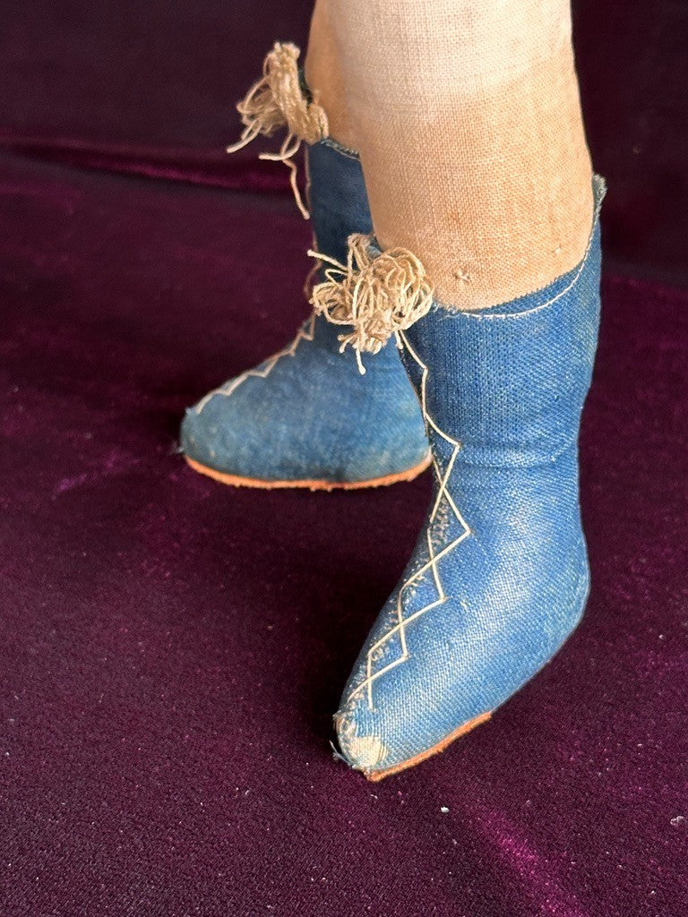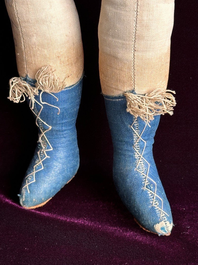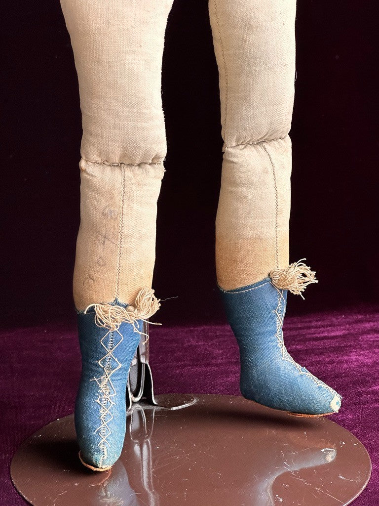 The lady is coming with a gorgeous outfit. The doll has two-piece underwear but no pantaloons. The outfit has small imperfections that can be seen in the photos. It appears to be antique or early vintage.