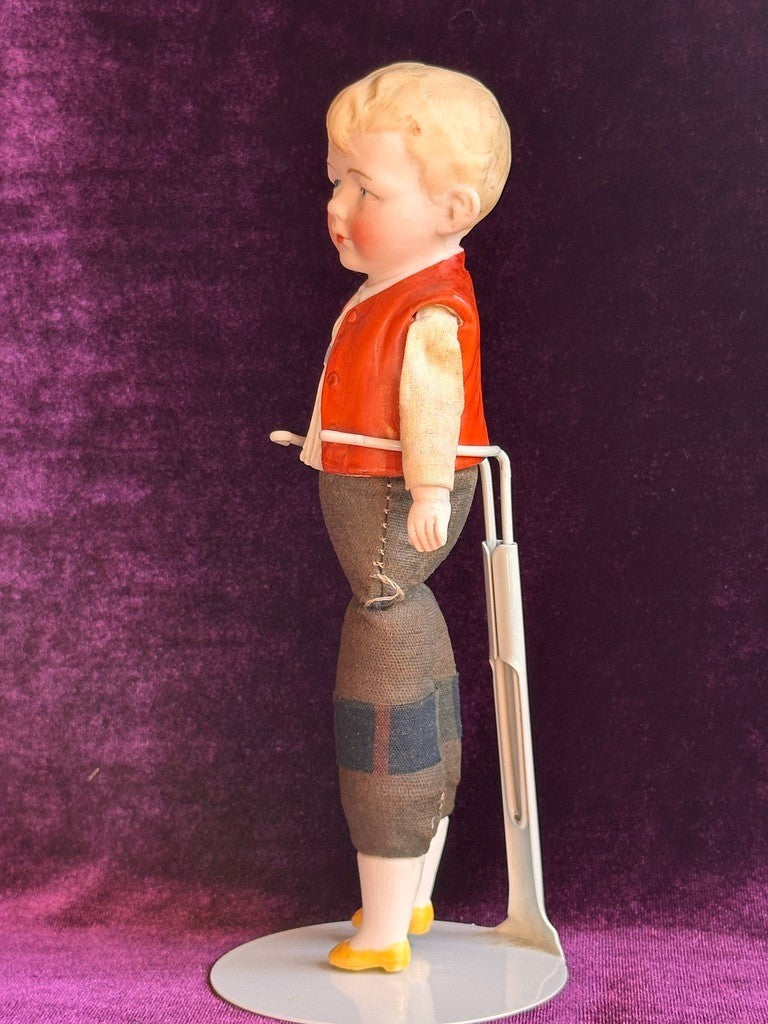 Very rare doll with molded hair and top clothes. The rest of the body is cloth with lower bisque arms and legs. This adorable little guy is in great condition. There is a small flaw to his chin, which looks like a production defect. There are also paint flaws to his hair and a small flaw to his neck, which also look like production defects. The doll has no damage and no leaking. Please refer to the pictures for more details. No stand included.