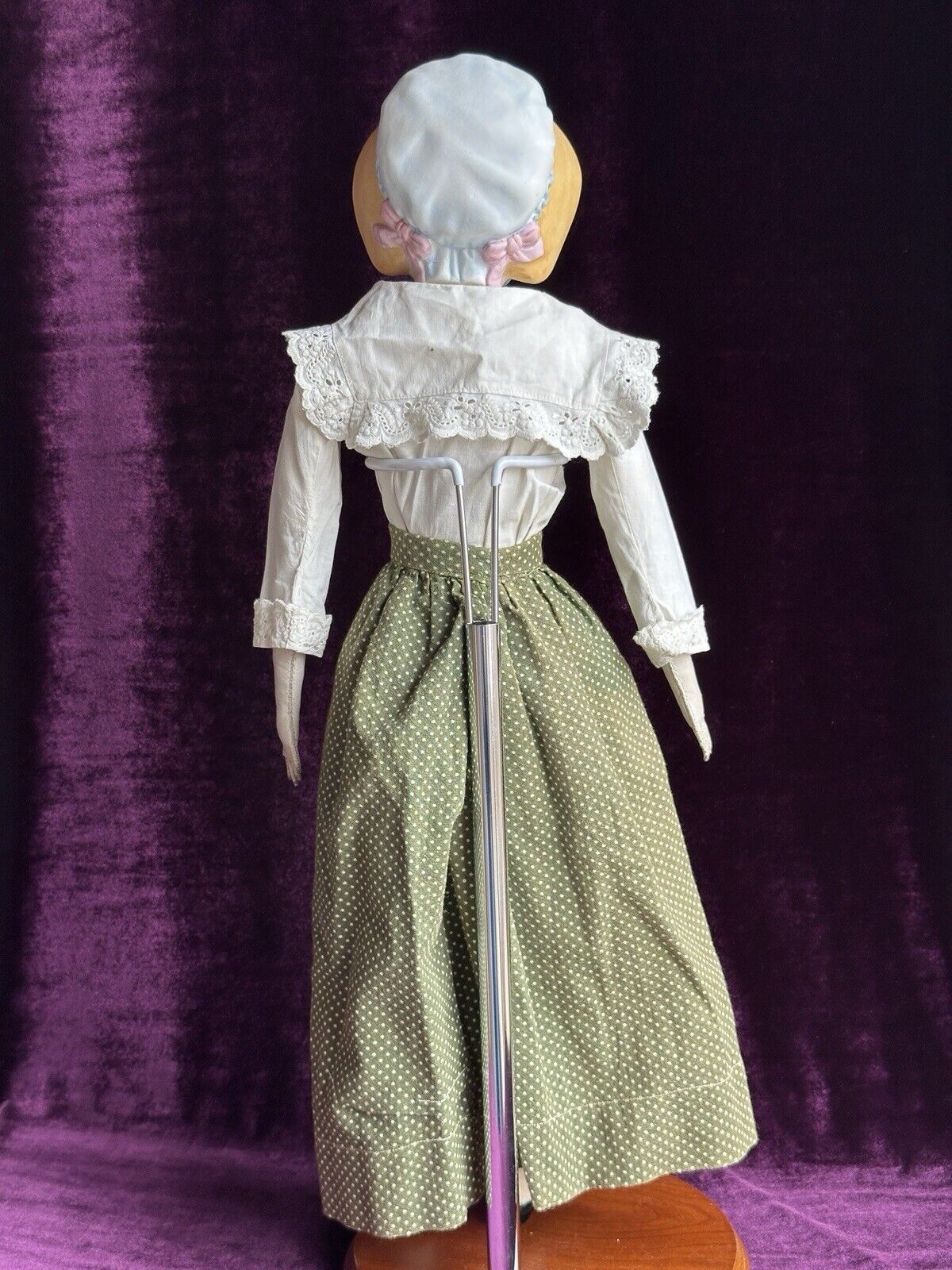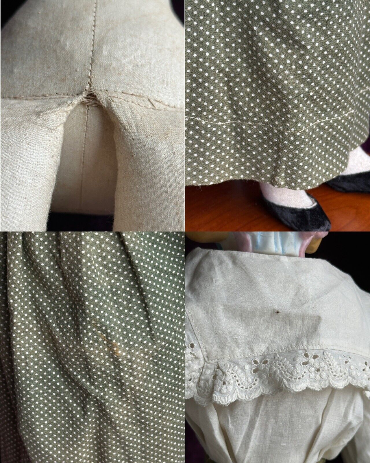 The body is possibly a later replacement. It is in overall good condition. It is tightly stuffed. The doll is coming dressed as shown on the photos. She has pantaloons, but has no other underwear. Please refer to the pictures for more details. No stand to the doll.