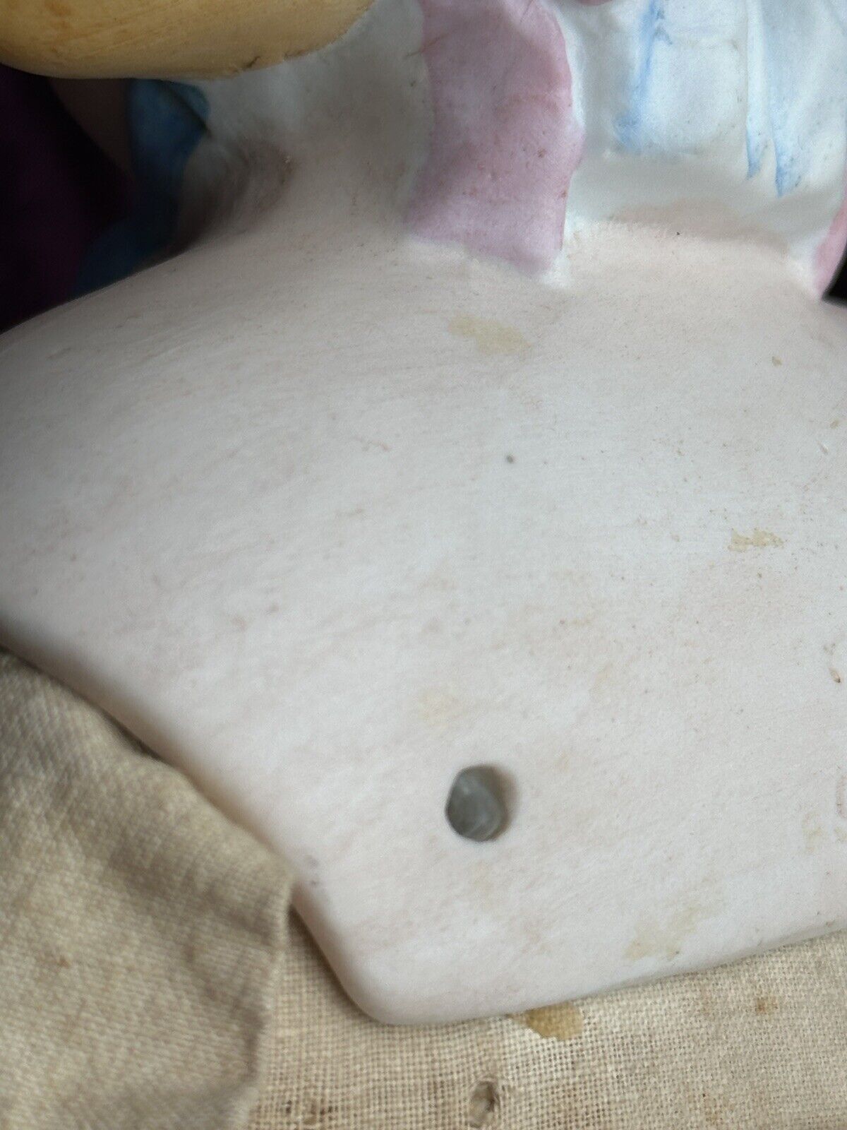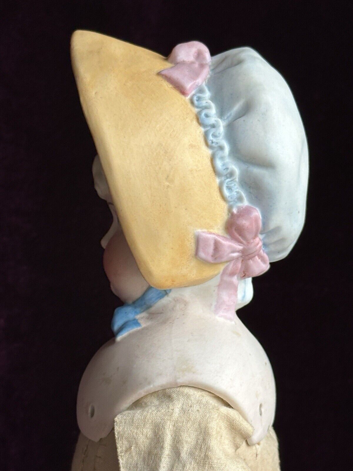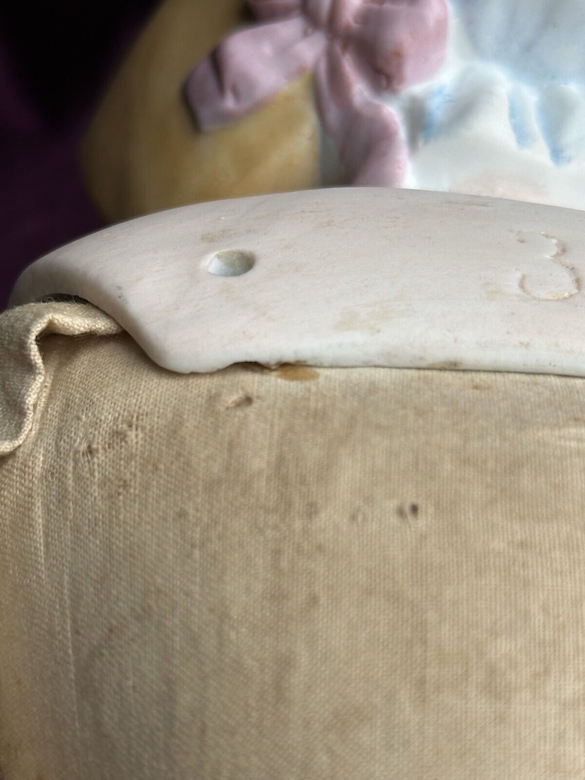 Very unique and hard to find doll. She is marked 3A. The shoulder plate has some tiny chips to the edge. There is a small chip or production defect to the bonnet. There are some other small flaws to the shoulder head, but none of them looks like damage, rather these are production defects.