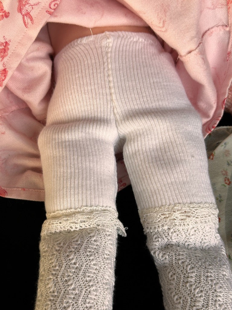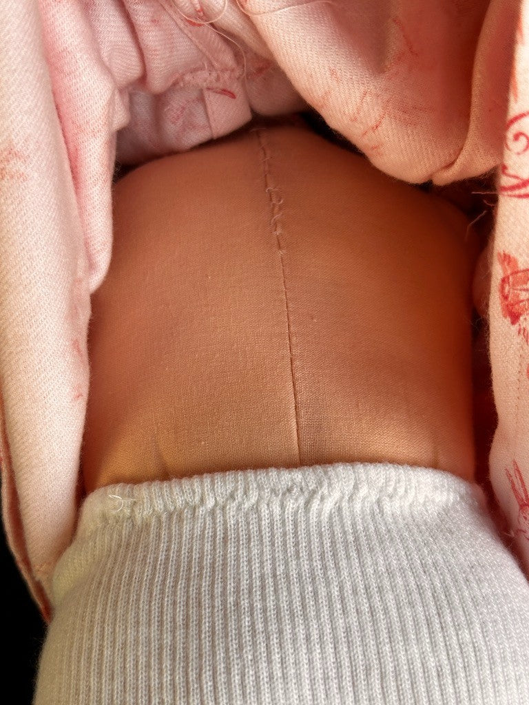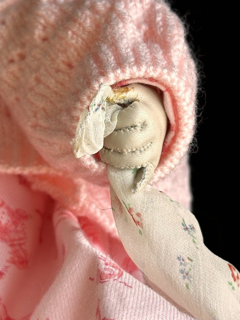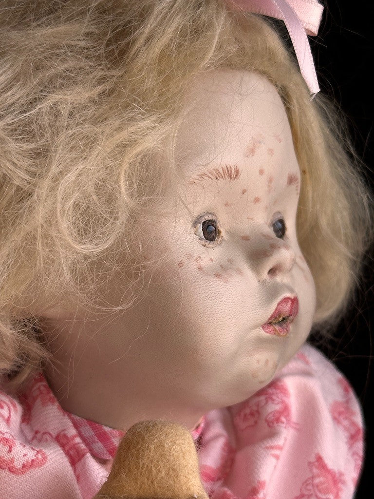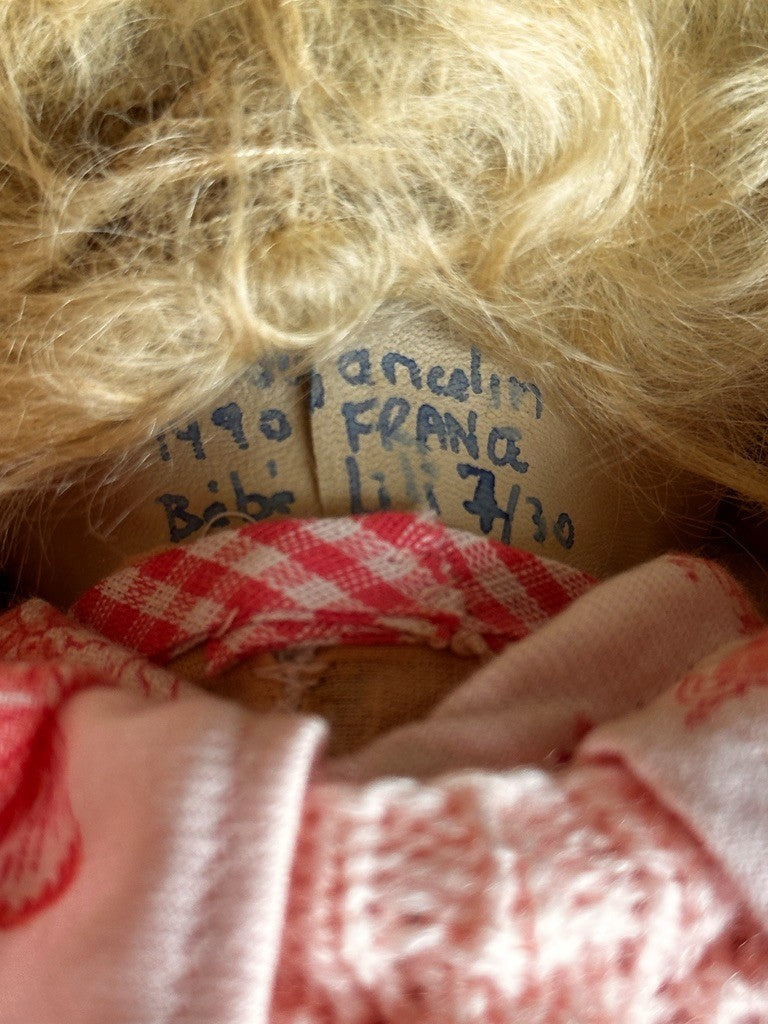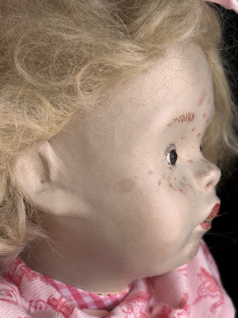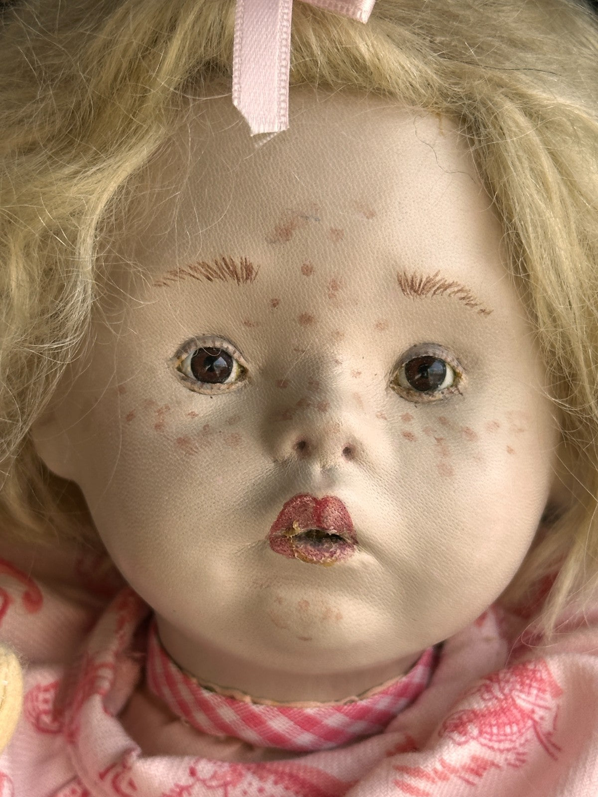 Very cute doll made by a well-known French doll artist. The head is hard with leather covering a firmer material. She has glass eyes and a soft body. The lower arms are leather, while the rest is cloth. The doll is likely best displayed in a sitting position. She is in a very good condition, but there are some small imperfections to her lips, look like glue residues. Small stain to the right side of the head, as well as some tiny stains to the face. Glue residue to the left hand.