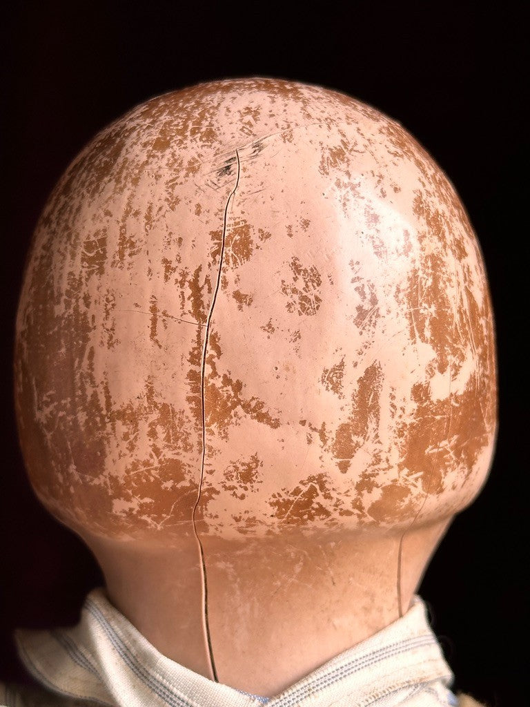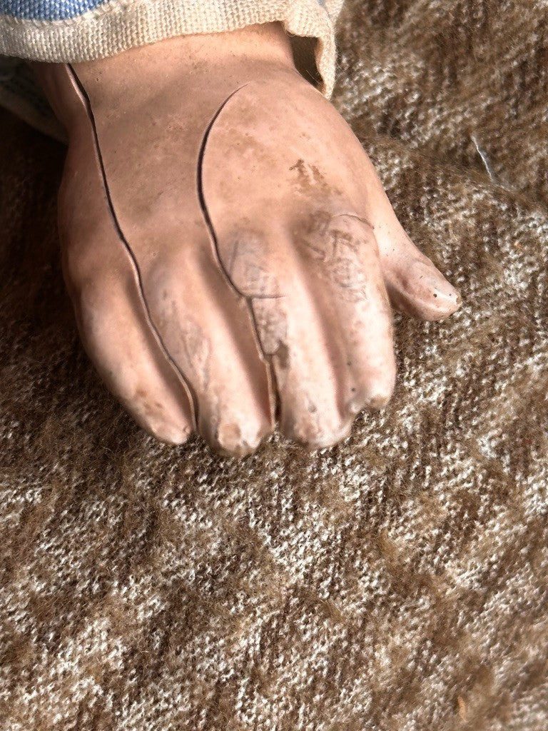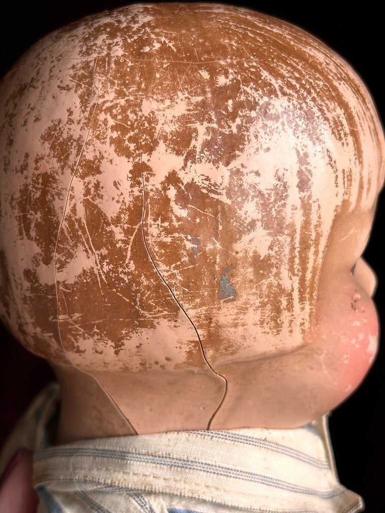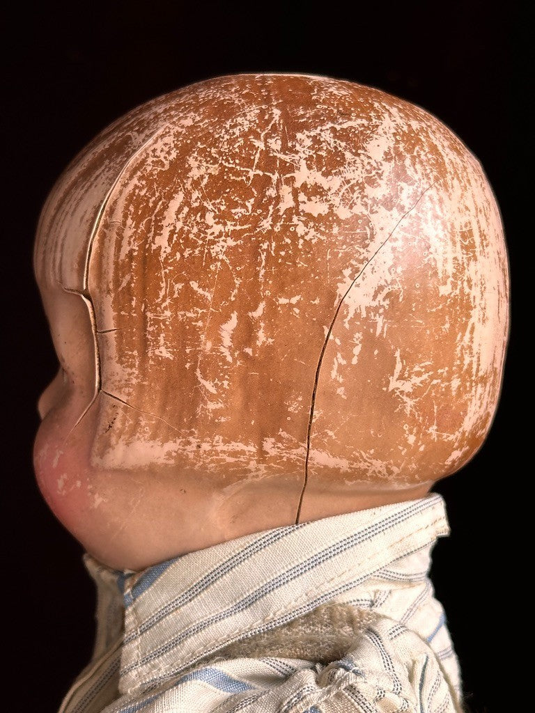 Here is a very hard to find doll that is all original. Unfortunately, the doll is worn. It has cracks, as shown in the photos. This includes cracks to the head and lower arms. The rest of the doll is cloth. The cloth portion seems to be in good shape, however, the clothes were not removed for full inspection.