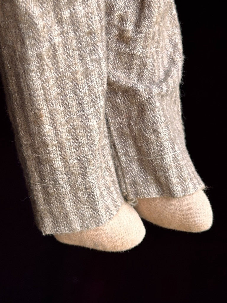 He is wearing original tagged outfit, which is well preserved and shows only discoloration and light wear.