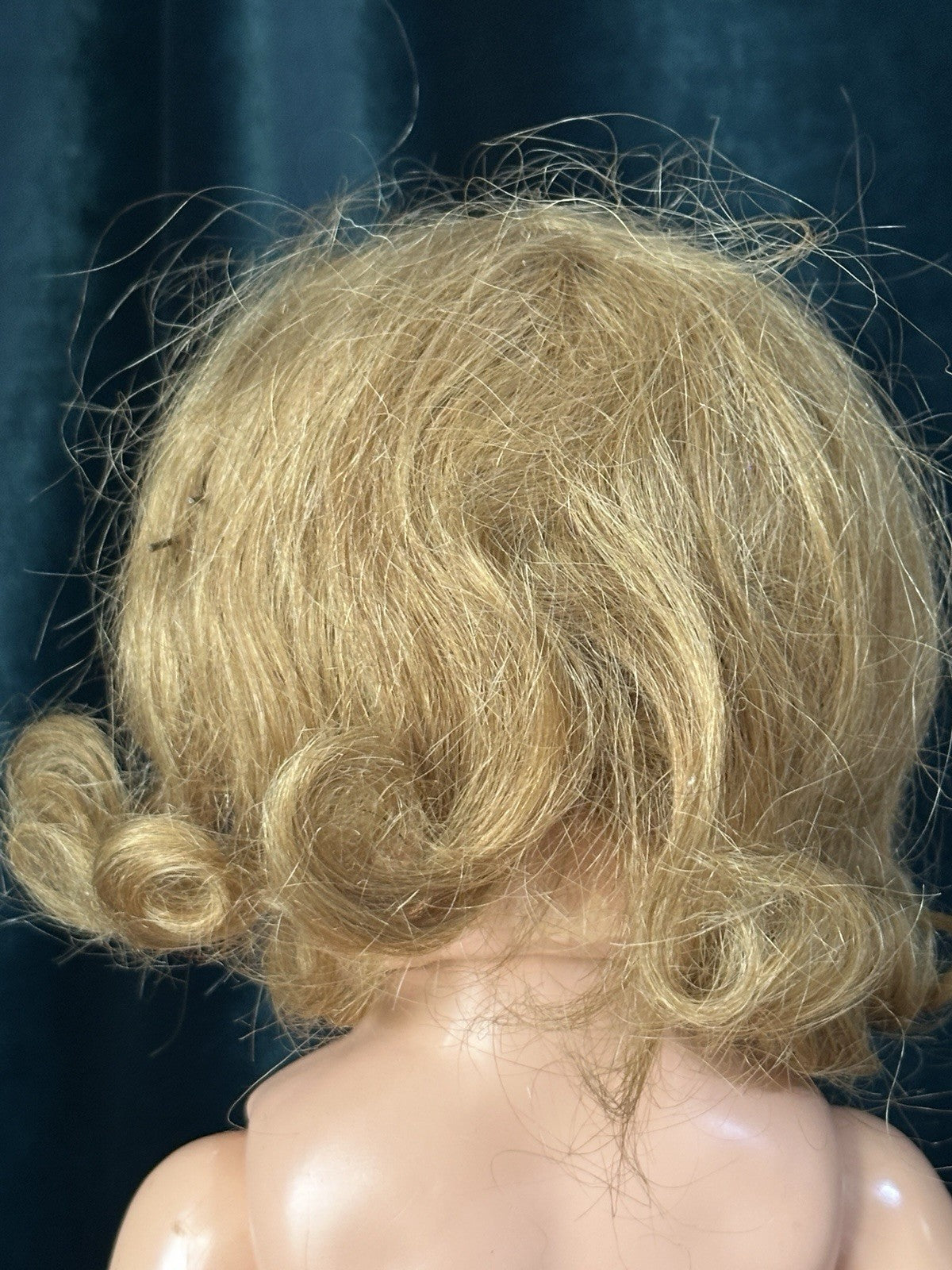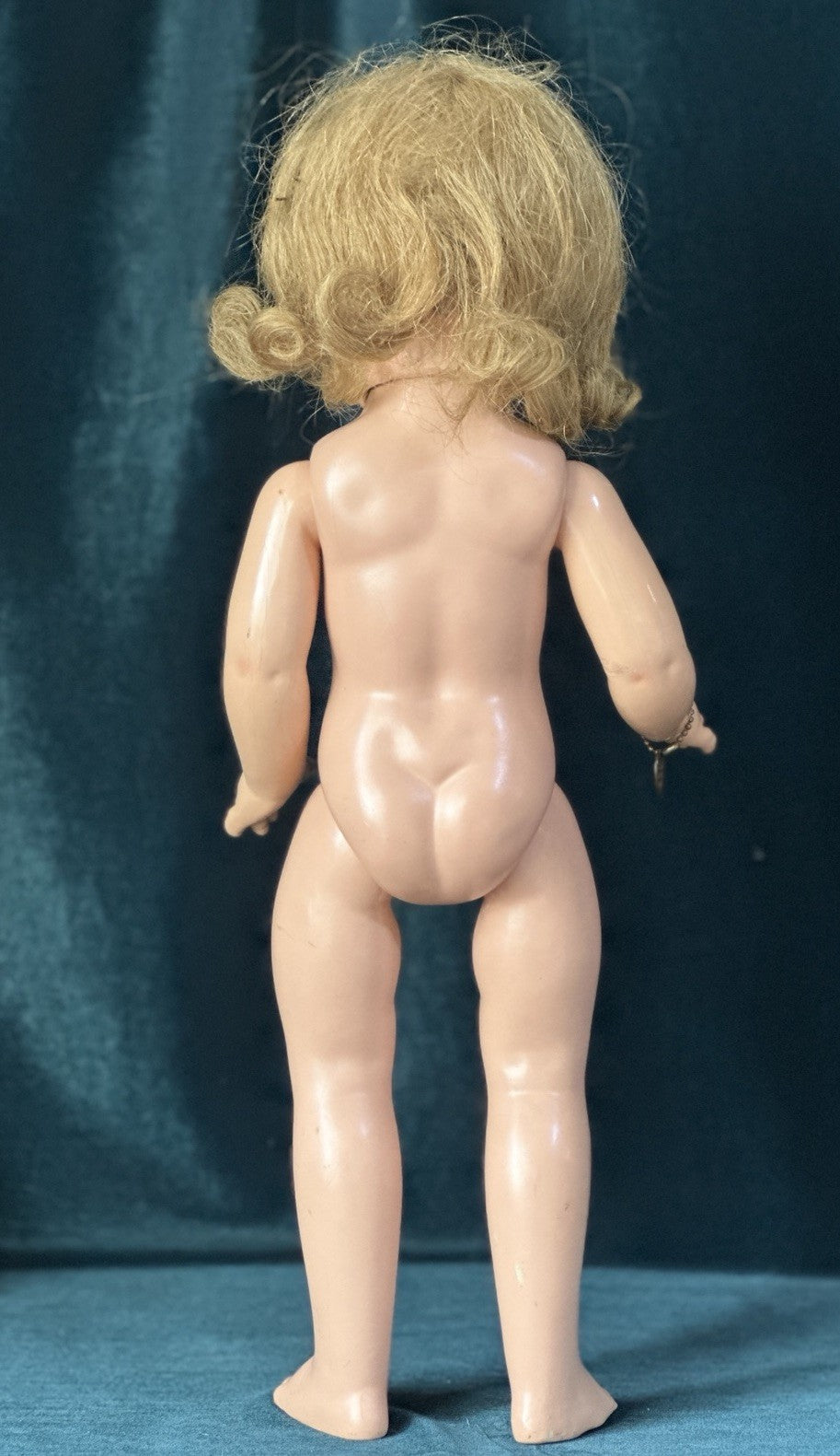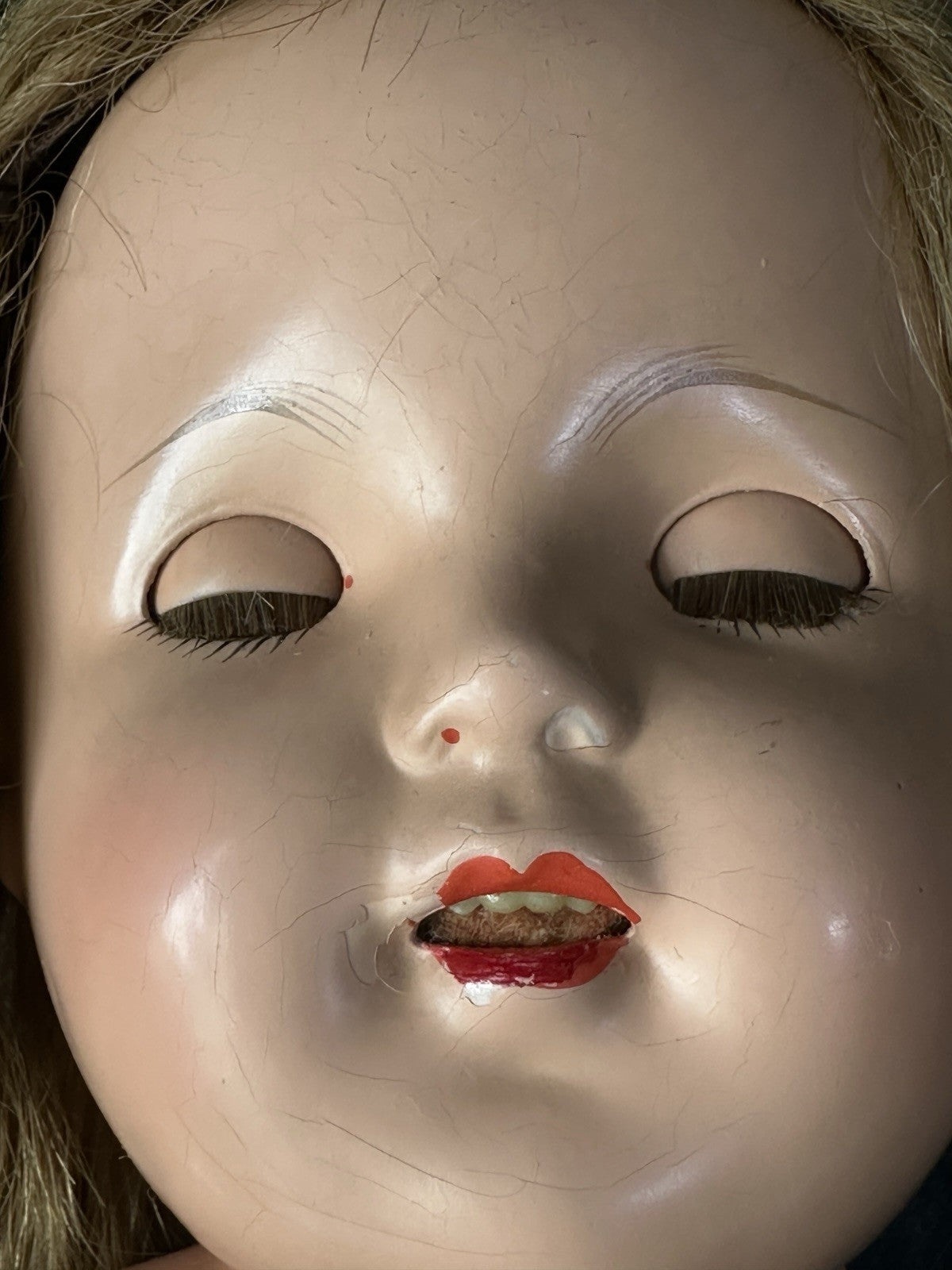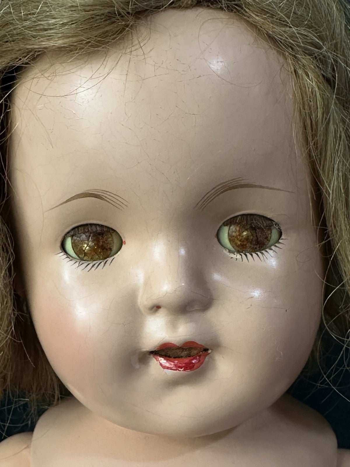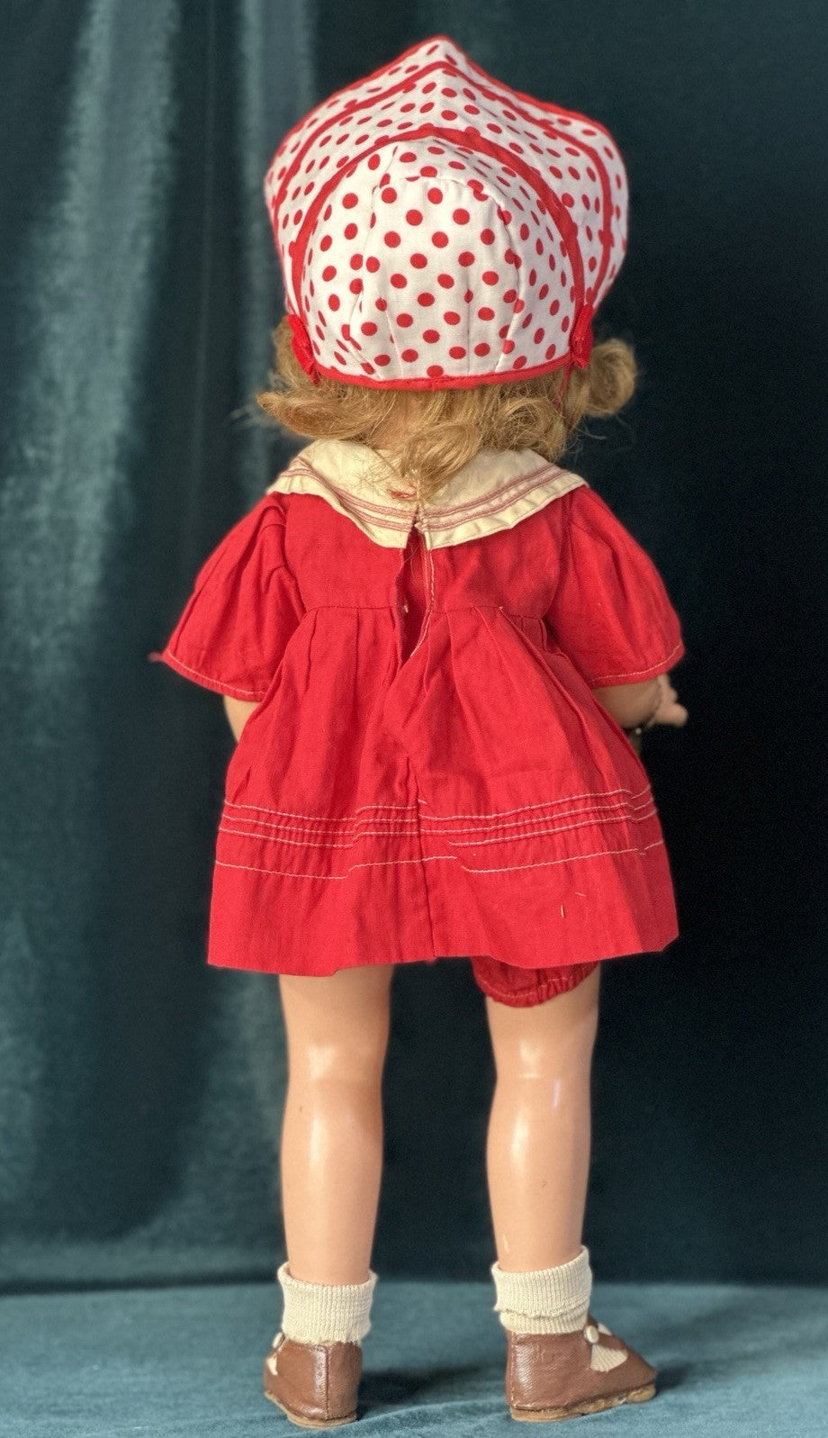 Hard to find doll by Effanbee all composition Mary Ann Lovums doll. Marked on the back of her neck. She is all composition. Sleepy eyes are cloudy. Lips seem to be painted. Some crazings, rubbed paint are present- see photos as they are part of the description. Her outfit is all original except the bonnet and repainted shoes. Stains and holes are present to all her clothes.