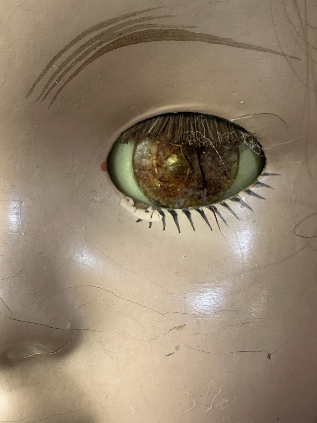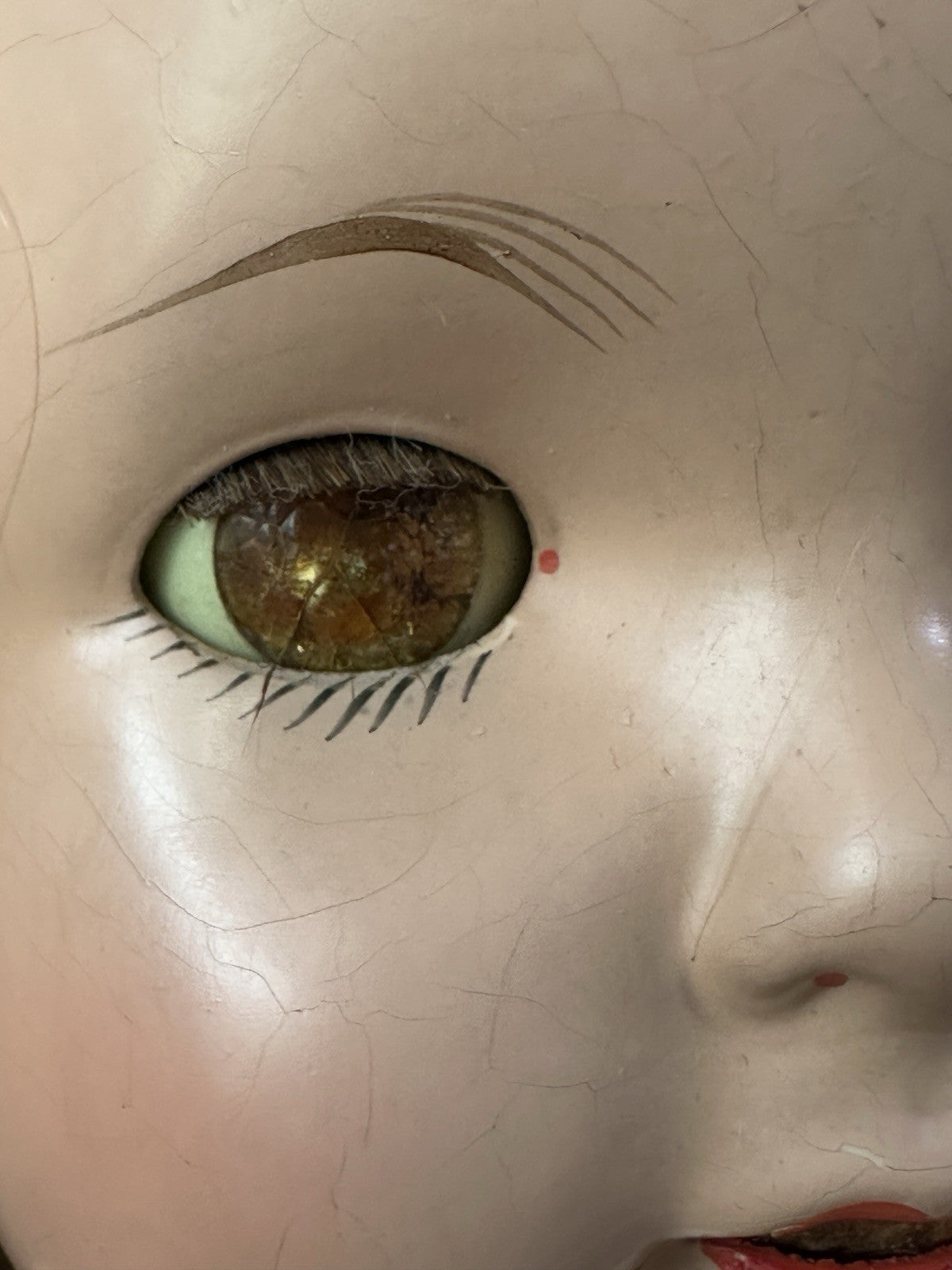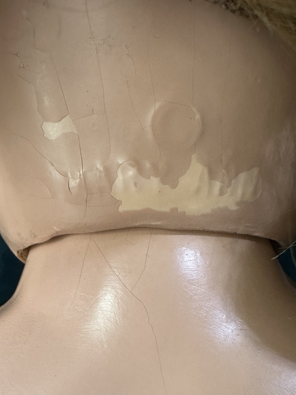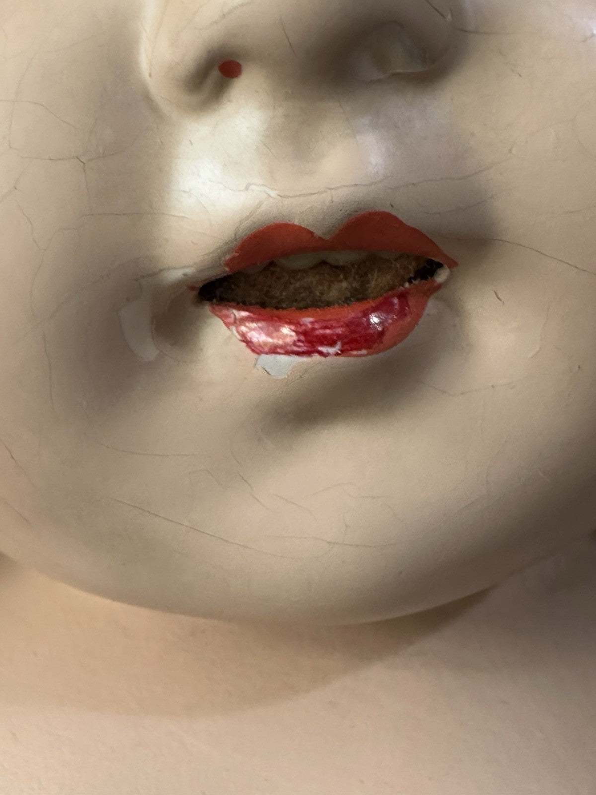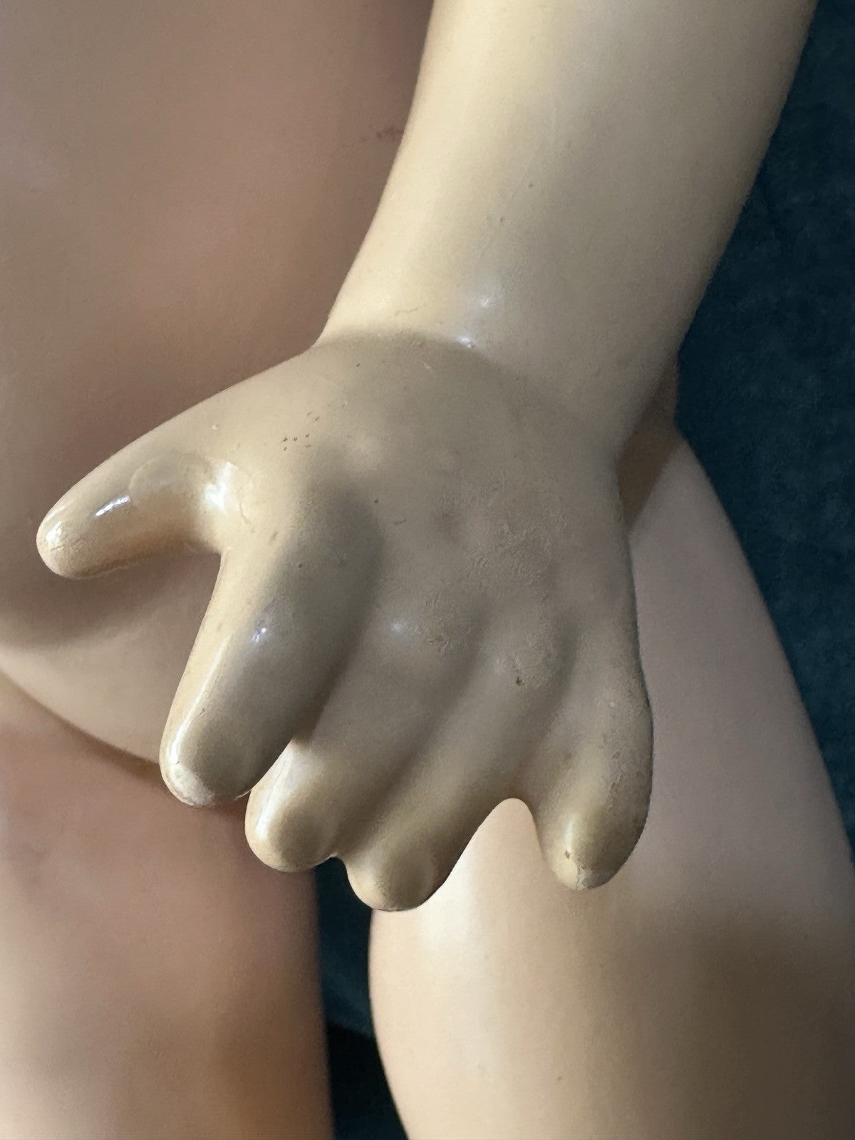 Hard to find doll by Effanbee all composition Mary Ann Lovums doll. Marked on the back of her neck. She is all composition. Sleepy eyes are cloudy. Lips seem to be painted. Some crazings, rubbed paint are present- see photos as they are part of the description. Her outfit is all original except the bonnet and repainted shoes. Stains and holes are present to all her clothes.