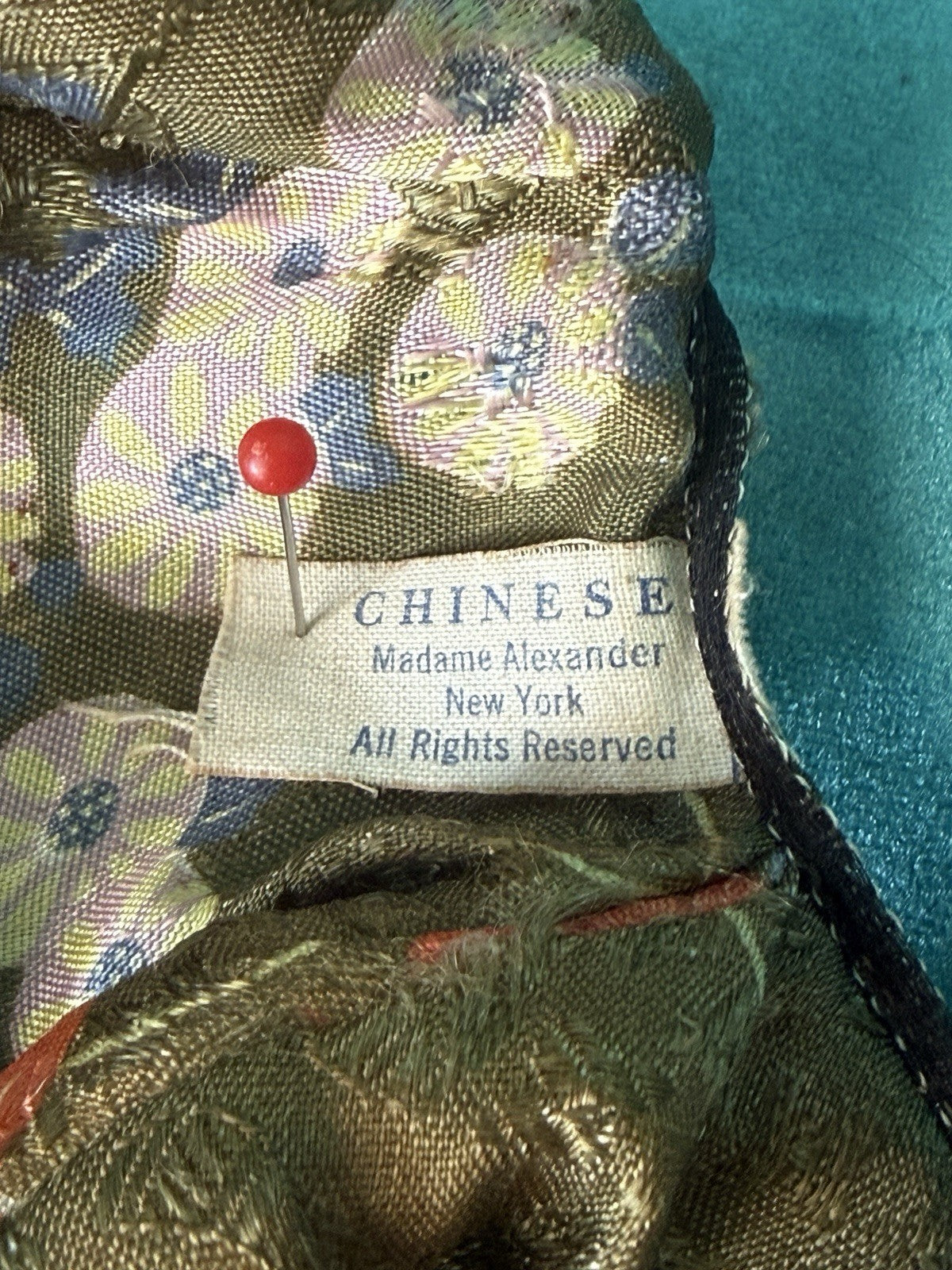 RARE vintage doll from 1936 that was produced by Madame Alexander company for one year only in 1936!! All composition with painted face features. She has a black mohair wig. Jointing at shoulders and hips, painted white stockings and black shoes. She is wearing traditional Chinese tunic over orange pants and elaborate orange and black headdress with floral appliques. Stand is not included. Comes with a tiny snake toy (new; not original to this doll).