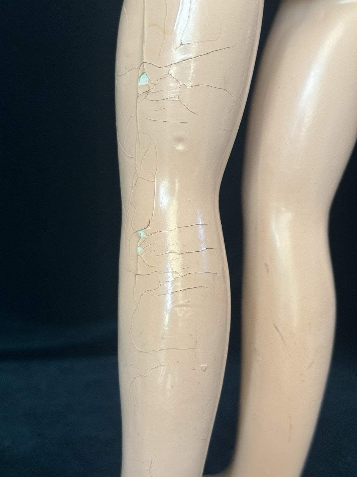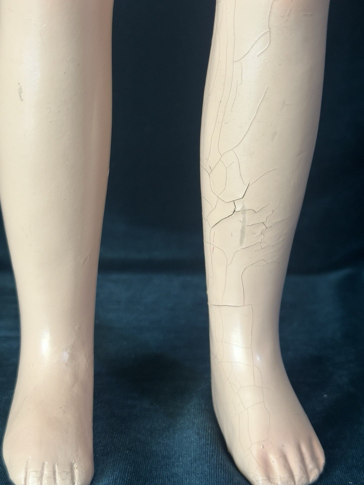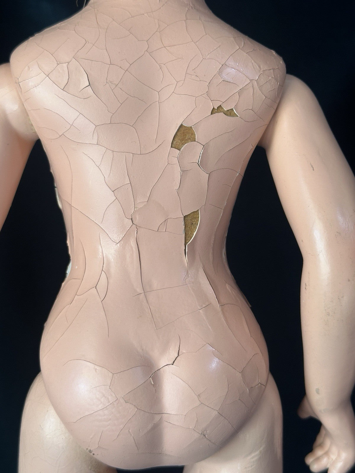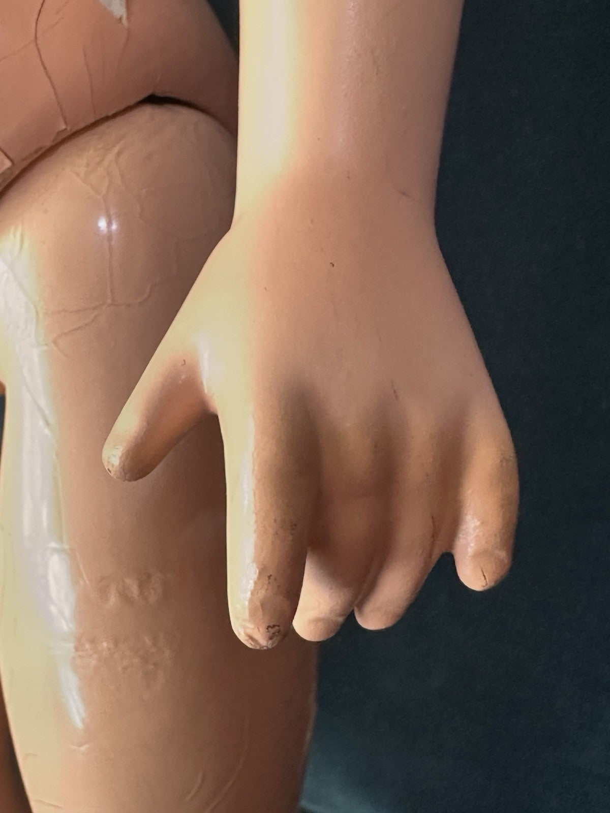 She is all composition. Measures about 20" tall. Crazings, flaking and rubbed paint are present to her face and body - see photos. Painted eyes.