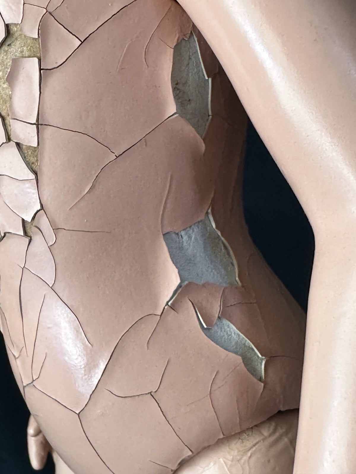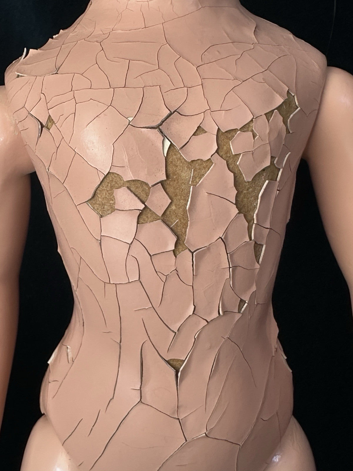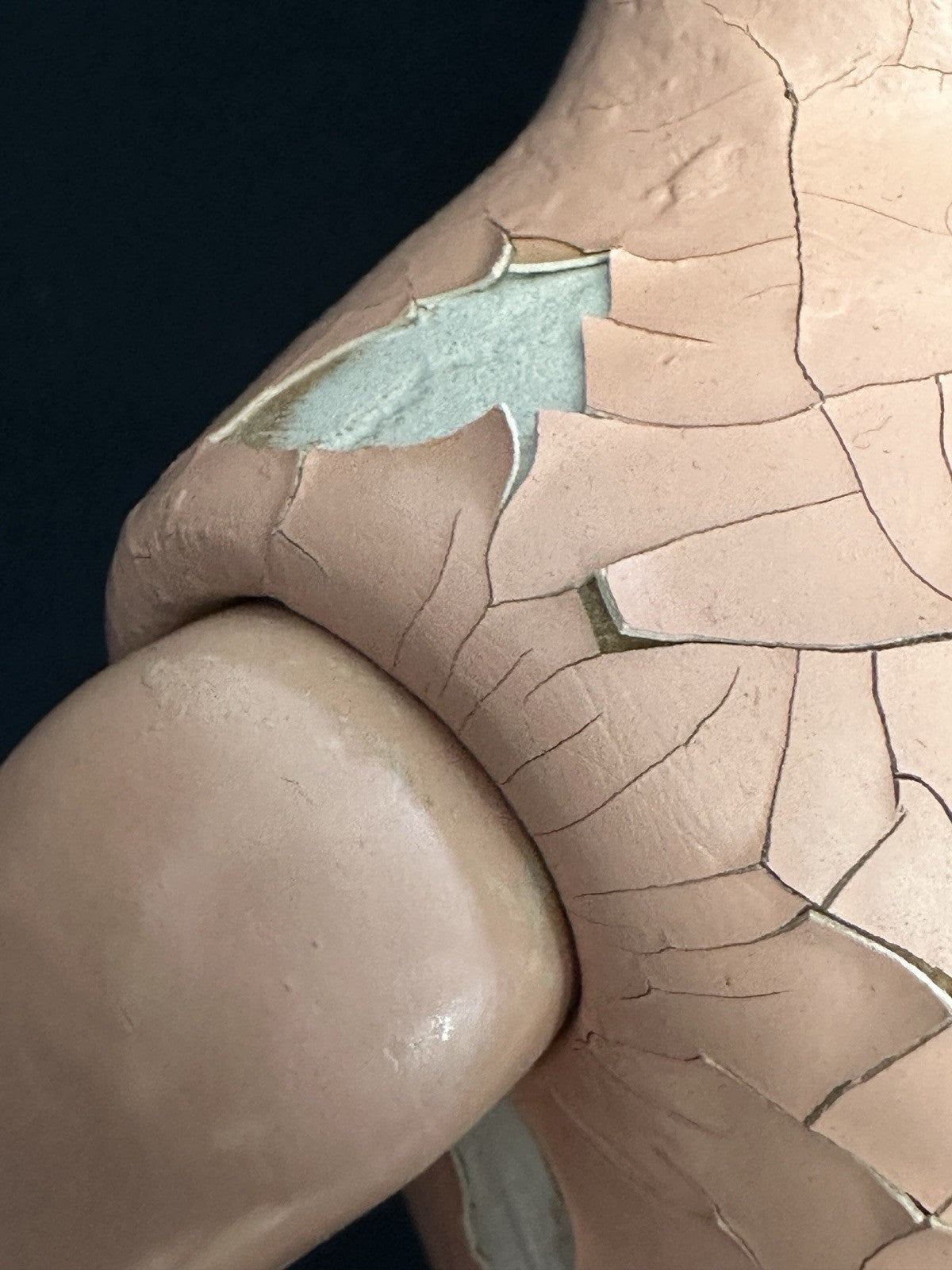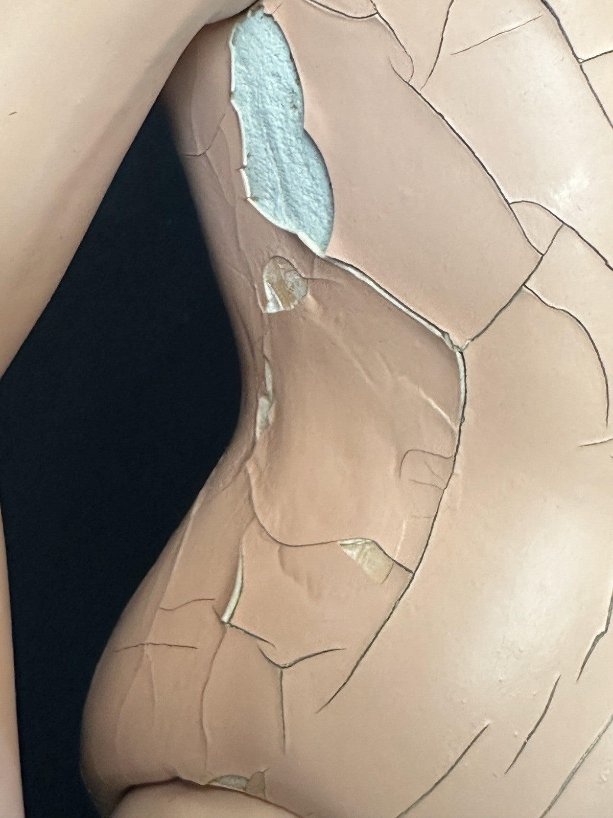 She is all composition. Measures about 20" tall. Crazings, flaking and rubbed paint are present to her face and body - see photos. Painted eyes.