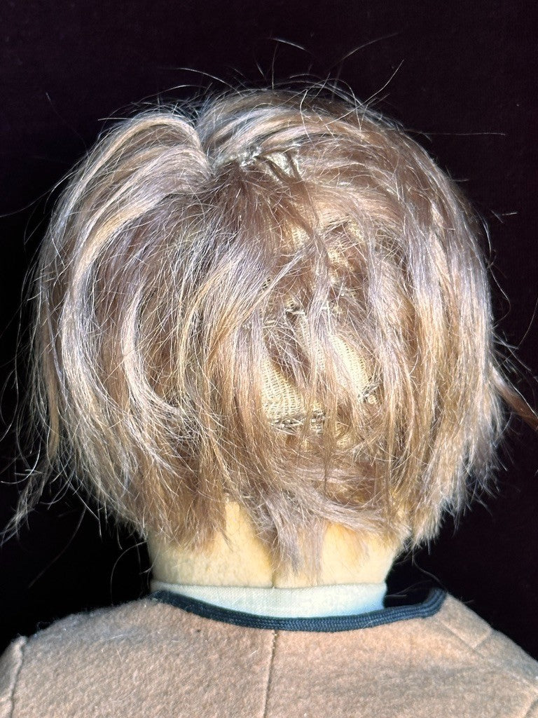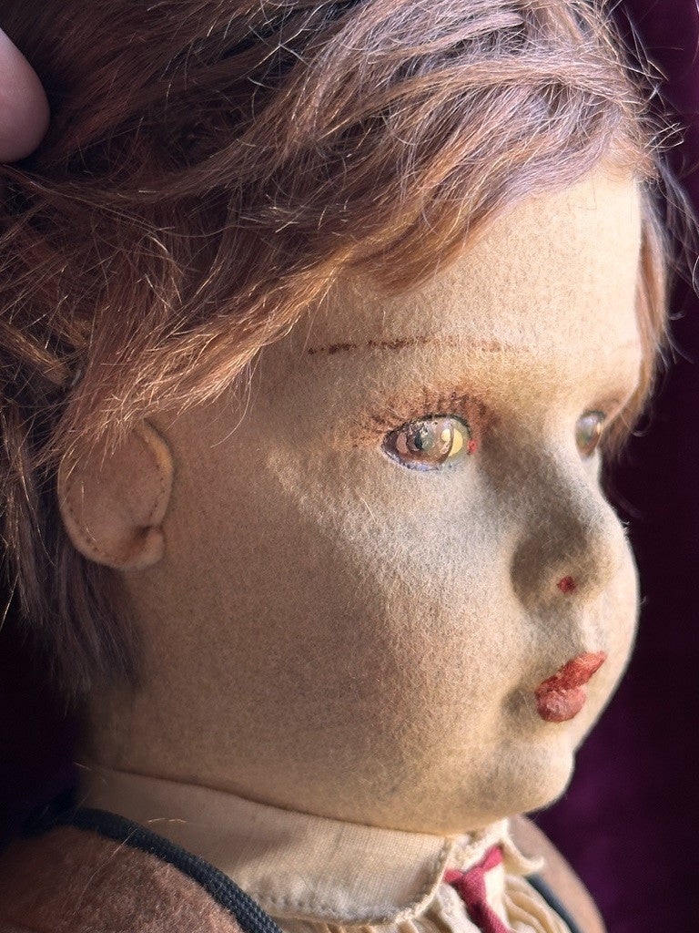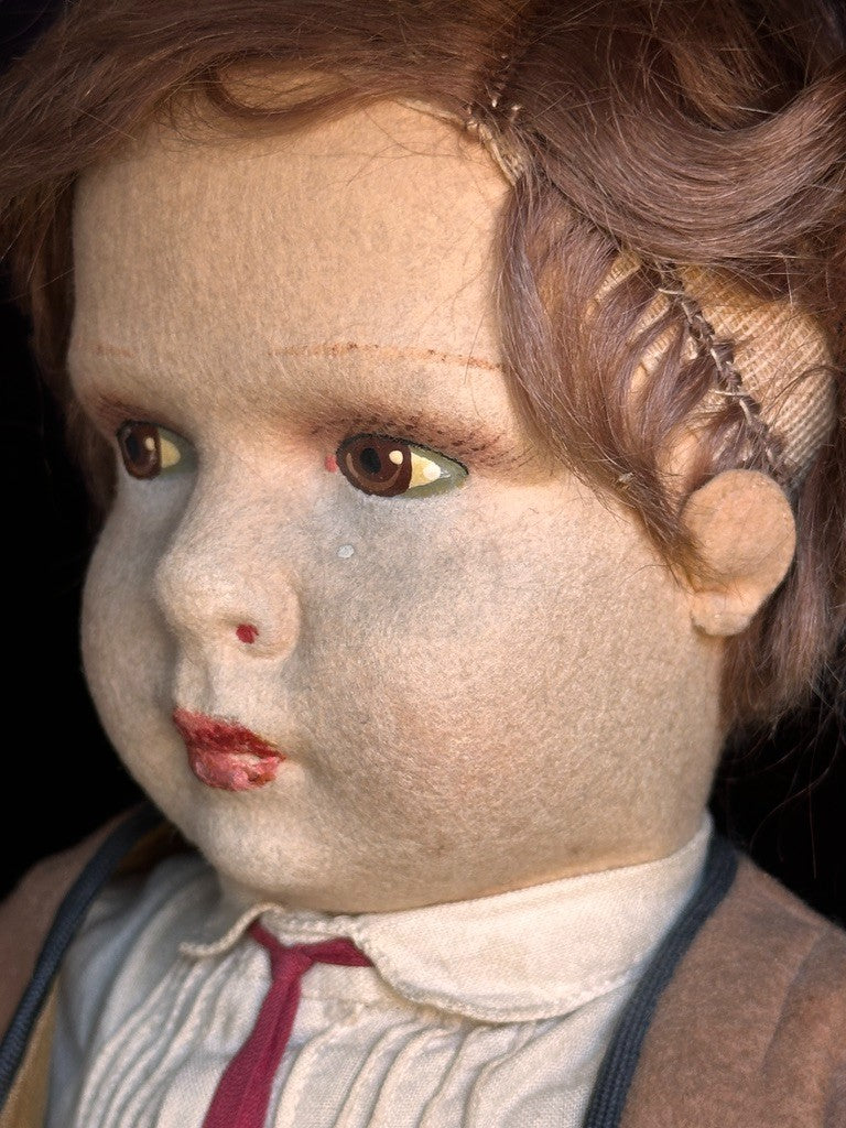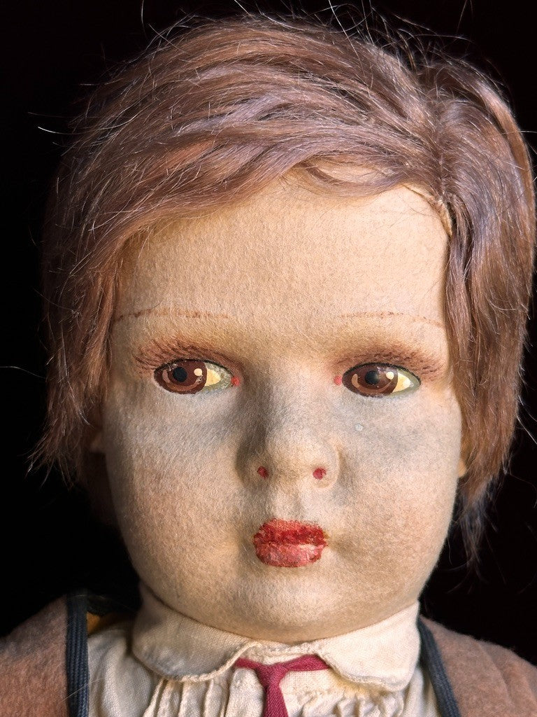 Hard to find, well-preserved original doll that resembles Lenci dolls. The 19" tall boy has paint wear to the lips that possibly also includes some paint touch-up. There is a small flaw under the left eye. Some areas of the felt are a little dusty, and the wig also shows light wear. There is a small repair to the left hand.