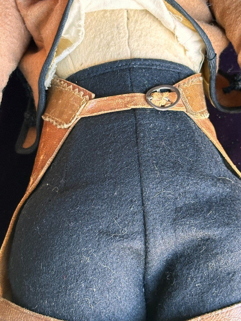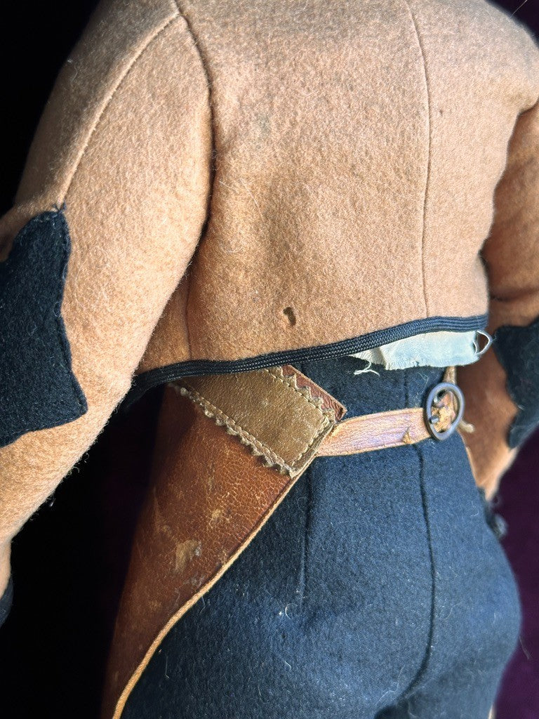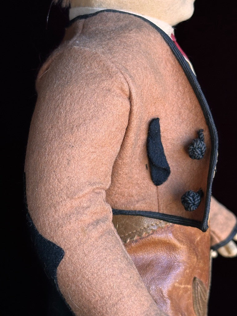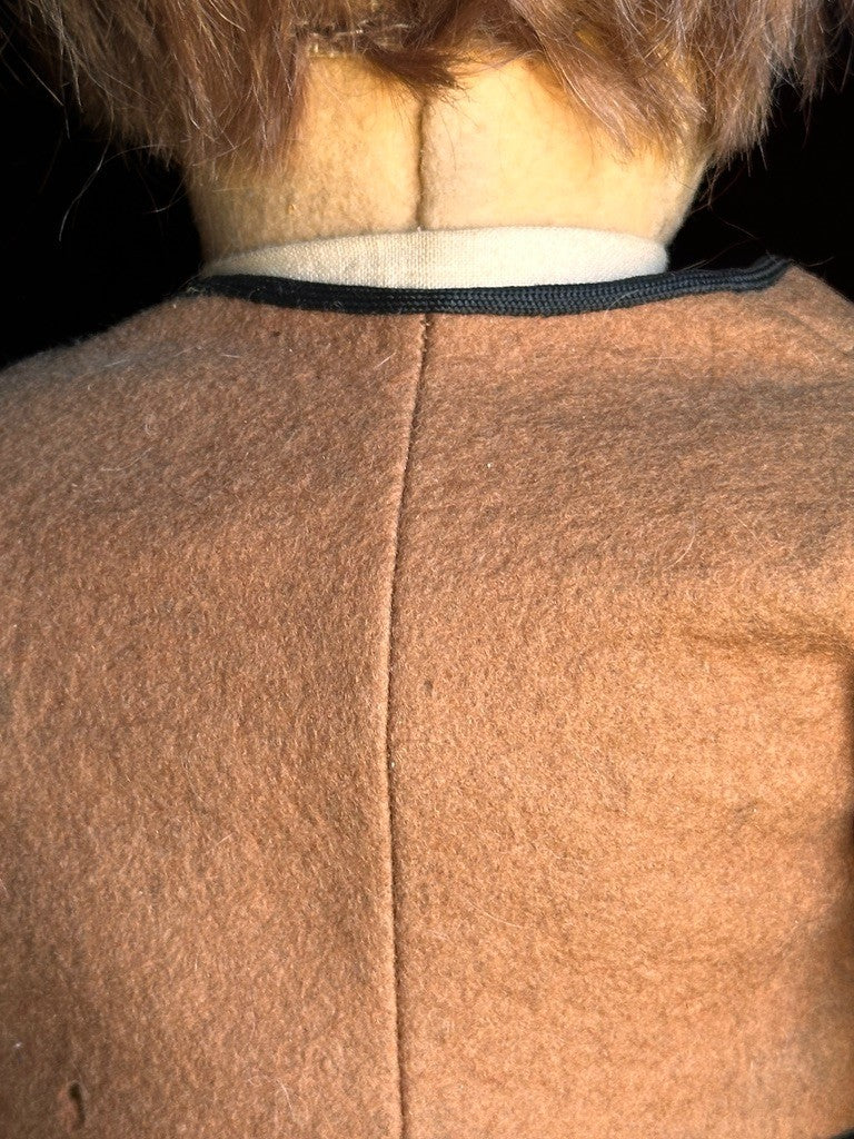 The doll is well made and is all original. His beautiful clothes show some wear, including a hole on the back of the jacket, as well as discoloration and wear to the hat, which is also original.