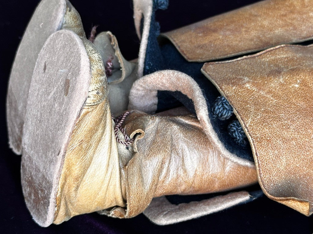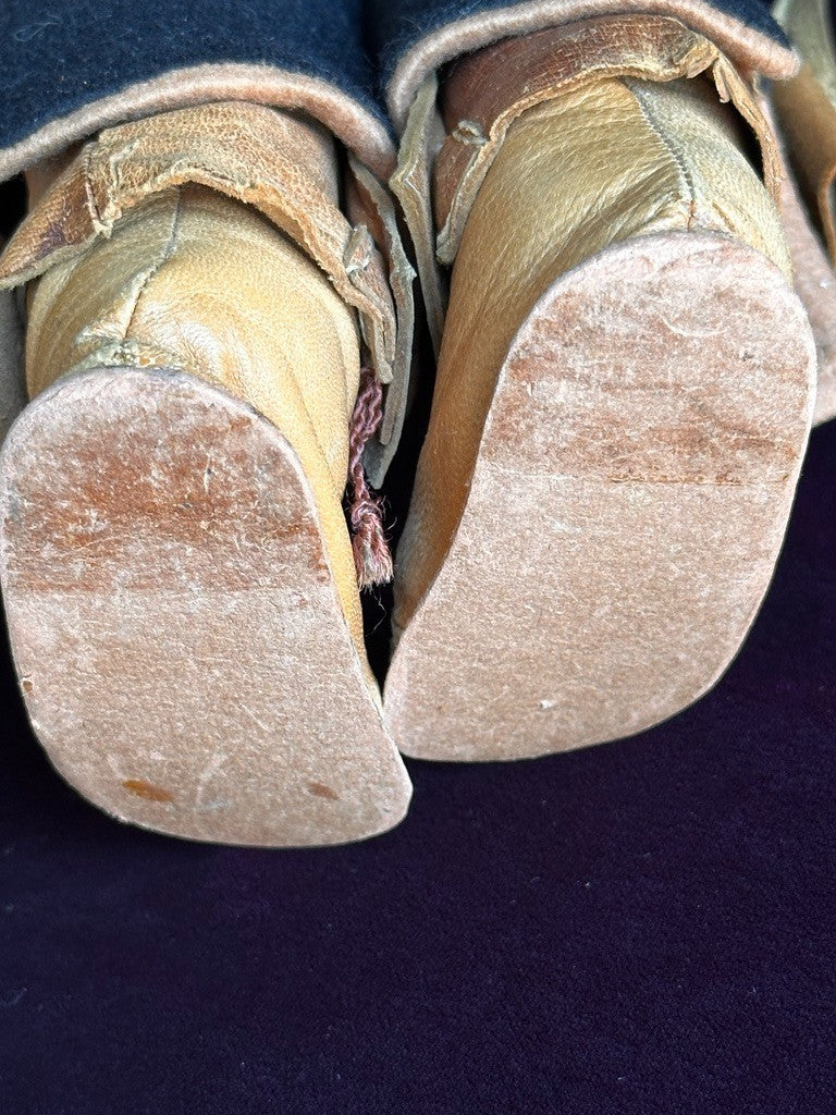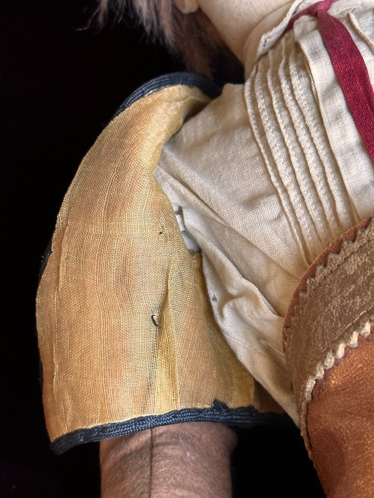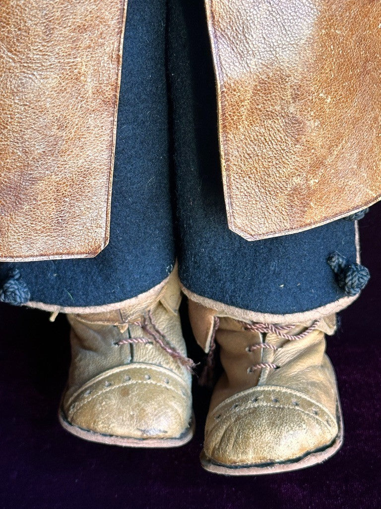 The doll is well made and is all original. His beautiful clothes show some wear, including a hole on the back of the jacket, as well as discoloration and wear to the hat, which is also original.