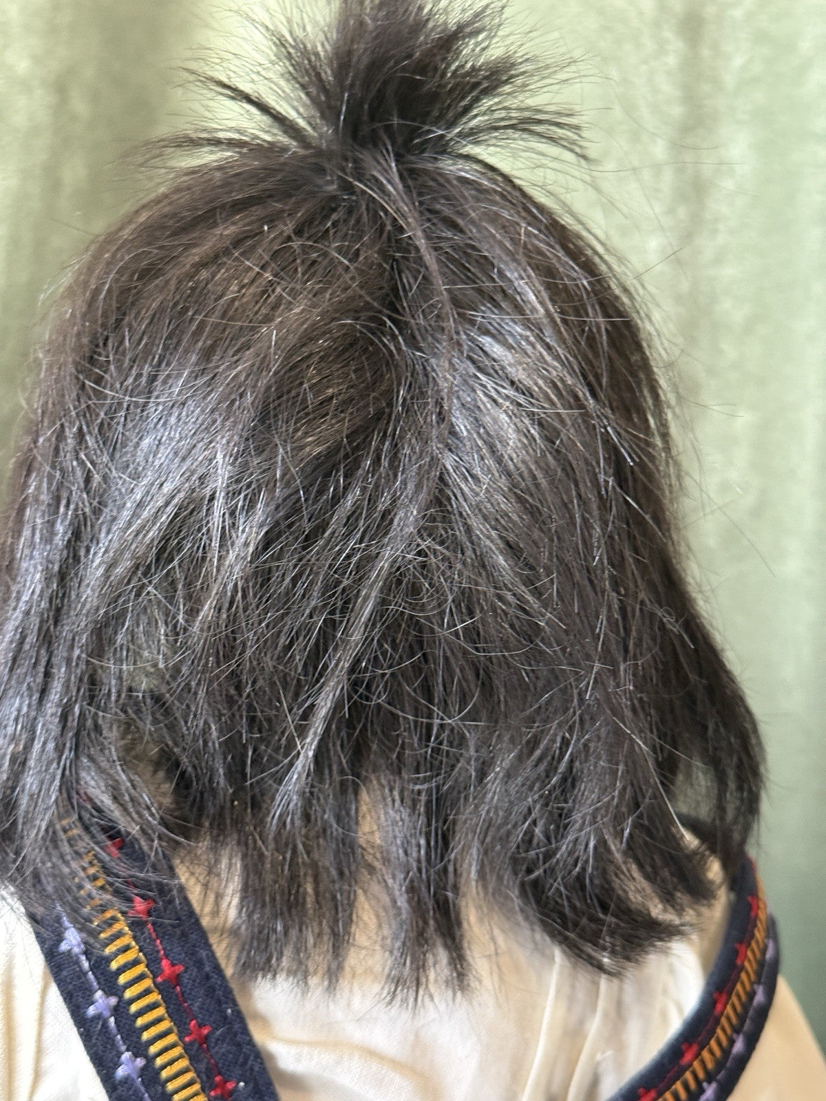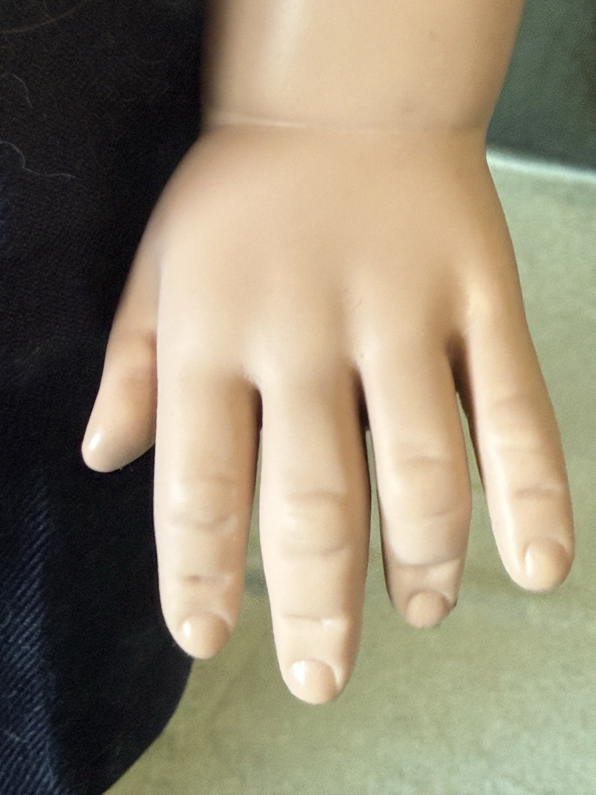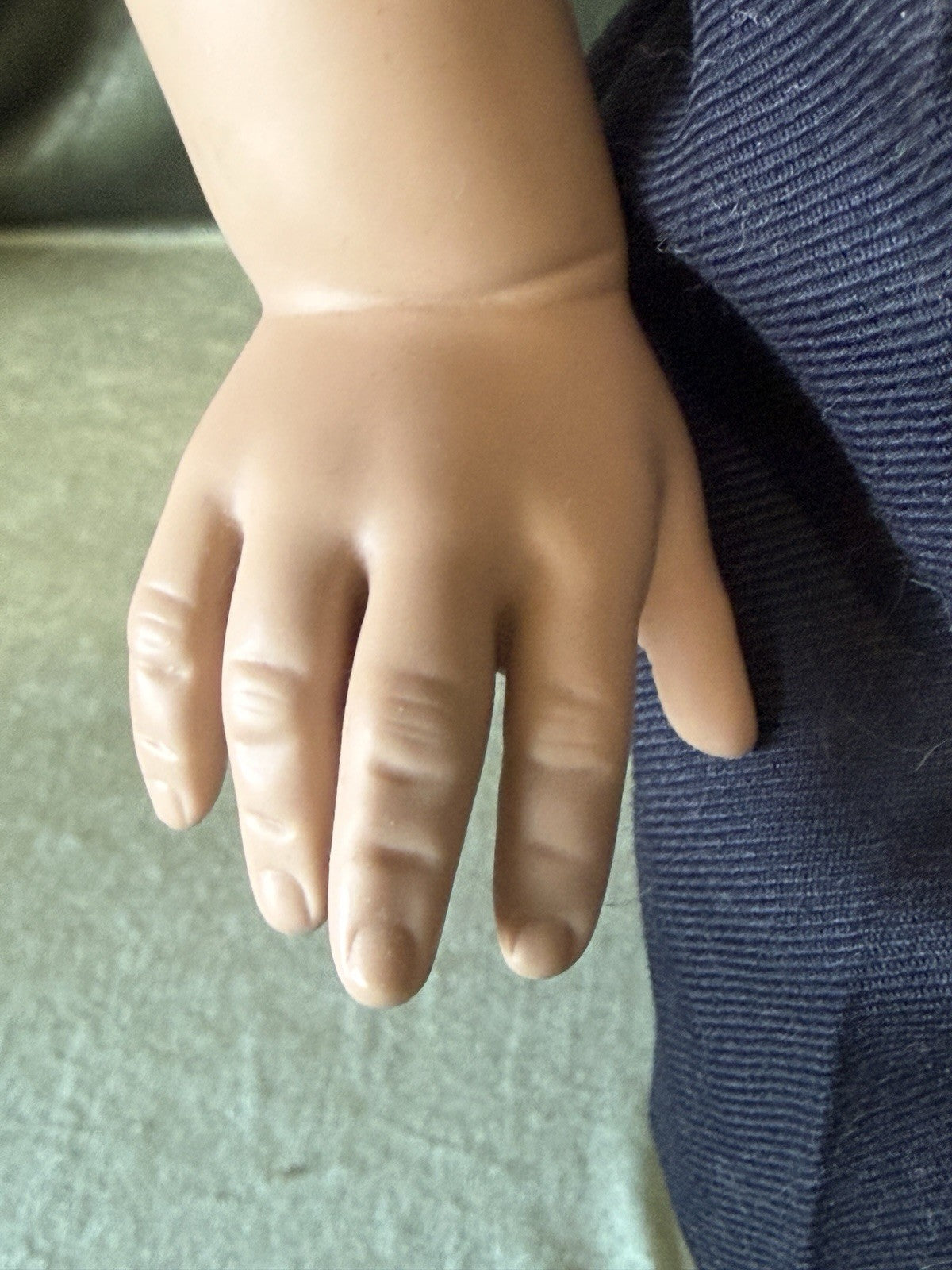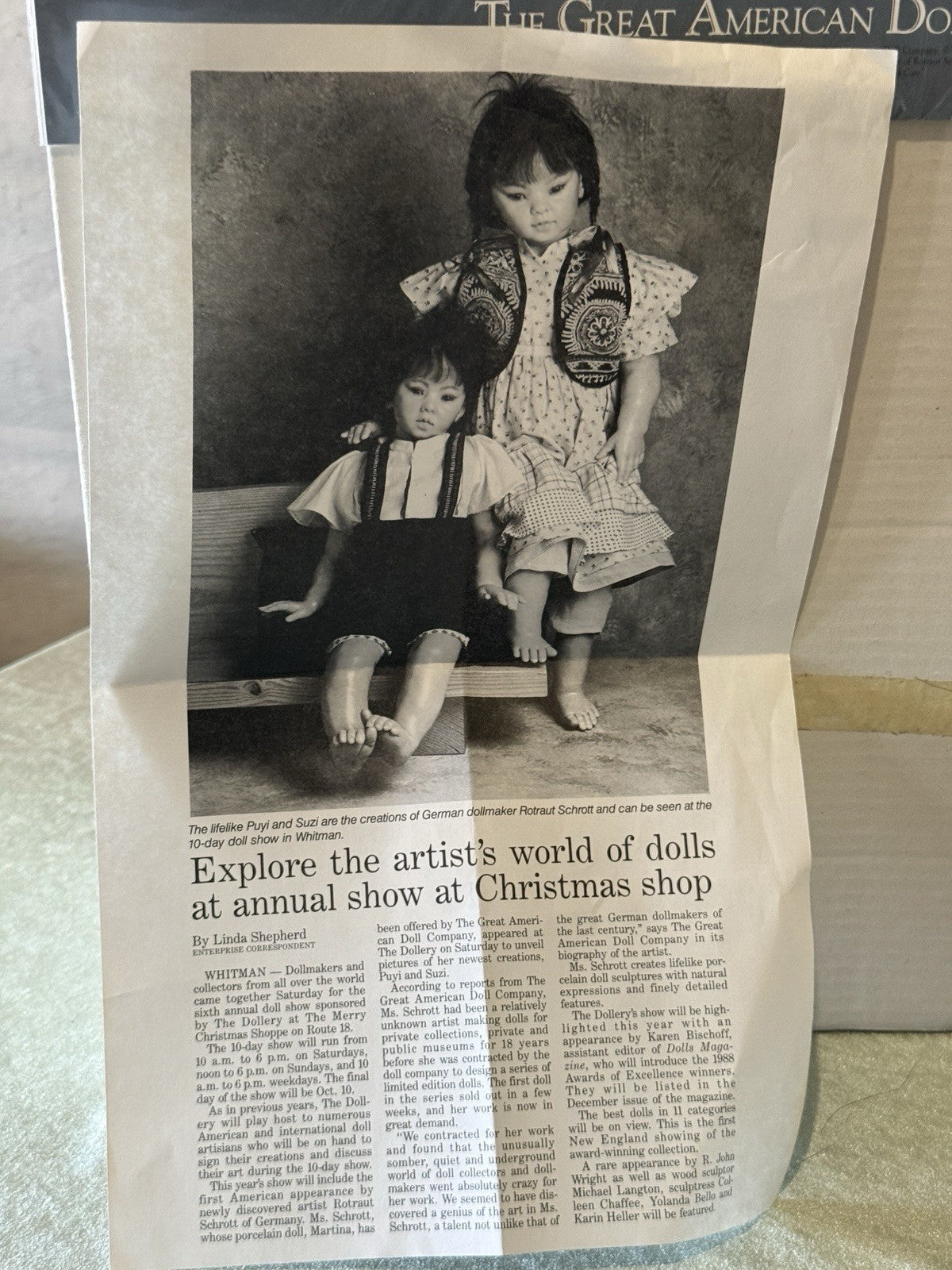 Artist/Manufacturer: Rotraut Schrott / The Great American Doll Company. Features a vinyl head, neck plate, arms, and legs with a soft cloth body. He has a black human hair wig, brown glass eyes, and is dressed in a patterned cotton calico outfit . Comes with his box (some wear and tear are present), art print. No tag or COA. Please refer to photos as they are part of the description.