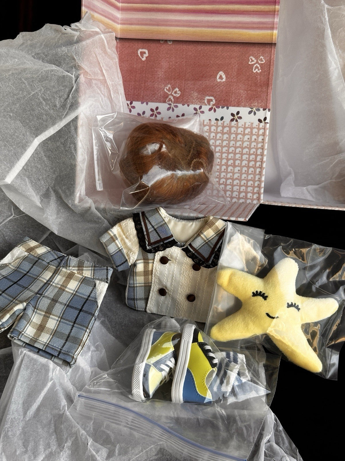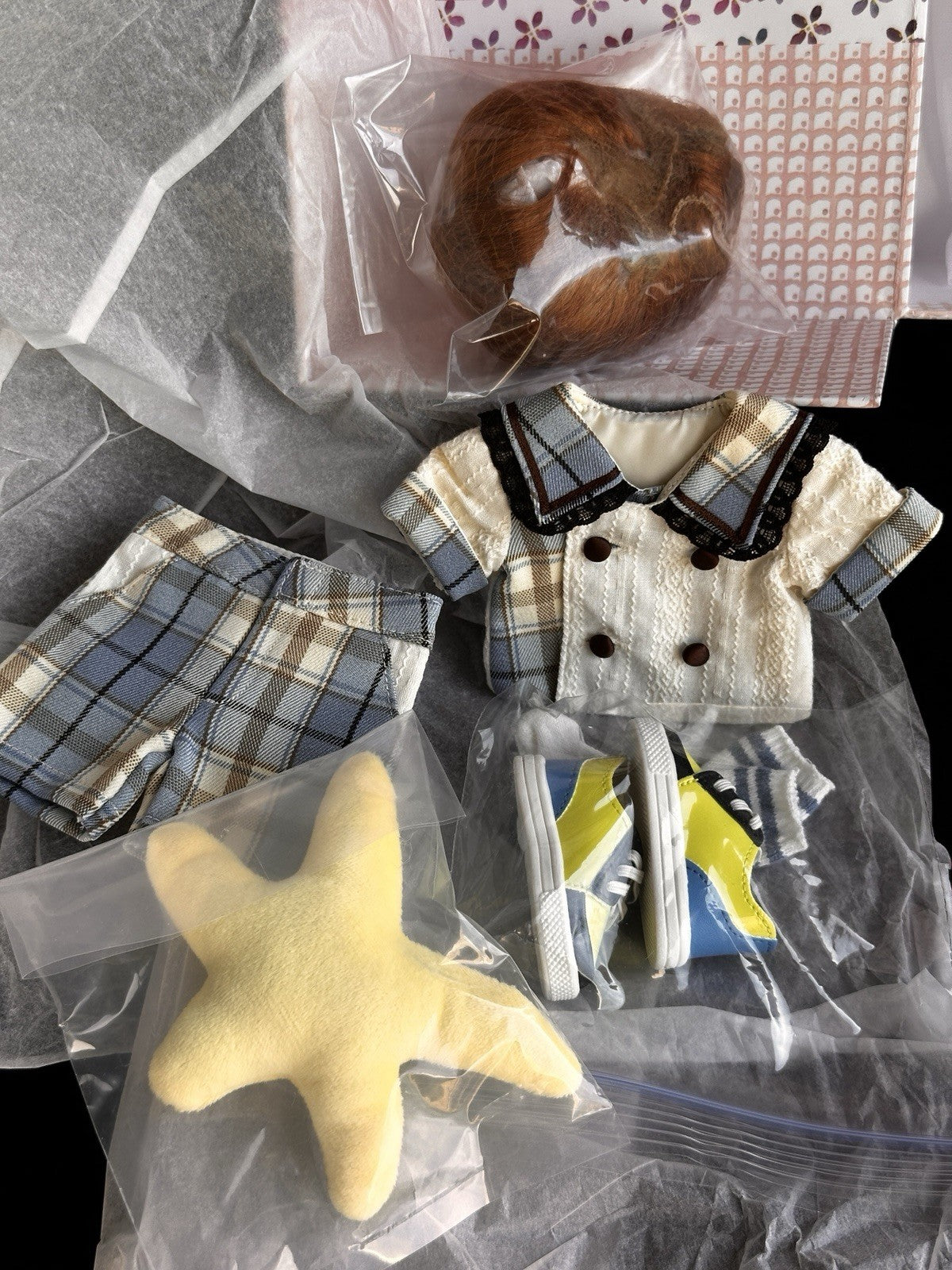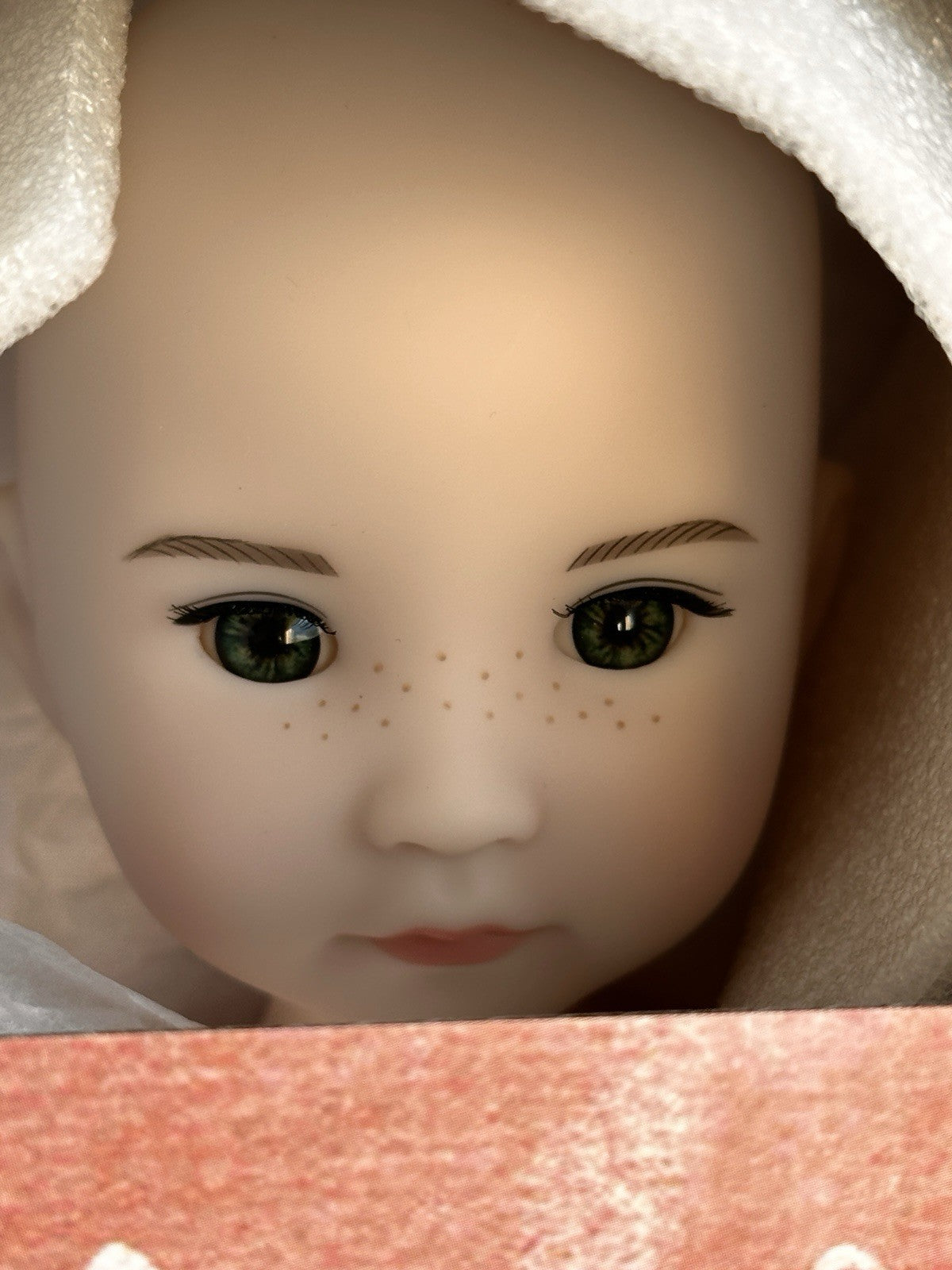 This sweet doll has beautifully painted face. She is new and is coming with wig, outfit, all the accessories and box. Everything is in new condition.