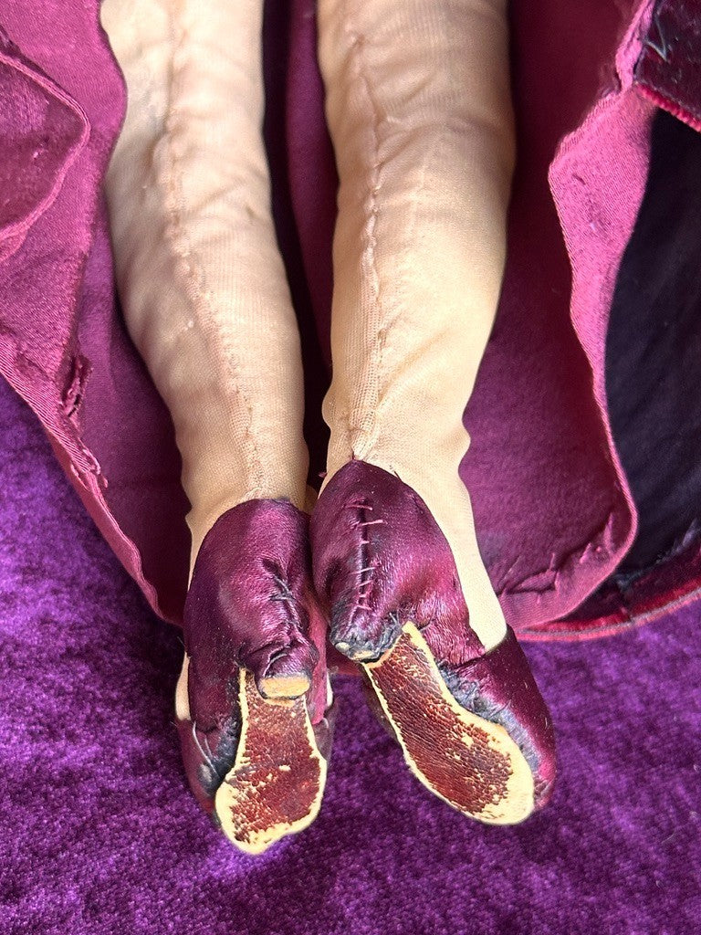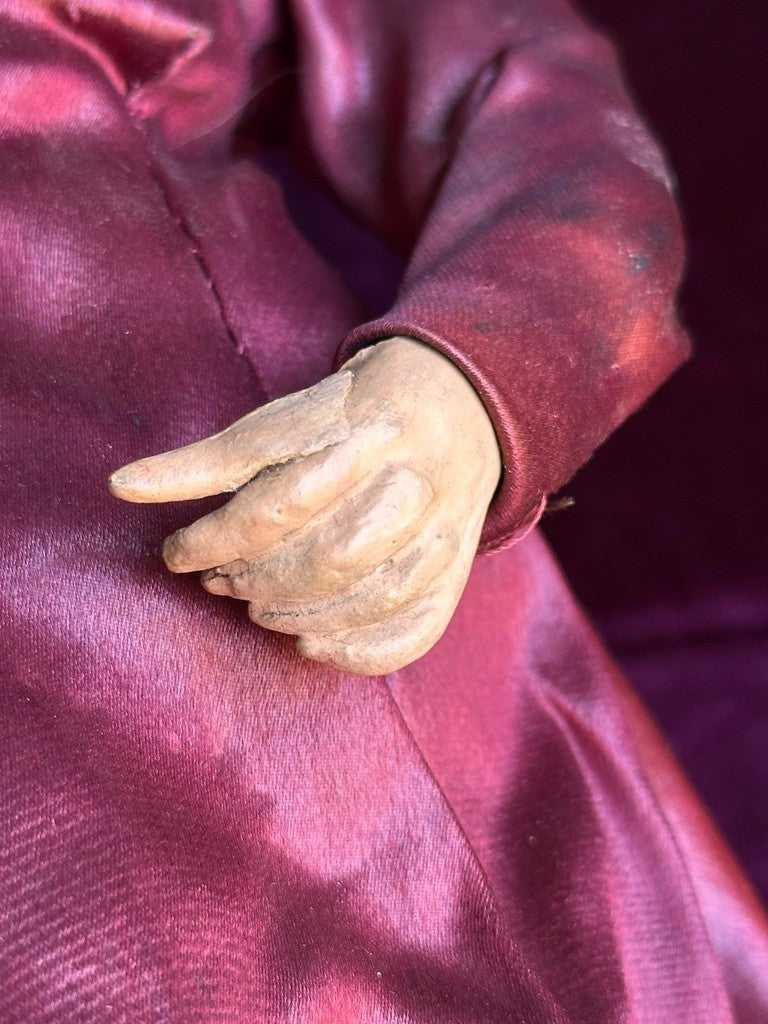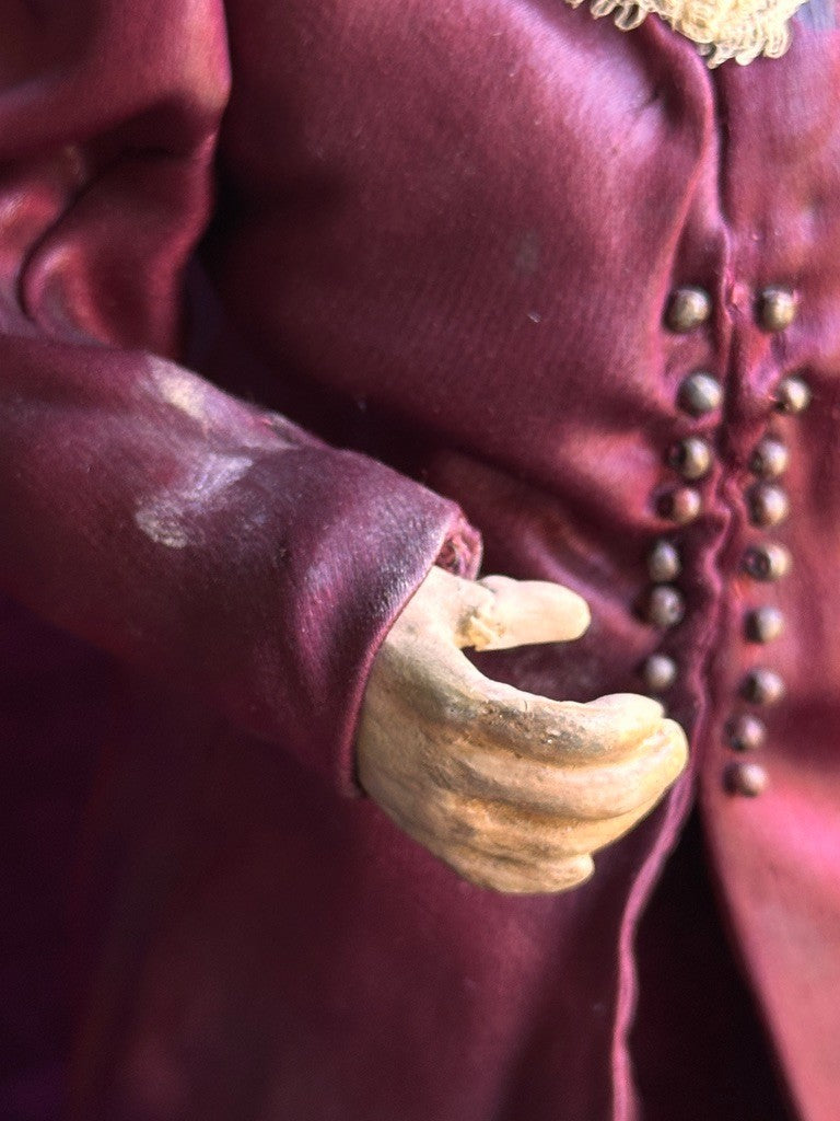 The doll is nicely preserved overall. There are some imperfections to the hands — it is unclear whether these are original to the doll, signs of age, or possible restorations. Aside from that, the doll appears to be in good condition.