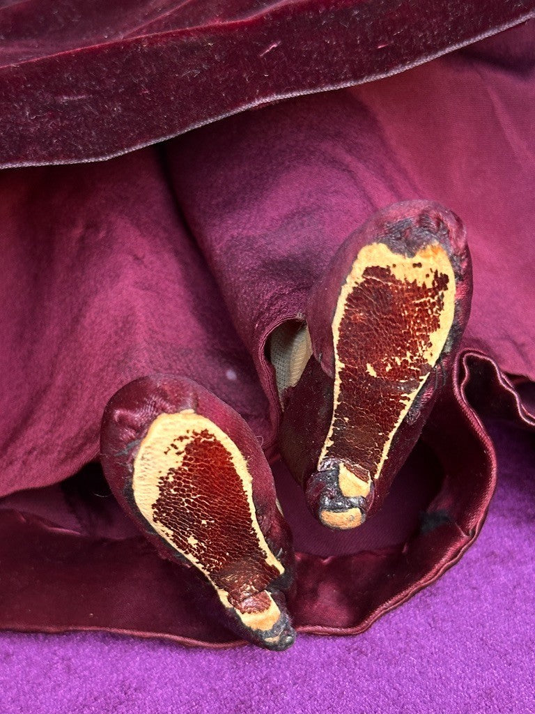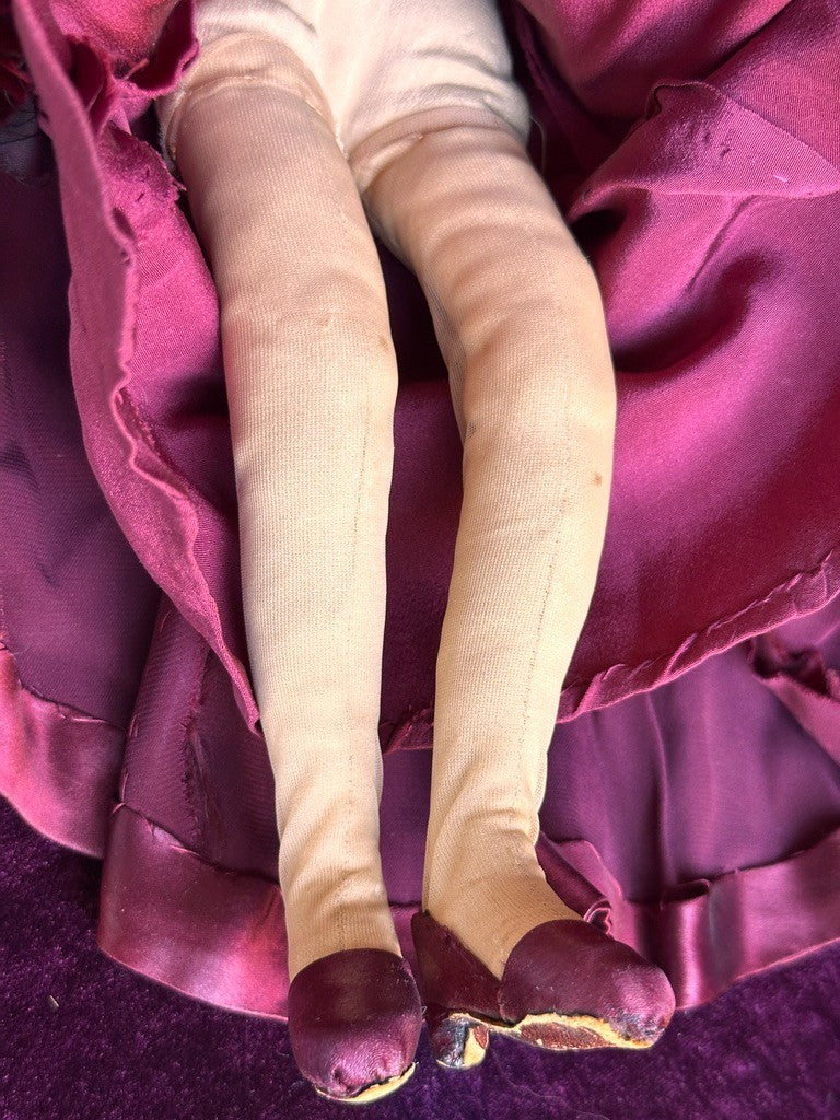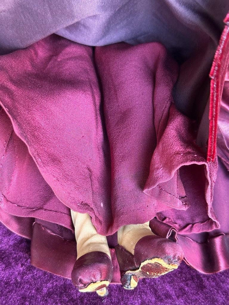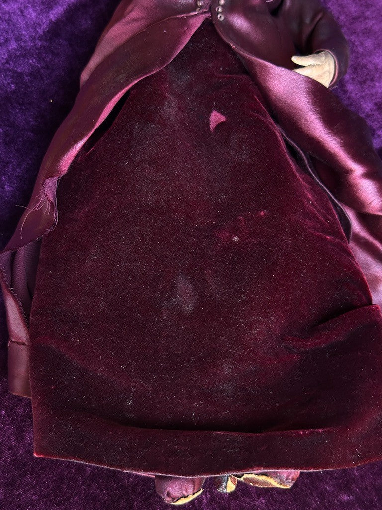She is wearing her original clothing, which shows some wear and light soiling from age, but remains in displayable condition. All imperfections to the clothes are shown in the photos.