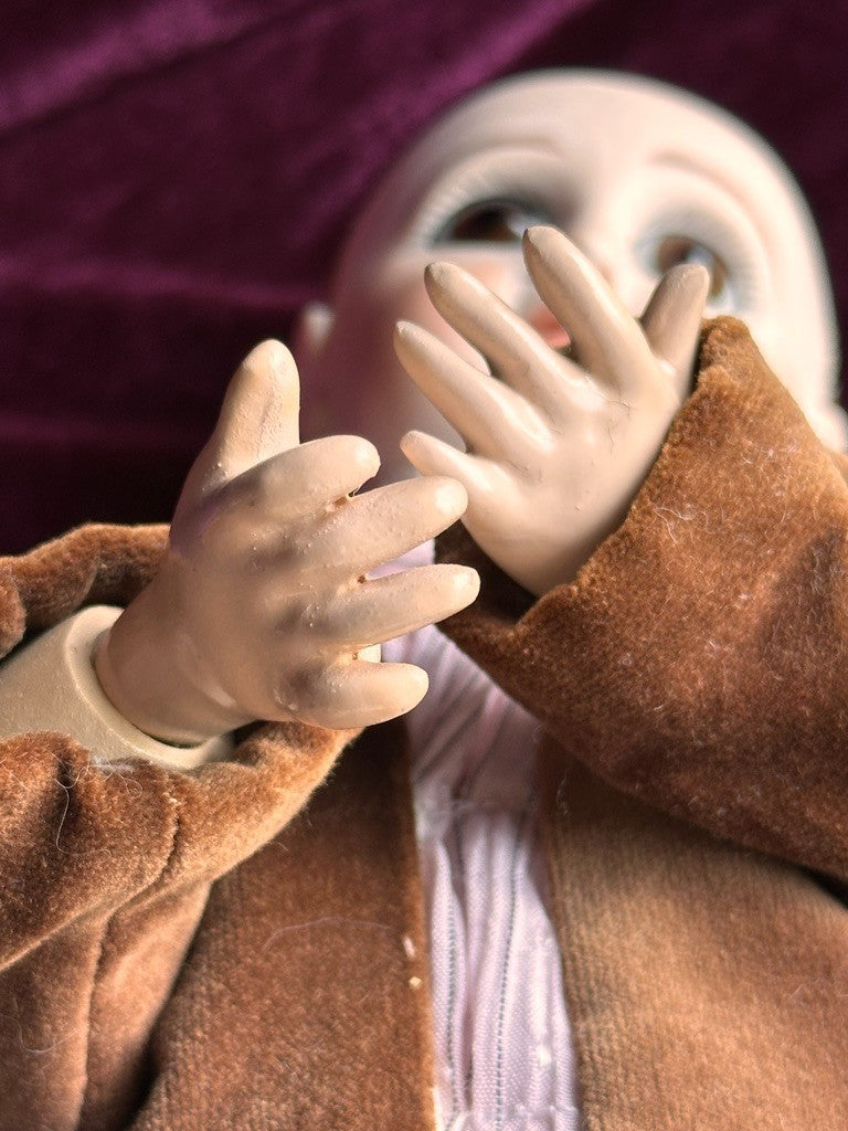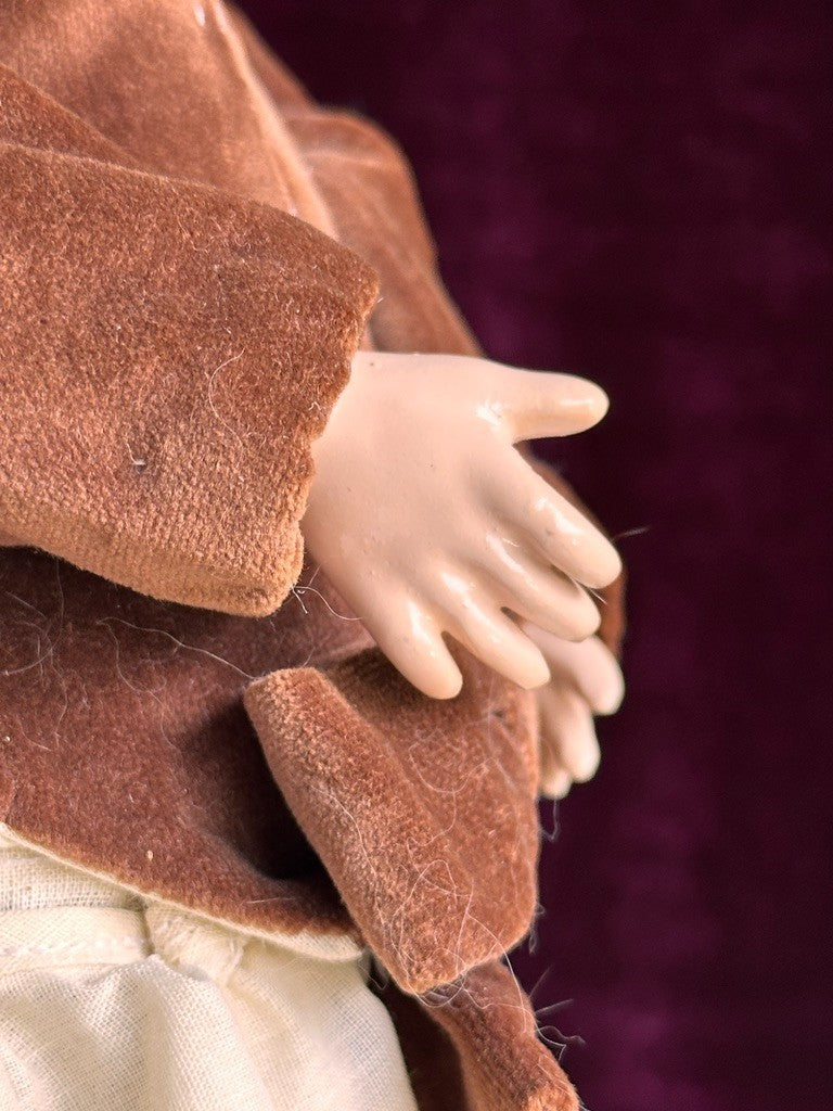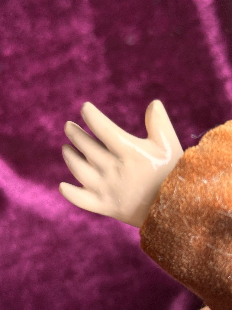 The doll is in great condition with no damage. There is light wear to the hands, which appear slightly different. The doll has good stringing and poses well.