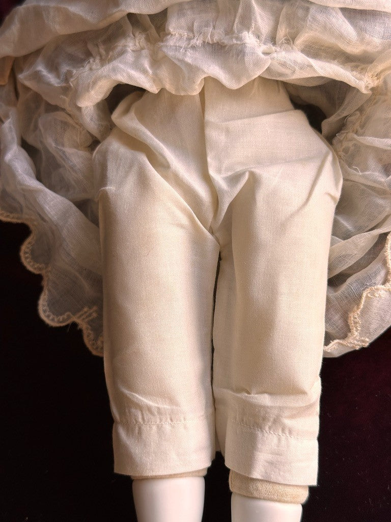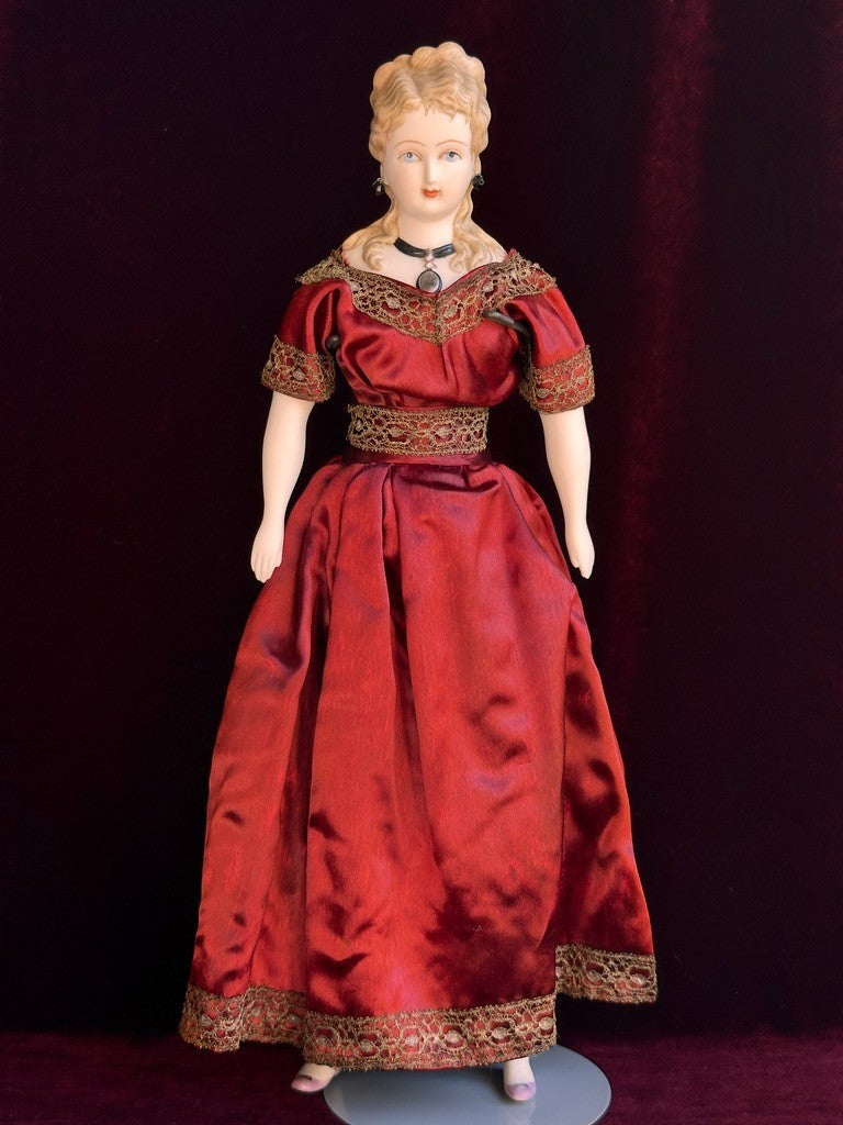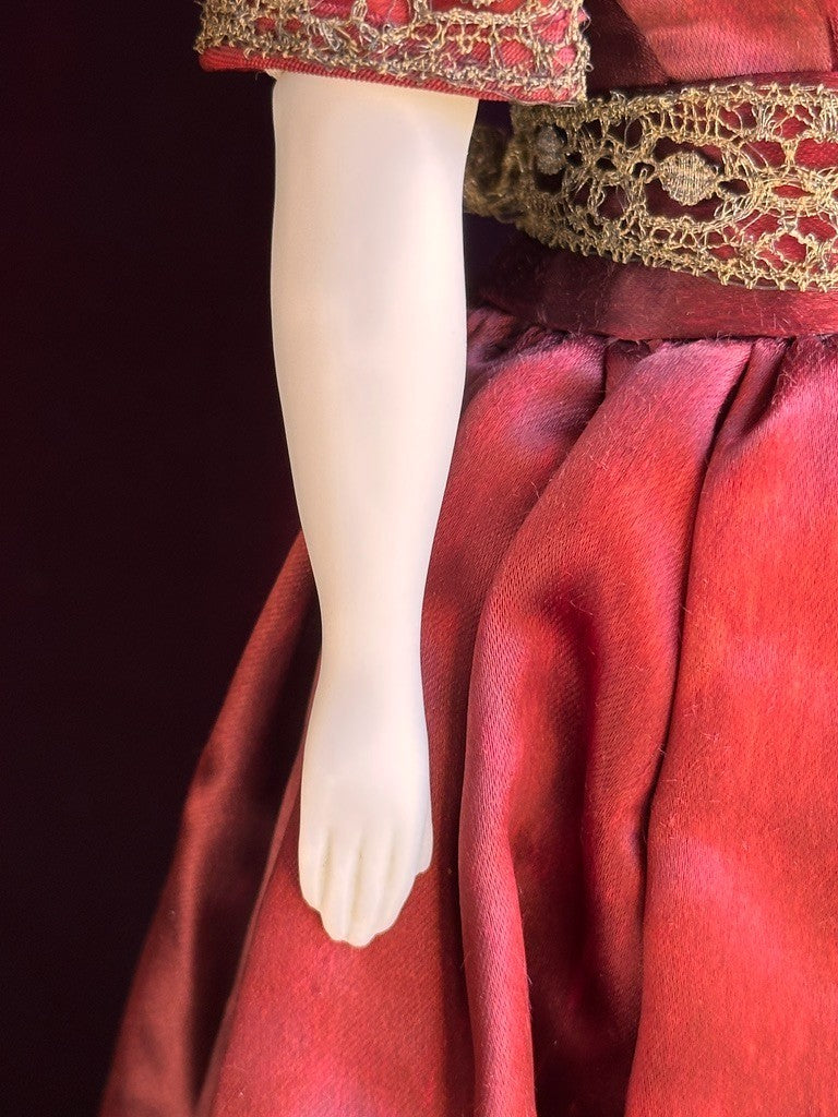 Very interesting doll with an unusual mold, possibly an original artist mold rather than a German reproduction. The doll is well made, beautifully painted, and elegantly styled.