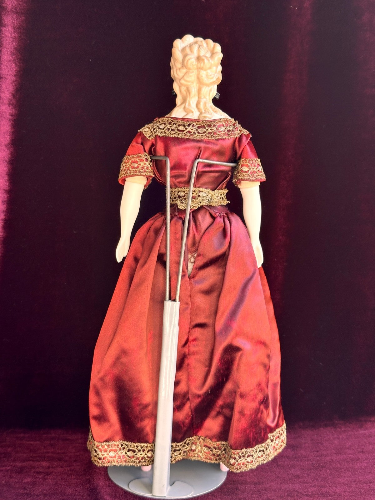 She comes dressed as shown in the photos. The outfit shows some discoloration and light staining from age.