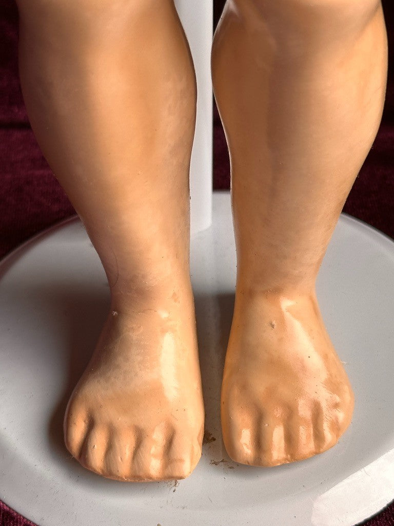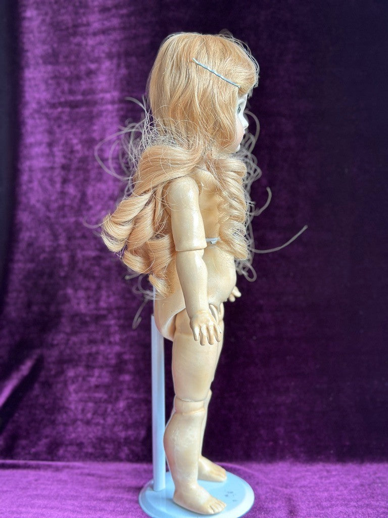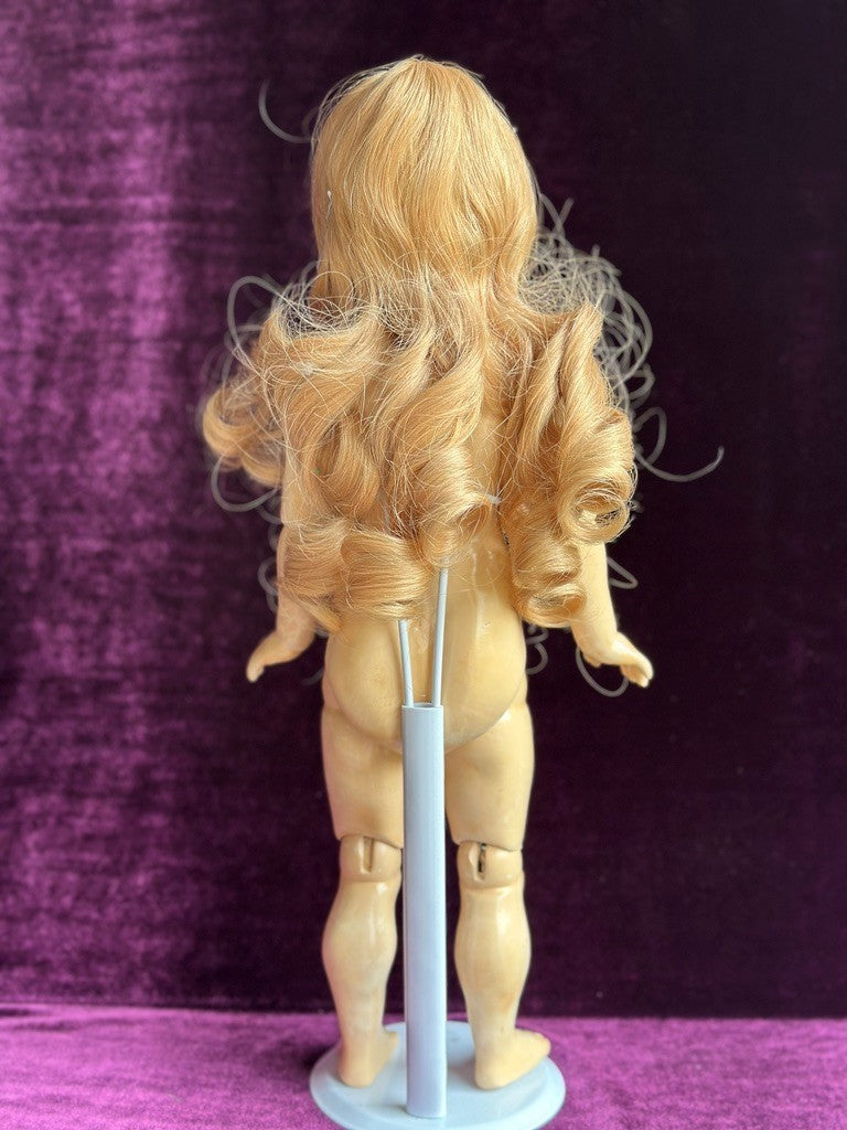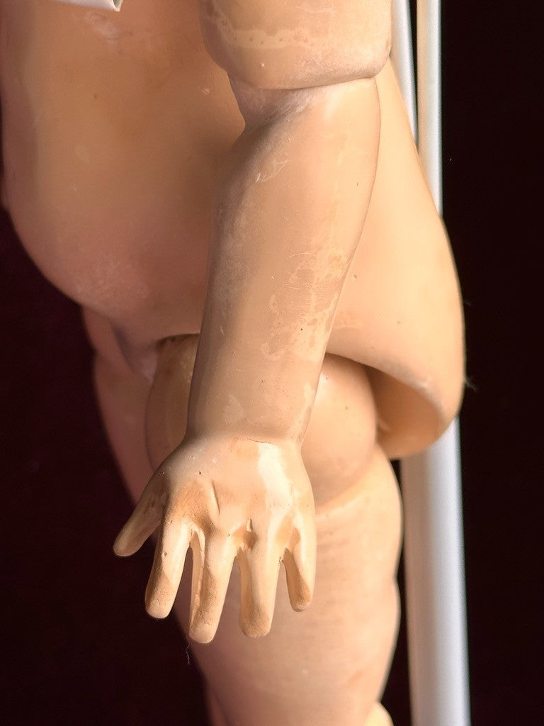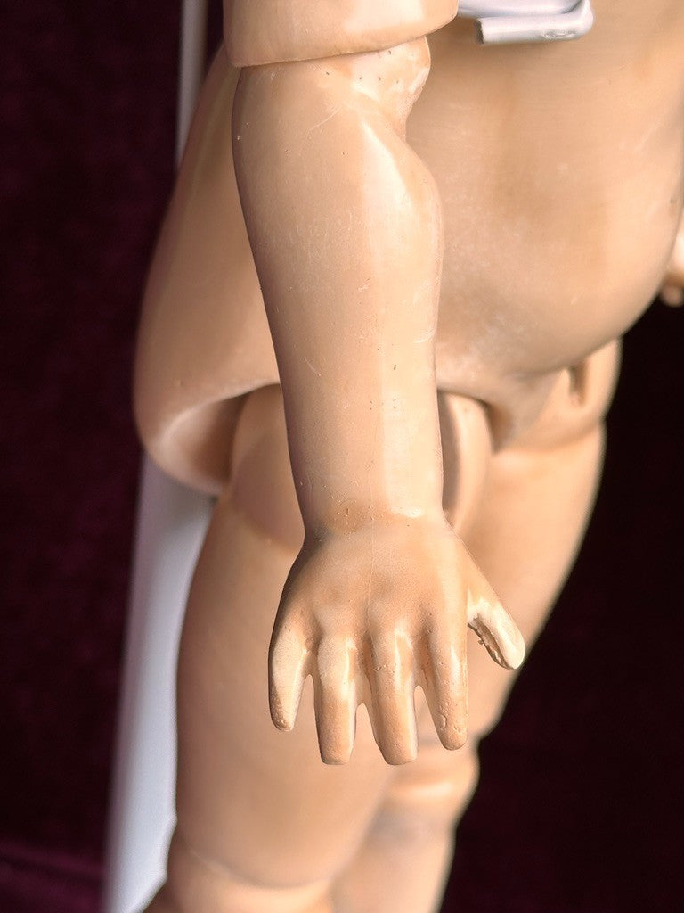 The doll has a beautiful human hair wig. The composition body shows wear, mostly to the paint, along with a few other small imperfections from age and handling. There is no structural damage to the body. The doll has good stringing and poses well.