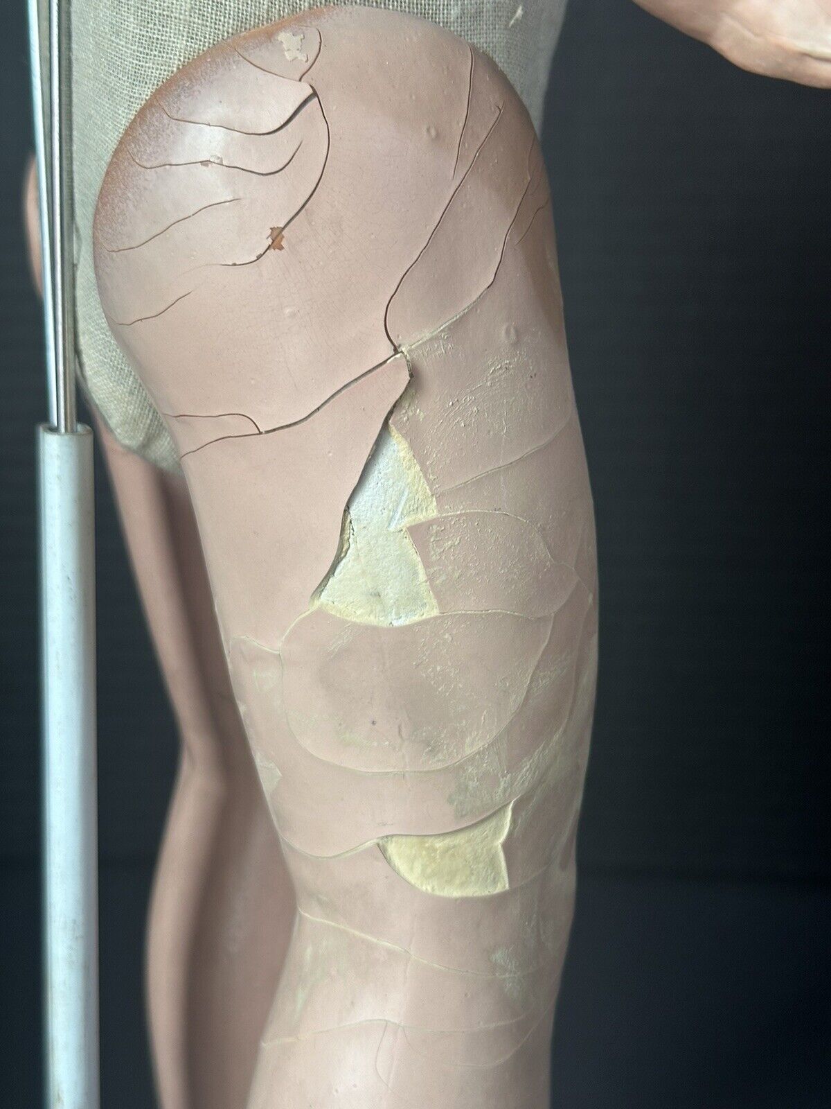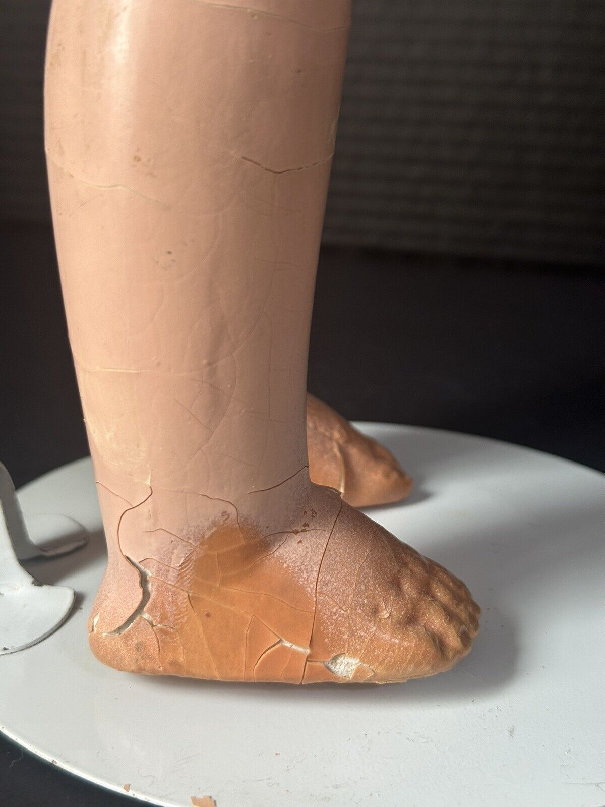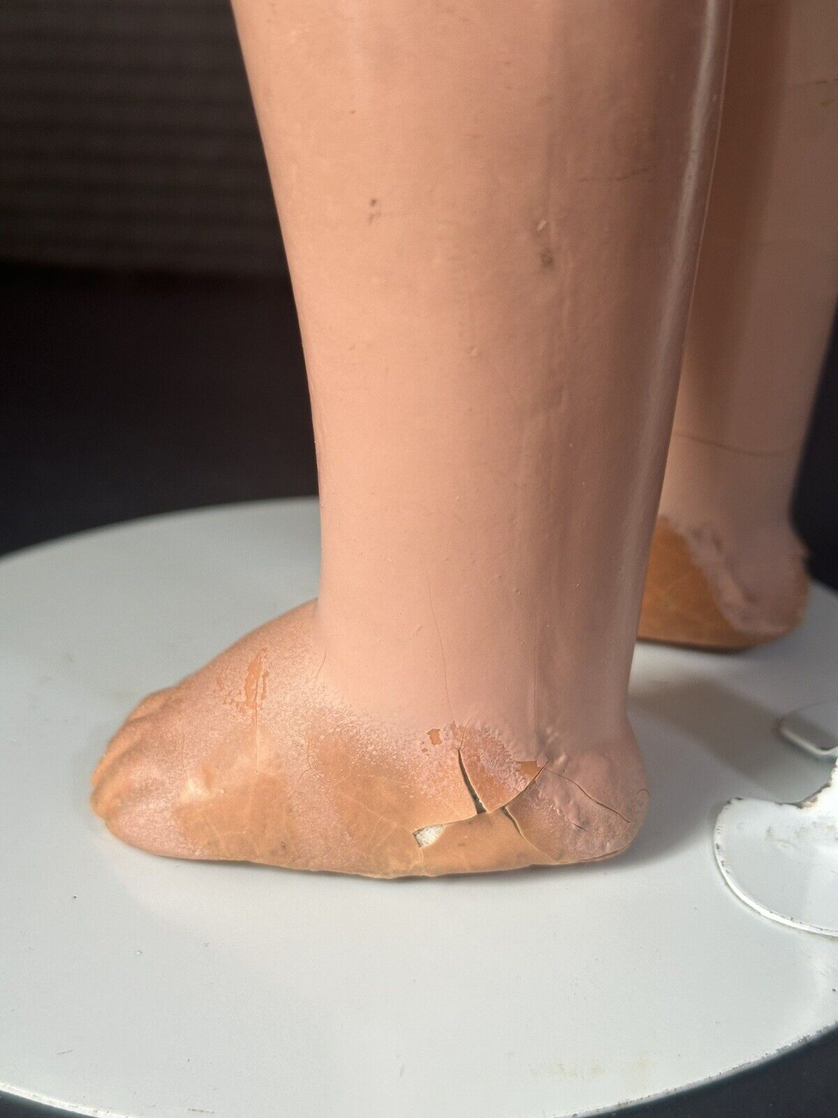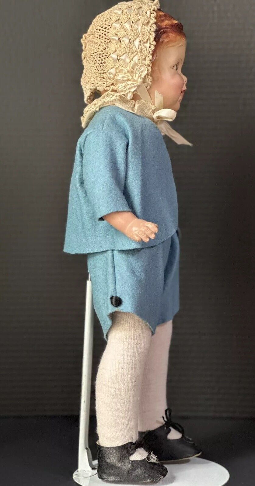 Cute original doll by Regal Doll Company. The doll is marked on the back of her shoulder plate. The head with shoulder plate, partial arms and partial legs are composition and the rest of the doll is stuffed cloth. Sleepy tin eyes. The composition parts have some flaking and crazing. Cute vintage outfit. Shorts are a little bit too big at the waistline. Some stains and holes are present to her outfit. Stand is not included